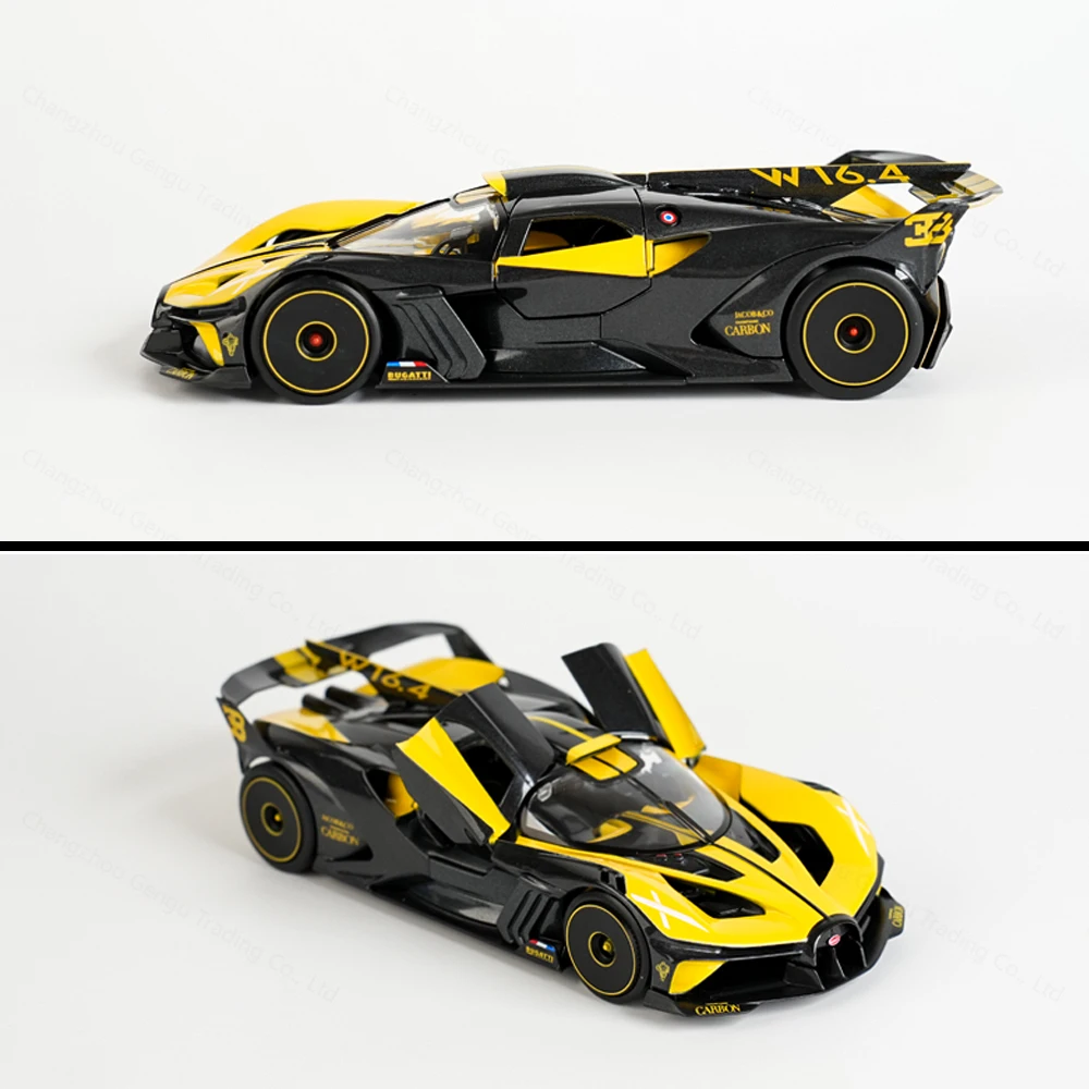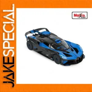 - Technical specifications include high-precision craftsmanship with a glossy blue exterior, contrasting black and red accents, and a detailed aerodynamic body inspired by the original Bugatti Bolide race car.