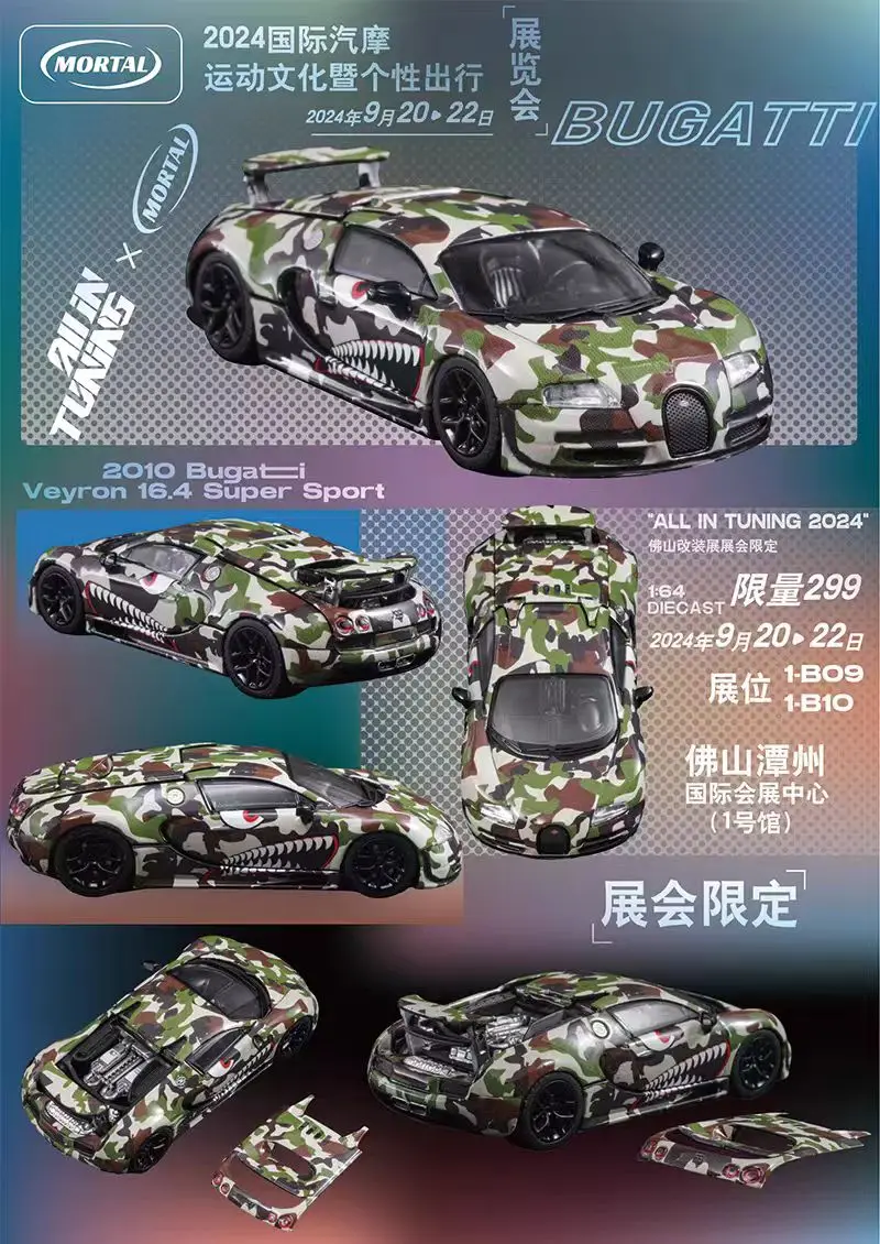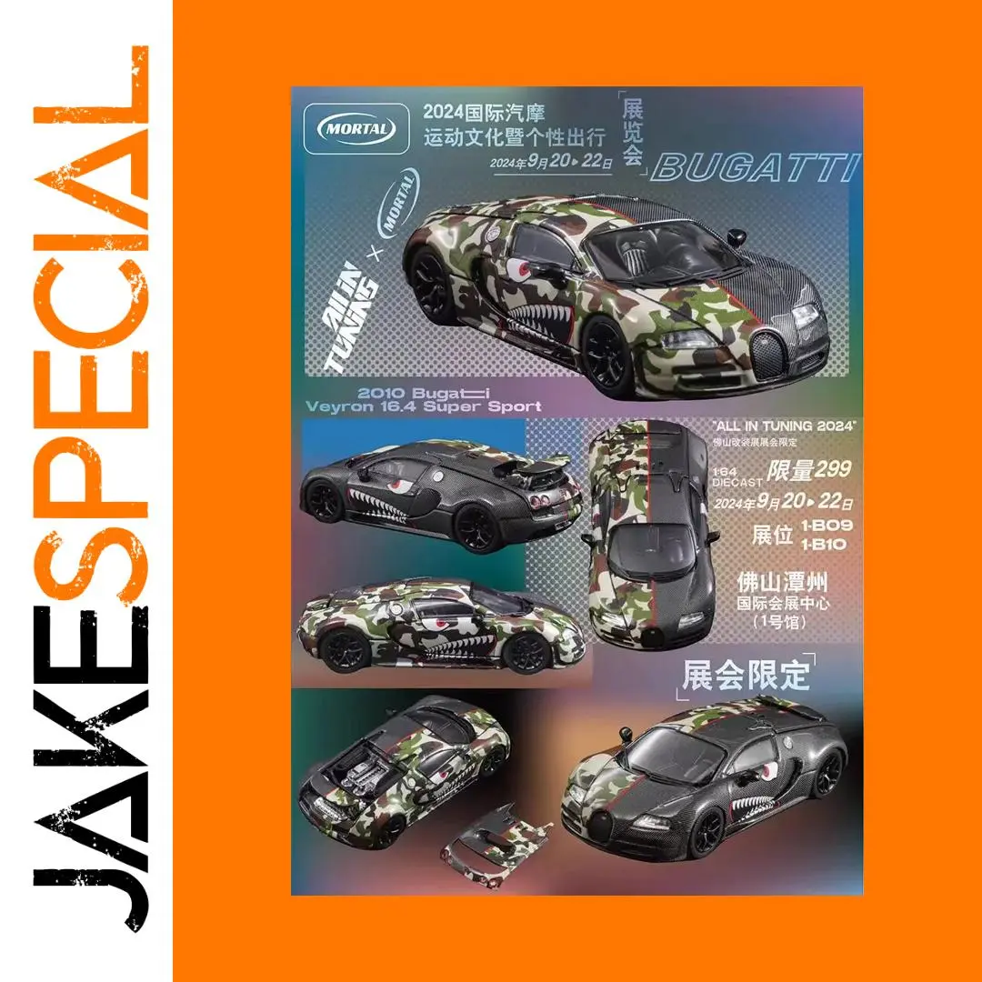 Experience the thrill of owning a highly detailed 1:64 scale diecast alloy model of the iconic Bugatti Veyron 16.4 Super Sport. This meticulously crafted miniature captures the essence of high-performance engineering with artistic precision. Its striking camouflage pattern in shades of green, beige, brown, and white, combined with sleek black carbon fiber accents on the hood, roof, and rear, creates a rugged yet sporty aesthetic. The aggressive front grille, angular headlights, and fierce shark-mouth graphic with a red tongue add to its bold character. Black multi-spoke rims and low-profile tires enhance its dynamic look, while the tinted windows and aerodynamic rear wing spoiler improve its sporty appeal. Perfect for collectors and enthusiasts alike.
