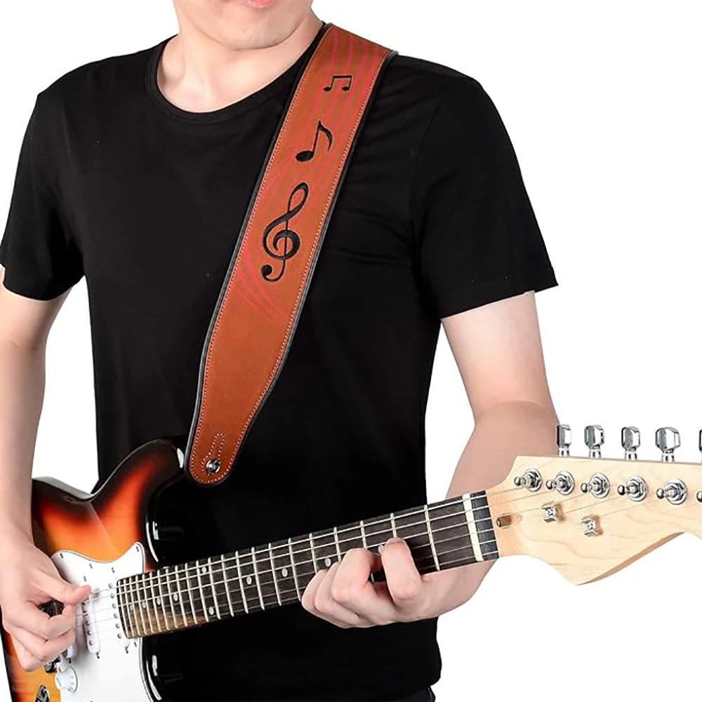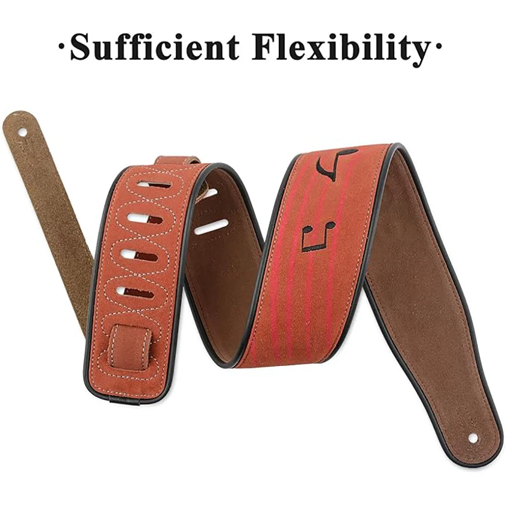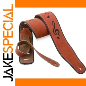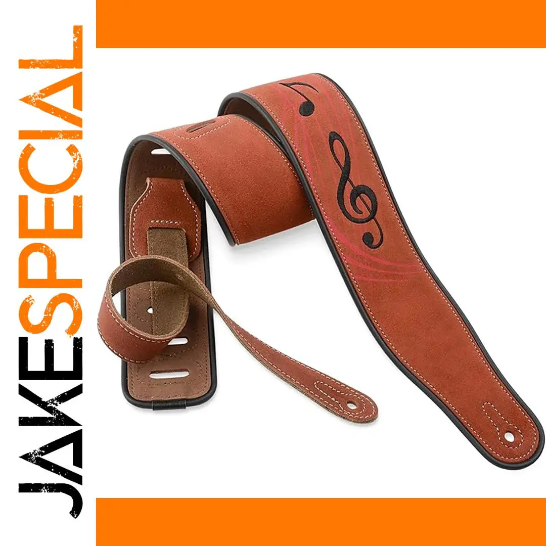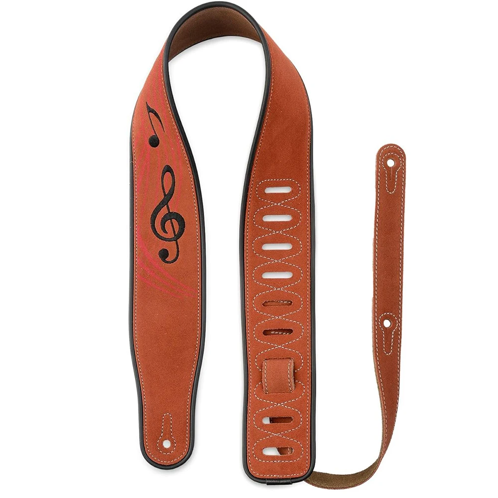 Experience a perfect blend of elegance and functionality with this high-quality leather guitar strap. Crafted from soft, durable suede leather, it offers comfortable support during long performances and rehearsals. The strap is 2.8″ wide, ensuring excellent weight distribution across your shoulder, reducing fatigue. Its vibrant burnt-orange color is complemented by sleek black piping along the edges, adding a striking contrast that enhances its artistic design. A prominent black treble clef motif runs along its length, embroidered or printed to reflect your musical passion. The strap is fully adjustable from 36.6″ to 51″, fitting various guitar types including bass, electric, acoustic, resonators, banjos, and mandolins. Subtle decorative stitching elevates its refined aesthetic, making it an ideal accessory for musicians who value style and reliability.
