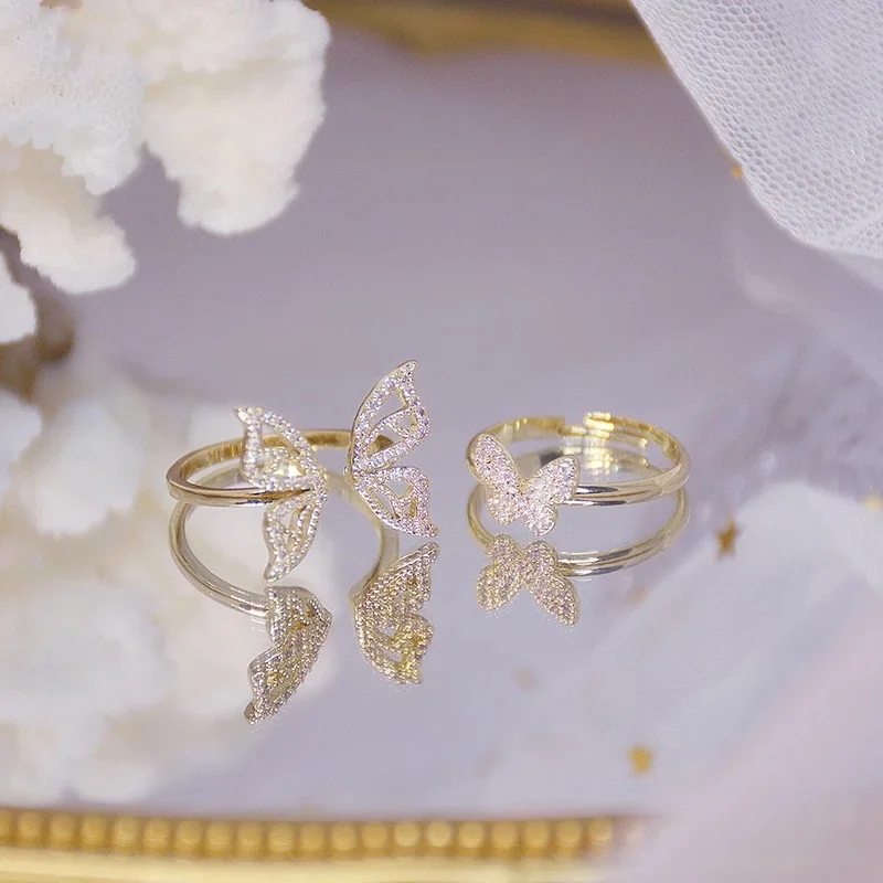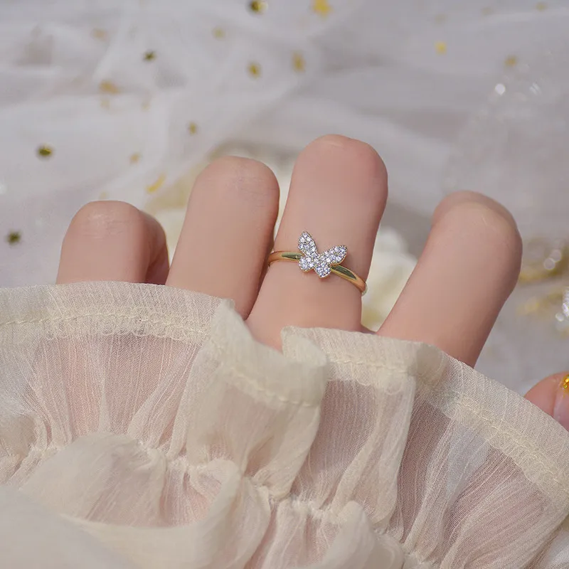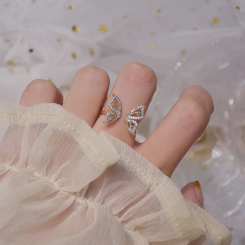 Embrace your unique fashion sense with this exquisite butterfly ring. Its sparkling design and adjustable fit make it a must-have for any sophisticated woman's jewelry collection. Feel confident and elegant, whether you're out for a special occasion or simply want to add a little sparkle to your everyday look. With its trendy and feminine aesthetic, this ring will quickly become your go-to accessory, enhancing your style and mood every time you wear it. Make it yours today and enjoy a piece that truly captures your personality and flair.