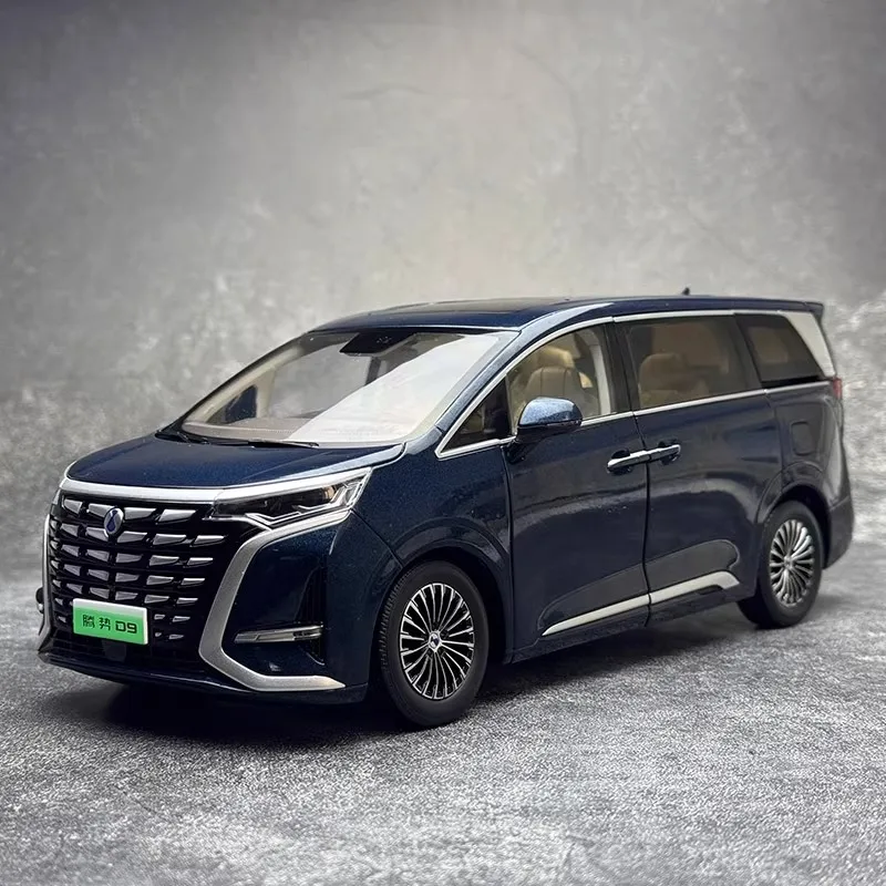 This 1:18 scale diecast model of the BYD Denza D9 MPV features a sleek, glossy navy blue finish (designated as ‘A’) and detailed exterior elements, including a prominent chrome-accented front grille, finely crafted rear lights and bumper, and side mirrors matching the vehicle’s color. The model boasts four functional doors, with front and rear covers that open to reveal an intricately designed interior and engine bay, and the front wheels turn freely for added realism. Made from durable metal, it is perfect for adult collectors, hobbies, or as a premium gift, combining realistic detailing with high-quality craftsmanship suitable for display and collection purposes.