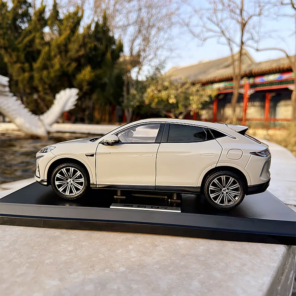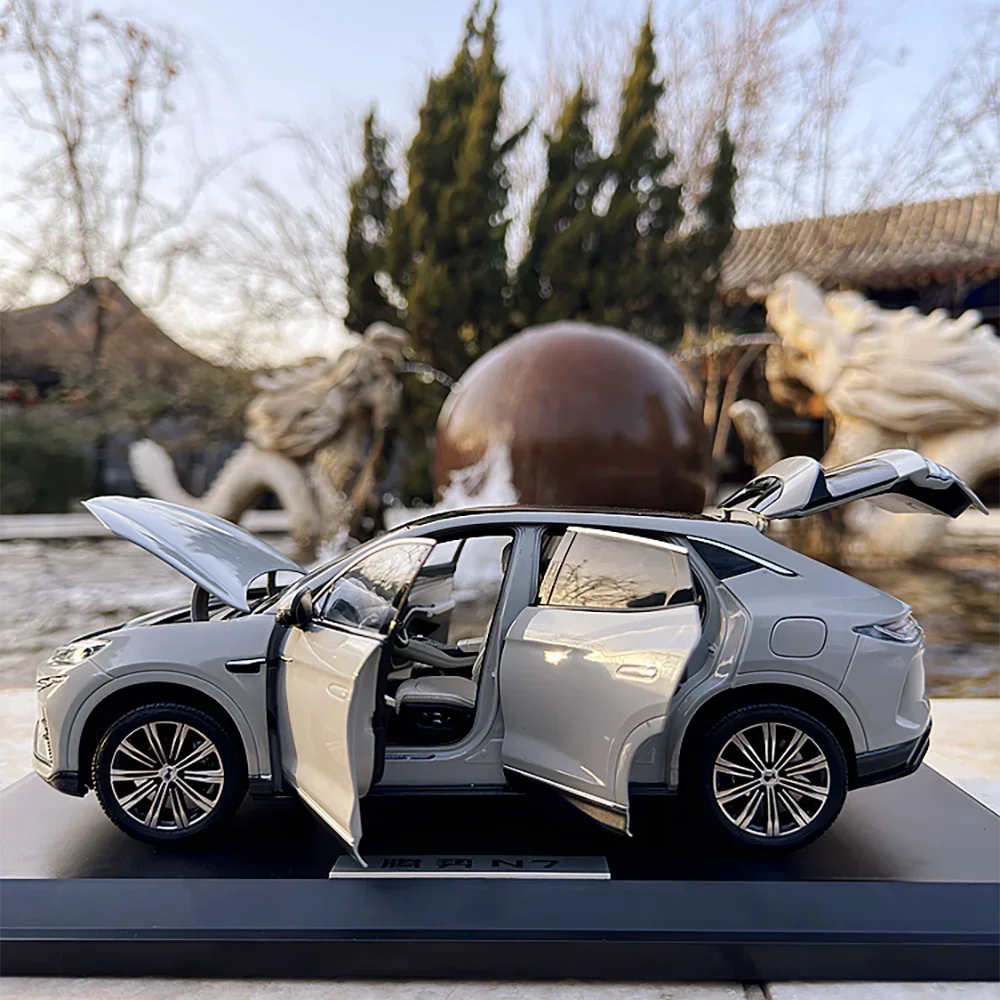 Experience the elegance and modernity of the BYD Tengshi N7 with this exquisite 1:18 scale die-cast alloy model. Crafted meticulously from alloy, ABS, and rubber, it captures the sleek, aerodynamic silhouette of the full-sized vehicle. The model features a pristine white color with black side mirrors and tinted windows, reflecting contemporary design. Its large, multi-spoke black alloy wheels with silver accents add a sporty touch, enhancing its visual appeal. Open the hood, doors, and trunk to reveal intricate interior details and inner mechanisms. Perfect for collectors or as a stylish decorative piece, it’s designed to inspire admiration and appreciation. Immerse yourself in the high-end aesthetic of this stunning replica, ideal for display and gifting.