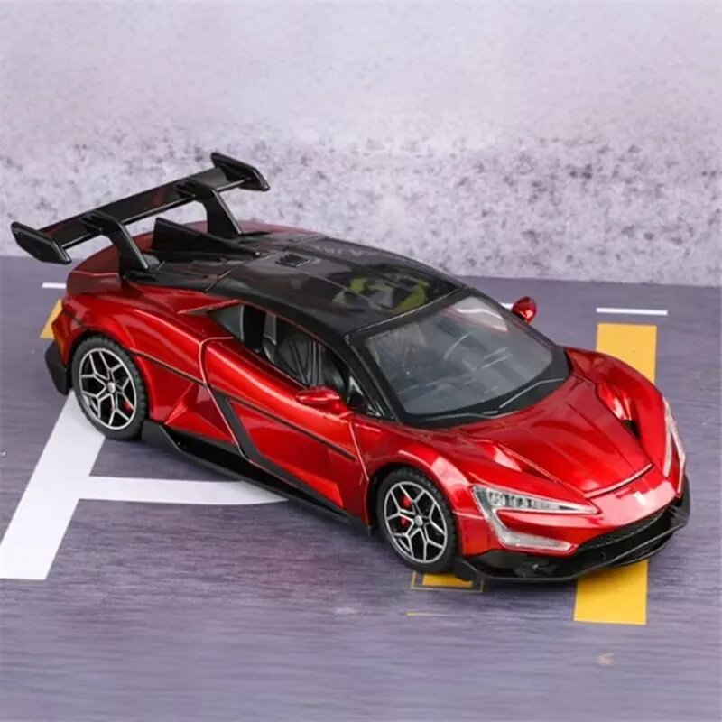 Experience the thrill of racing with this highly detailed 1:32 scale diecast model of a sports car, crafted from alloy and plastic materials. Featuring sound and light functions, the model showcases a sleek metallic silver finish with a glossy, reflective surface, angular aerodynamic lines, sharp LED headlights with a bluish glow, and sporty black multi-spoke alloy wheels with silver accents and tire treads. The dynamic design is enhanced by upward-scissor doors with black and silver accents and a contrasting black rear spoiler, capturing a sense of speed and luxury perfect for collectors aged 18+. Certified safe (3C) and available in red, silvery, and pink colors.