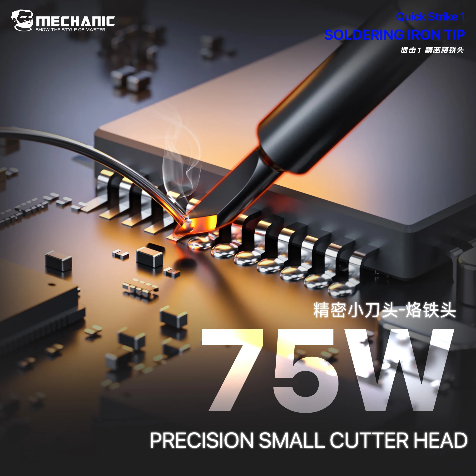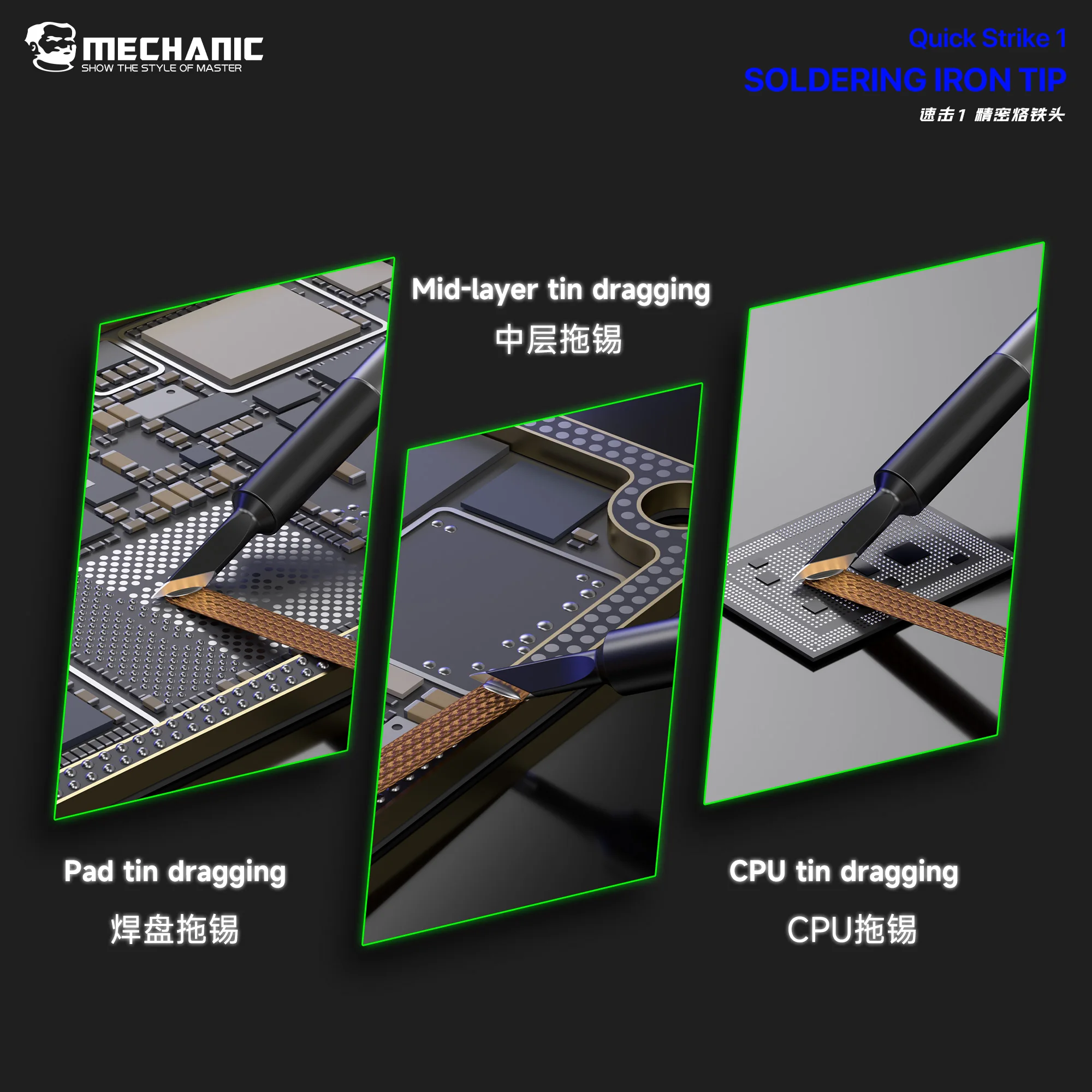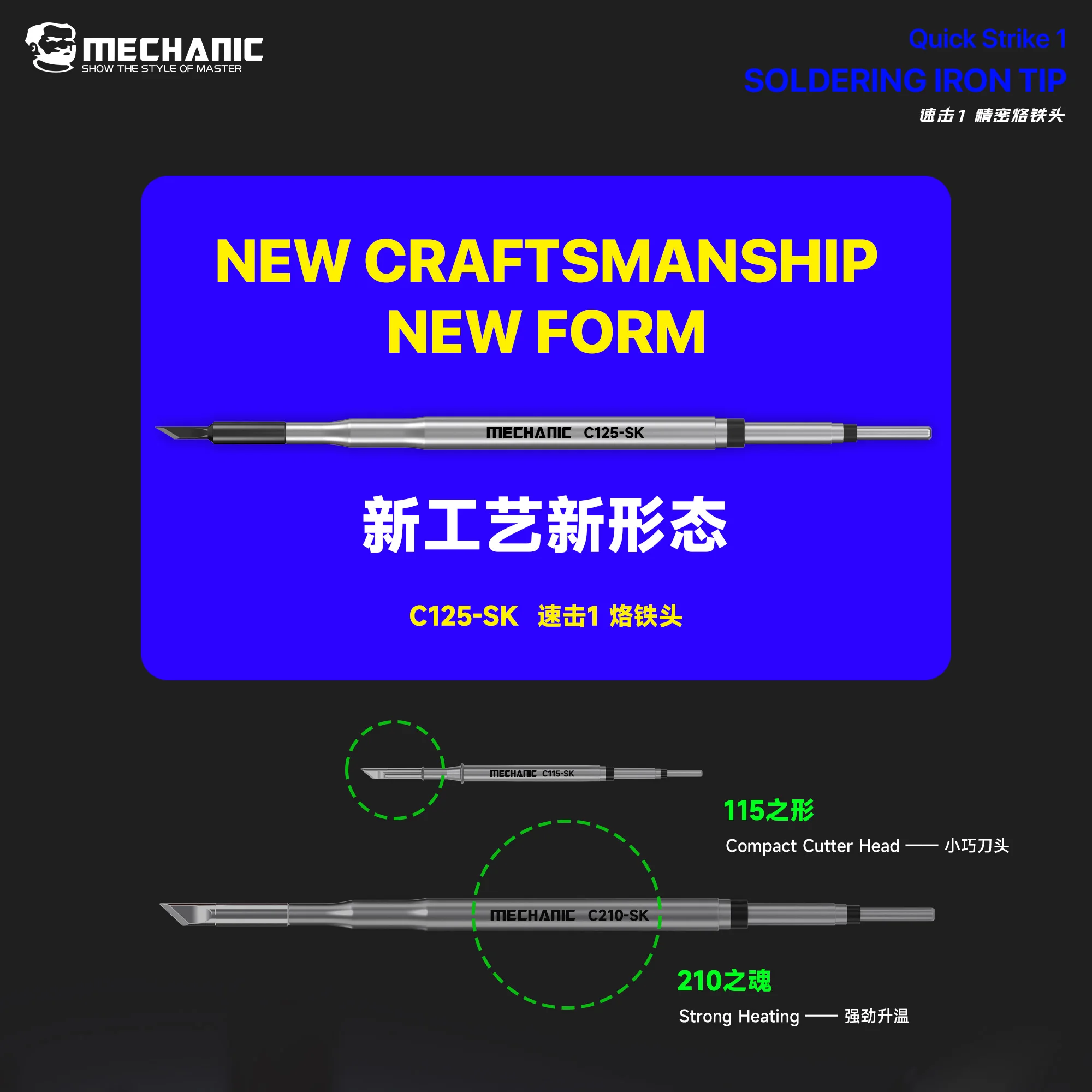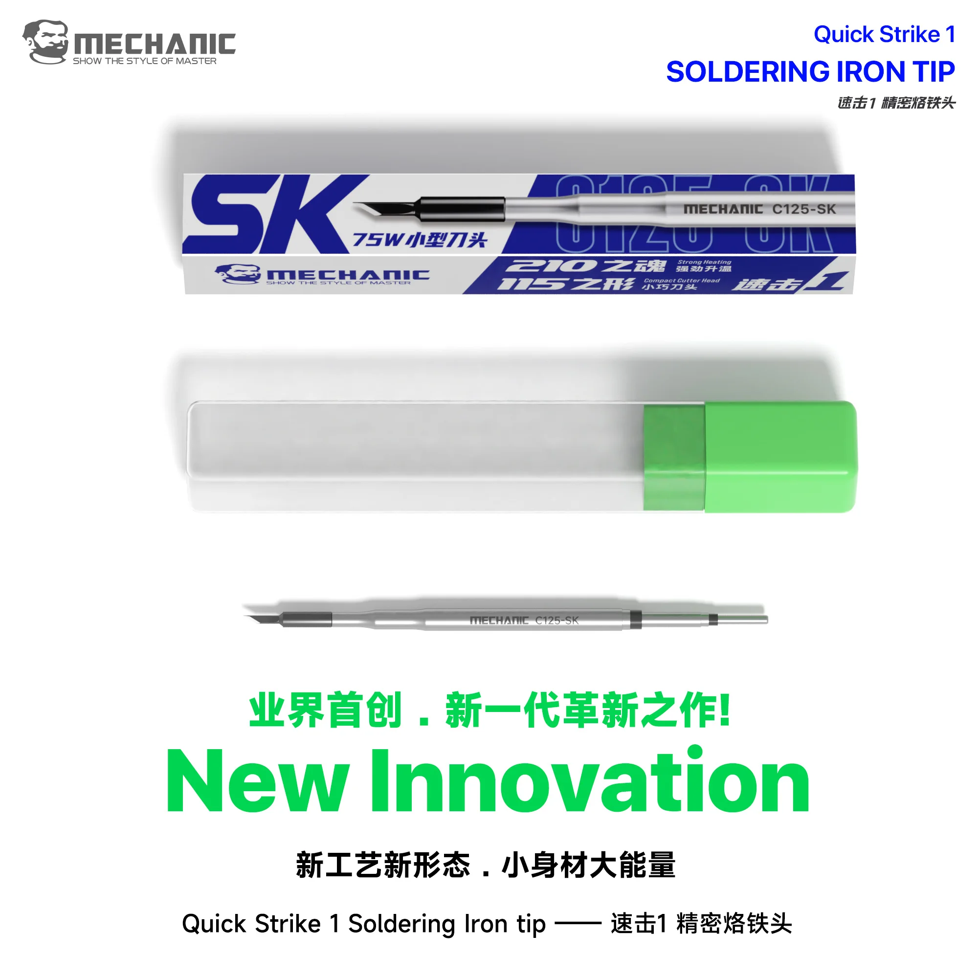 Experience precise and efficient electronics repair with the MECHANIC C125-SK soldering iron tip, featuring a quick strike design for rapid heat-up and recovery. Its specialized cutter head shape with a copper core and iron exterior offers superior thermal performance, ensuring excellent tin transfer and smooth soldering or desoldering on delicate CPU and BGA pads. Compatible with temperature-controlled soldering stations, this professional-grade tip is ideal for motherboard rework and advanced electronic repairs. The sleek, metallic finish combined with a vibrant green cap on the transparent storage container highlights durability and quality, making it a reliable addition to your repair toolkit for meticulous, high-precision work.