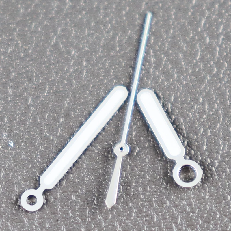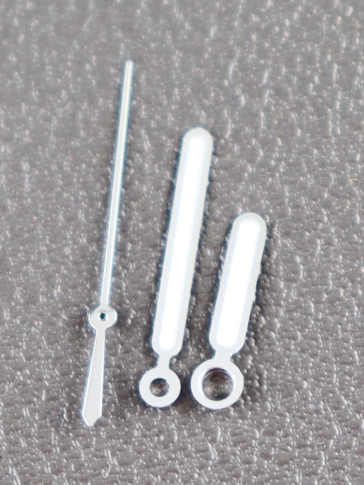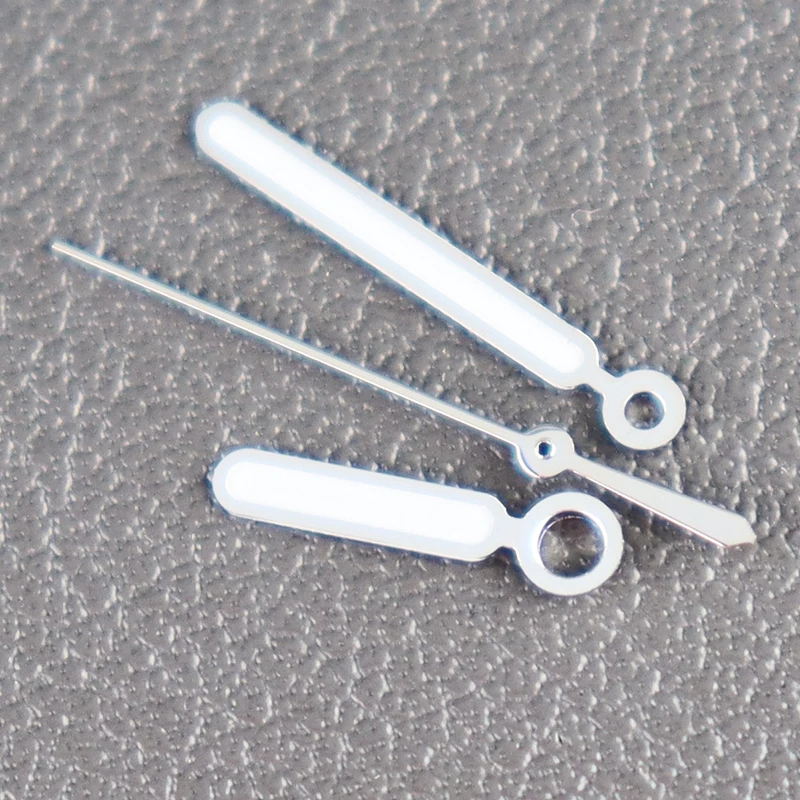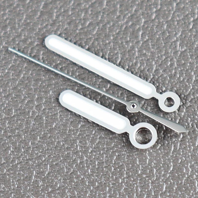 Enhance your watch with this premium set of stainless steel luminous hands, featuring a polished, reflective finish for a modern look. The set includes a 12mm by 12mm hour and minute hand with an 8mm extension from the mounting hole to the tip, both coated with vibrant green luminous paint for excellent visibility in low-light conditions. Also included is a slim, elongated second hand with a pointed tip and luminous green coating, designed for precise attachment via a circular hole at the base. Compatible with NH34, NH35, NH36, and NH38 movements, including NH35 and NH36 silver variants, this set offers durability, style, and accurate timekeeping for customized or restored watches.