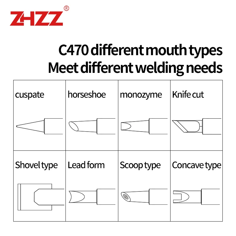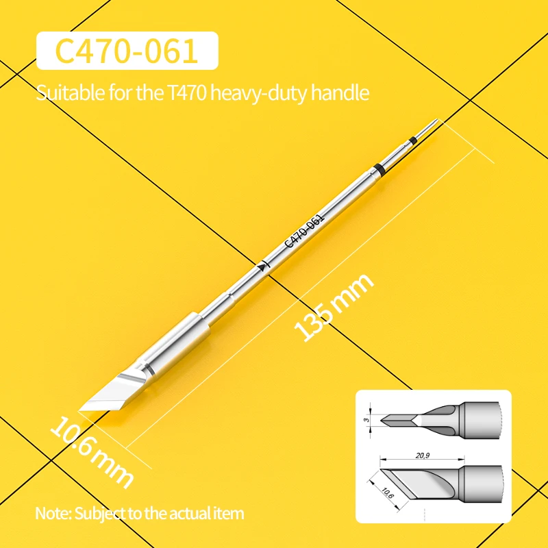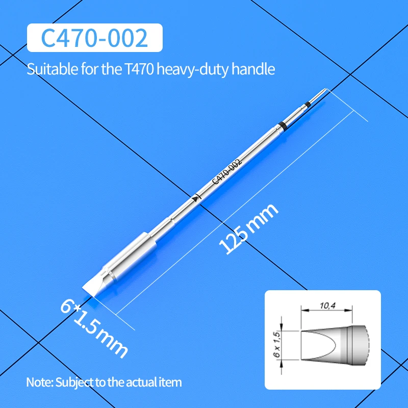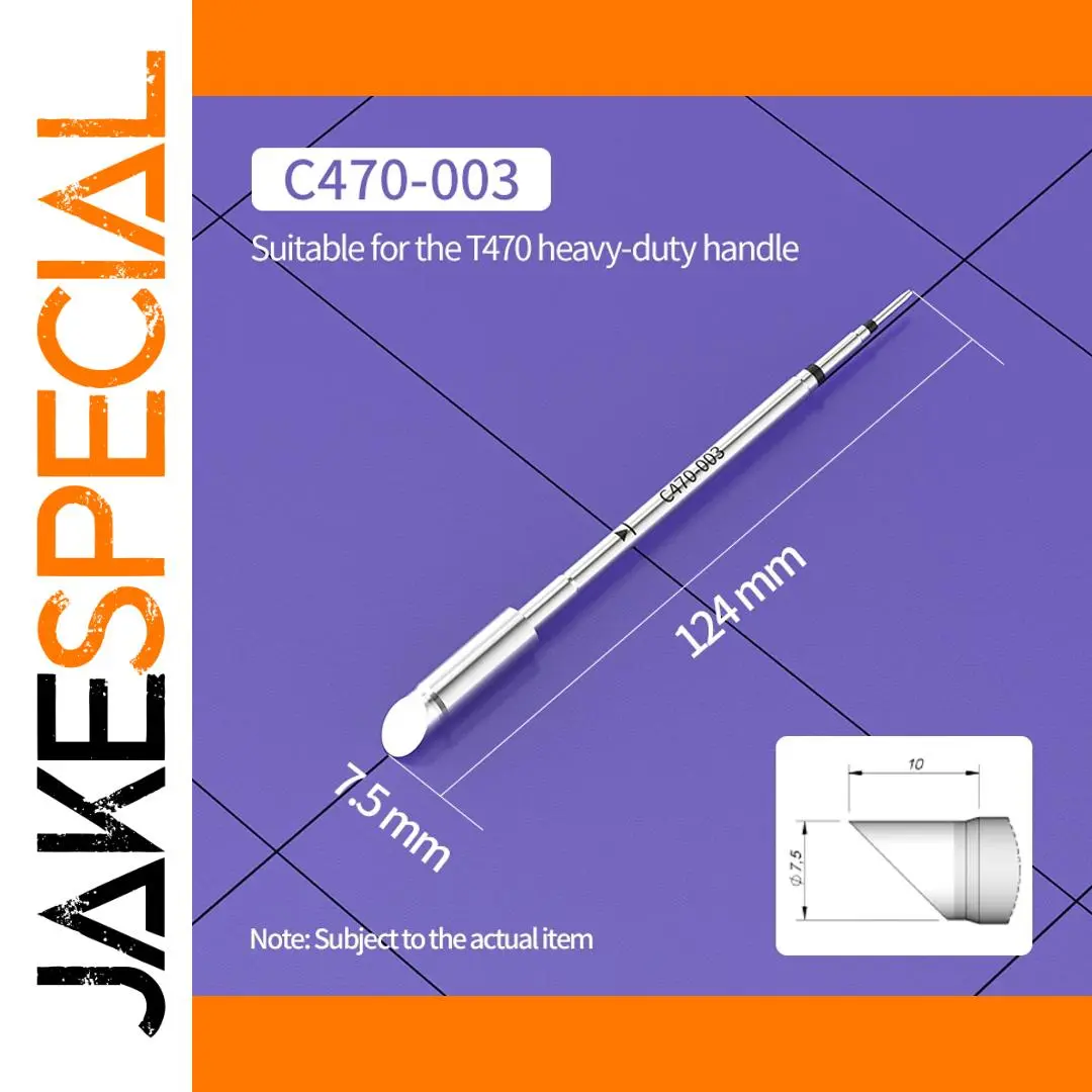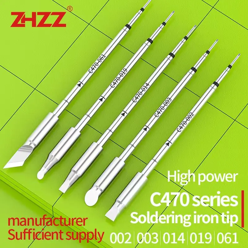 Enhance your soldering precision with the ZHZZ Universal C470 Series Soldering Iron Tips, compatible with JBC T470HD handles. This set includes models C470-003, C470-014, C470-061, C470-002, and C470-019, available in color-coded options for easy identification. Crafted from durable metallic alloys with a polished, reflective surface, each tip features a sleek conical shape that tapers from a broad base to a pointed end, measuring approximately 124 mm in length with a 7.5 mm diameter at the widest point and a 10 mm conical section. Designed for optimal craftsmanship and technical accuracy, these highly functional tips offer seamless fit and excellent heat transfer for professional soldering tasks.
