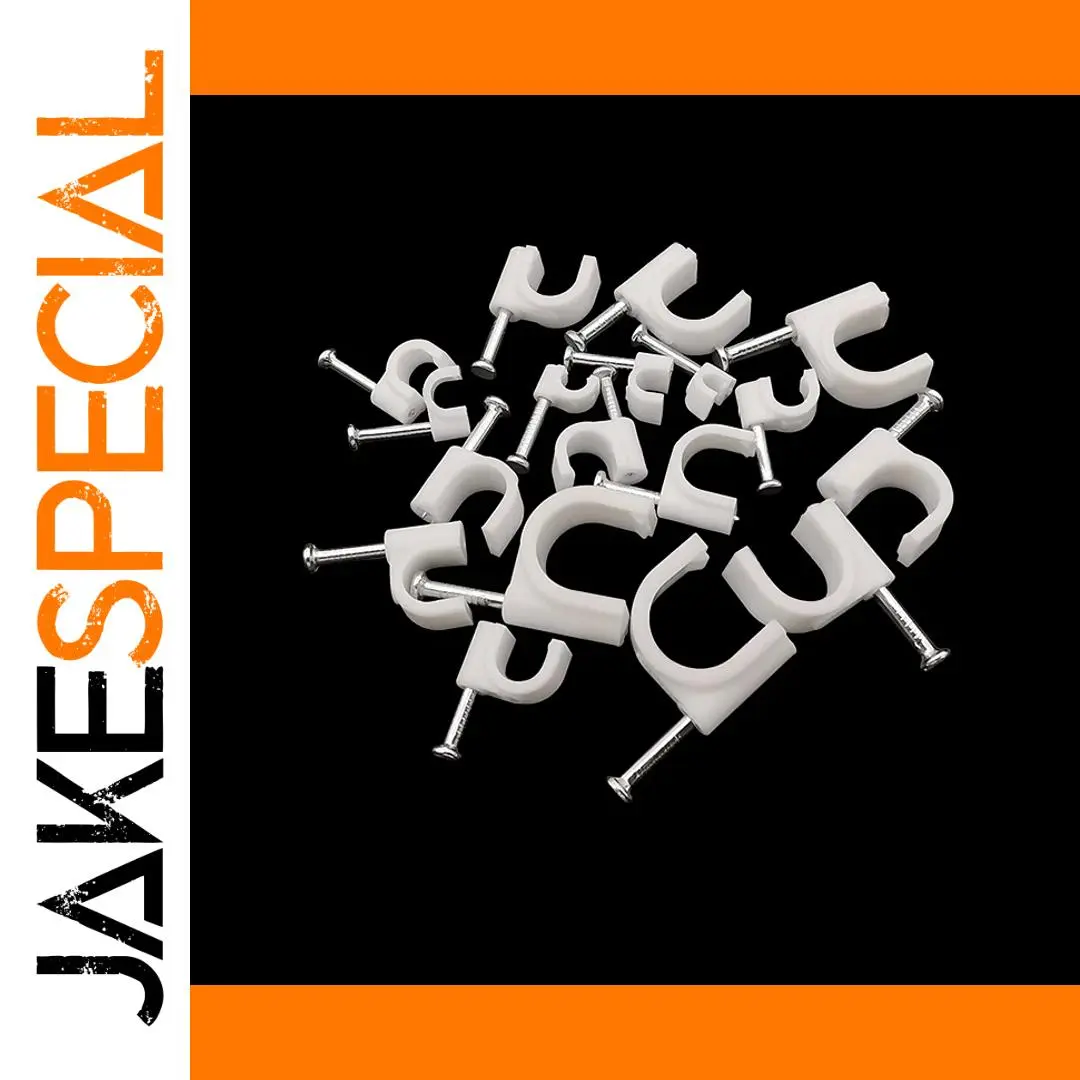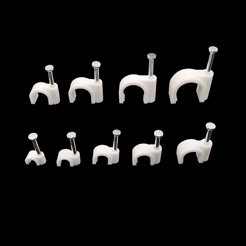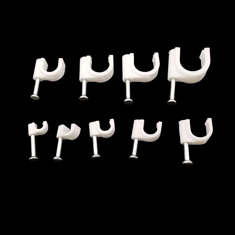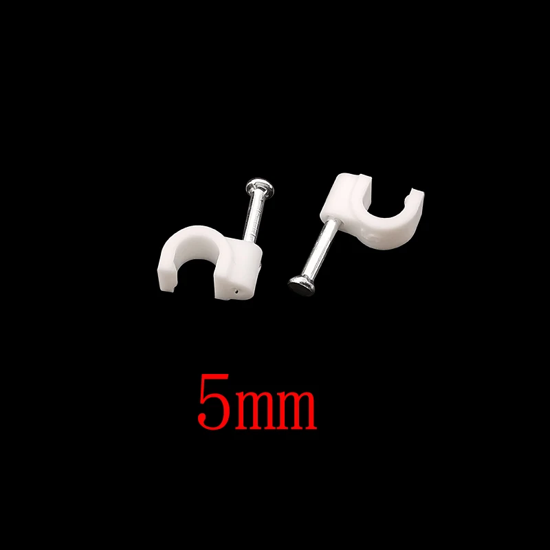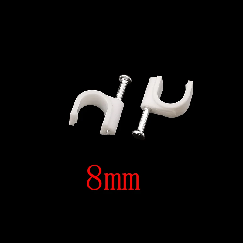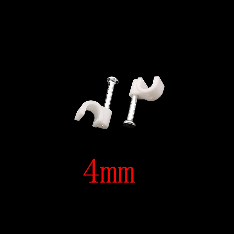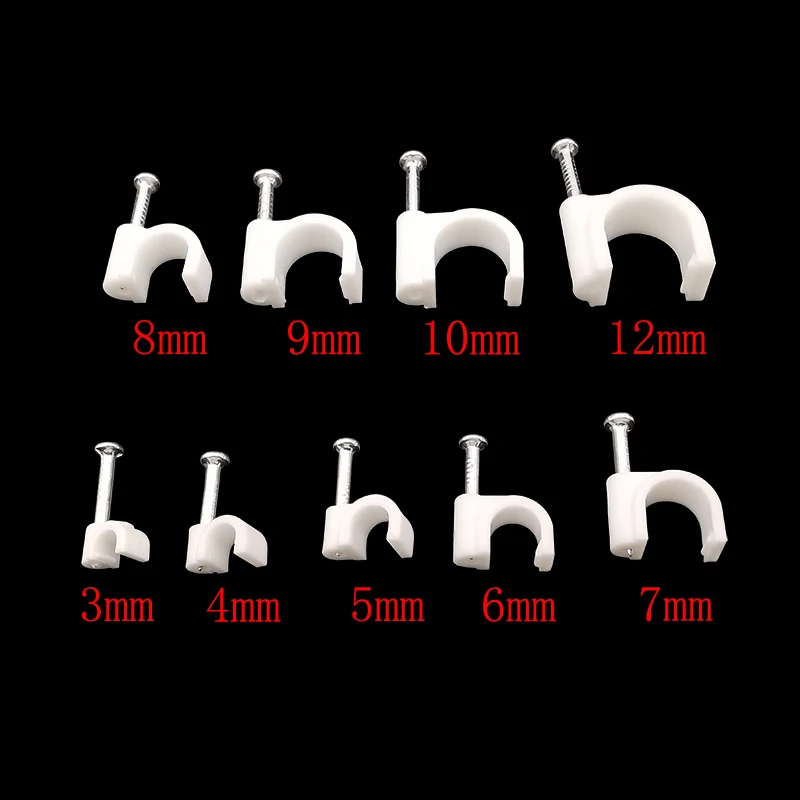 Enhance your cable organization with this high-quality set of 100 plastic round cable clips. Available in sizes ranging from 4mm to 12mm, these clips offer versatile solutions for managing various electrical cords and wires. Crafted with a sleek, minimalist design in white and silver, they seamlessly blend into any environment. The C-shaped structure ensures easy installation and secure hold, while the shiny steel nails provide strong attachment points for walls or surfaces. Perfect for home, office, or industrial applications, these clips keep cables tidy, prevent damage, and improve safety. With durable plastic construction and precise sizing, you can trust these clips to handle different cable diameters effectively, maintaining a clean and organized workspace. Cluttered wires are now a thing of the past.