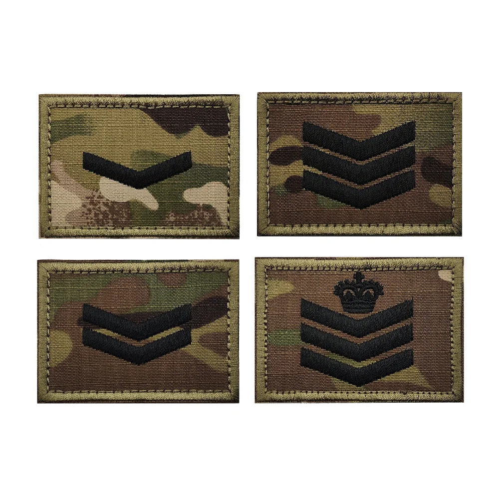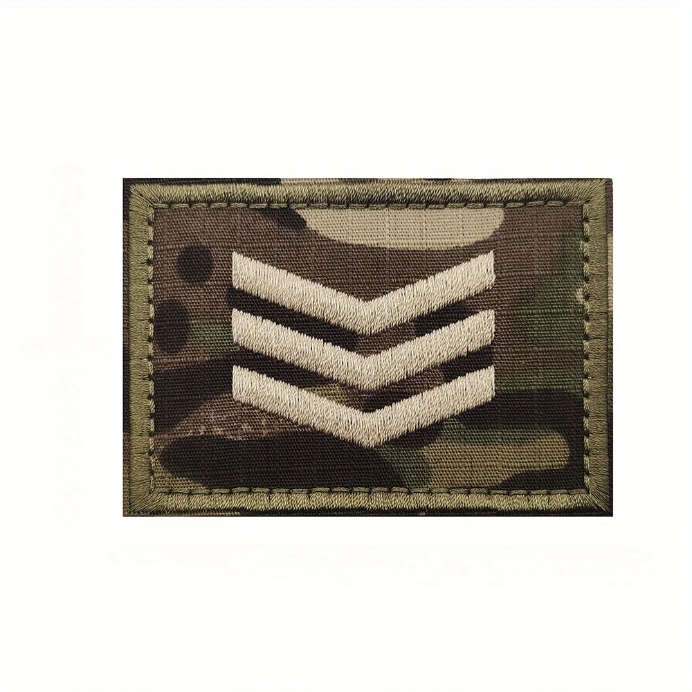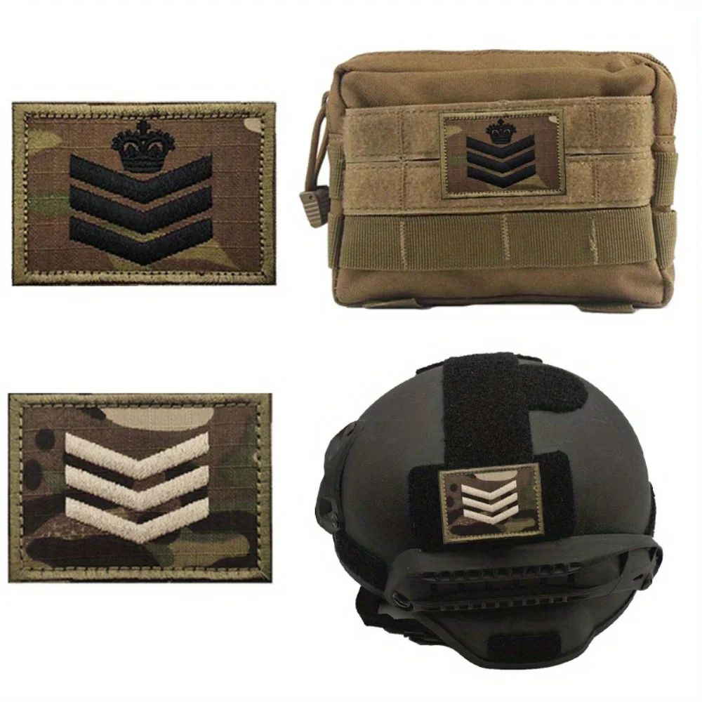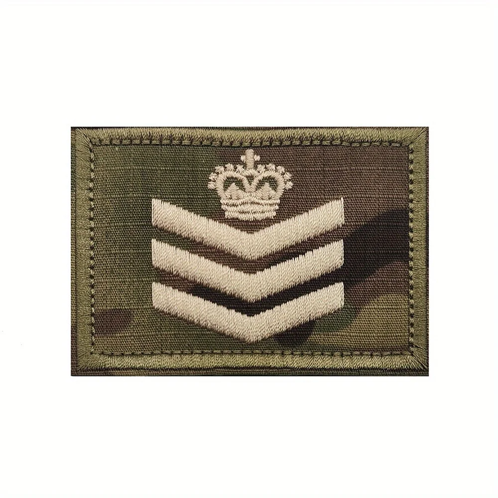 Enhance your military gear with this durable embroidered camouflage patch, crafted from nylon/polyester material with a hook-and-loop backing for easy attachment to clothing, backpacks, hats, helmets, or vests. Featuring a rugged camouflage design in earthy shades of brown, green, and tan, it showcases three bold black chevrons stacked horizontally and a small black embroidered crown for a regal touch. Available in multiple color variants, including black and white options with or without a crown, this versatile patch is suitable for unisex use. Its precise machine embroidery and reinforced border ensure durability and a clean, professional appearance for your tactical or DIY gear.