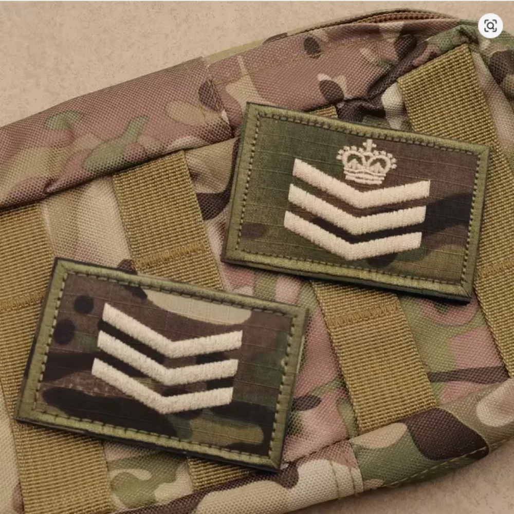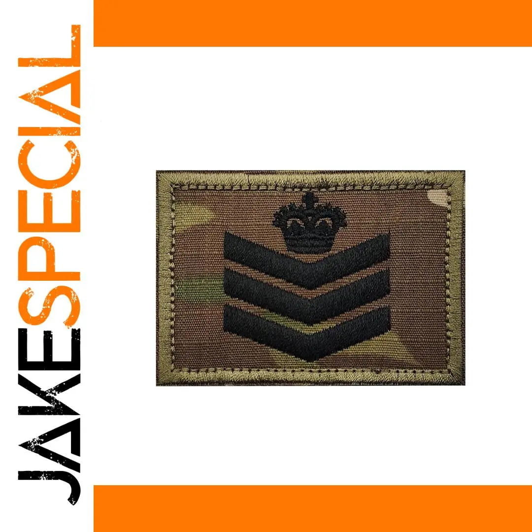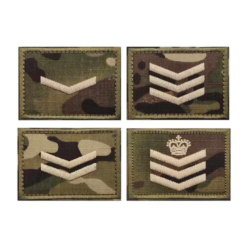 Enhance your military gear with this durable embroidered camouflage patch, crafted from nylon/polyester material with a hook-and-loop backing for easy attachment to clothing, backpacks, hats, helmets, or vests. Featuring a rugged camouflage design in earthy shades of brown, green, and tan, it showcases three bold black chevrons stacked horizontally and a small black embroidered crown for a regal touch. Available in multiple color variants, including black and white options with or without a crown, this versatile patch is suitable for unisex use. Its precise machine embroidery and reinforced border ensure durability and a clean, professional appearance for your tactical or DIY gear.