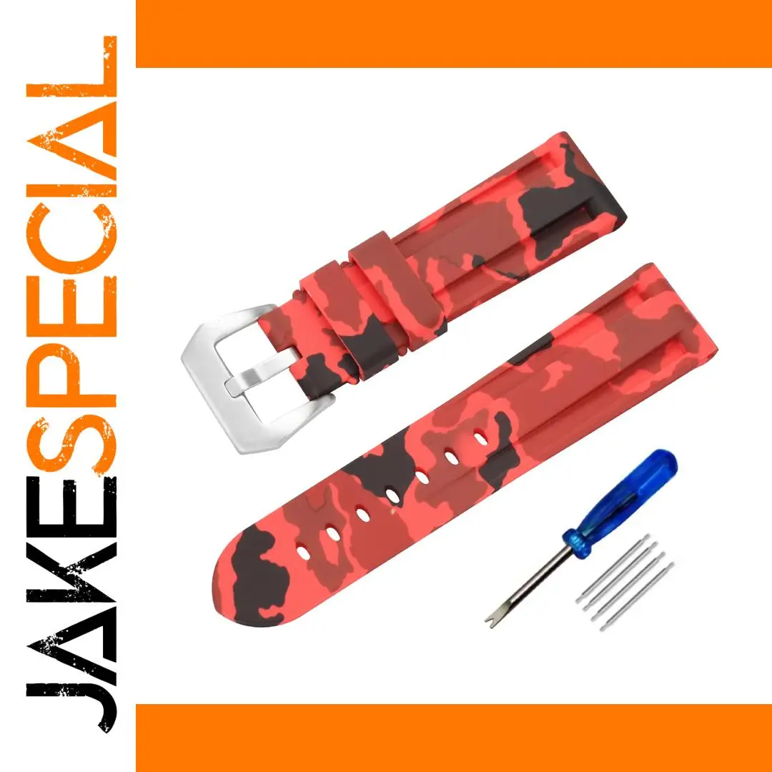 Elevate your timepiece with this striking Camouflage Silicone Watch Band. Crafted from high-quality silicone, it features a bold red base adorned with intricate black and dark gray shapes, perfectly balancing aesthetics with comfort. The band promises a soft feel for all-day wear, making it not just a visual accessory but also a practical choice. Its polished stainless steel buckle adds durability and a touch of sophistication, ensuring secure fastening. With multiple adjustment holes, this unisex band caters to various wrist sizes, making it suitable for everyone. Transform your watch and express your unique style effortlessly!