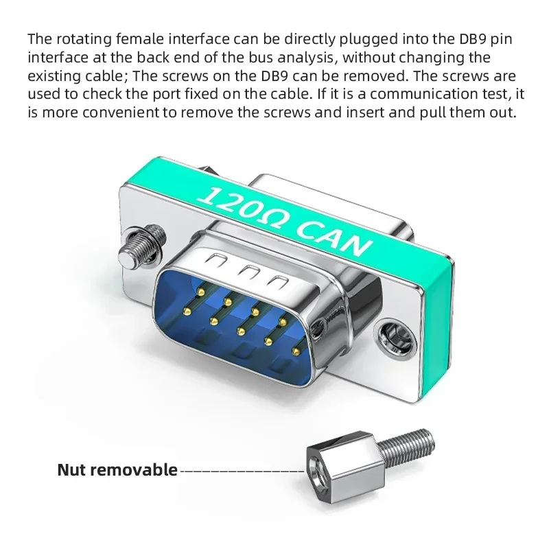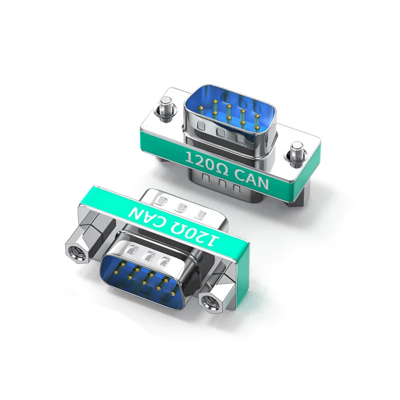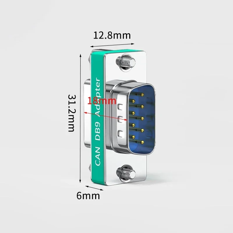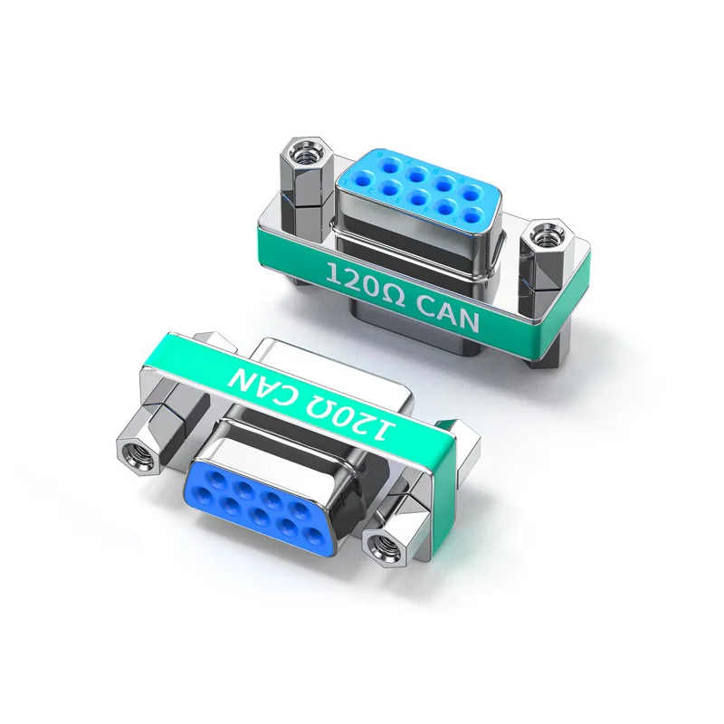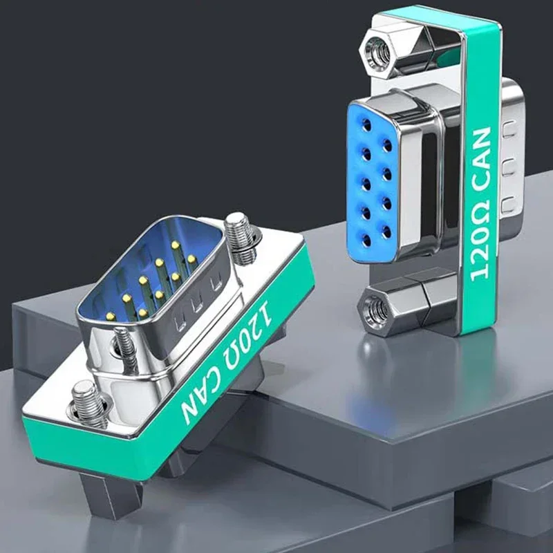 Discover the versatility of this this CAN bus conversion head, designed with precision and durability in mind. Featuring a sleek, industrial style, it sports shiny nickel-plated metal connectors with smooth, rounded rectangular shells, secured by finely machined screws. The adapters come in multiple configurations—female to female, male to female, or male to male—allowing seamless connection between various devices. Inside, gold-plated copper pins ensure excellent conductivity and corrosion resistance. The connectors are complemented by vibrant blue and green plastic housings with white markings for easy identification. Compact at approximately 32mm x 14mm x 7mm, these adapters provide high accuracy with a built-in 120Ω resistance at 1%. Their modern design and technical precision make them ideal for demanding CAN bus applications.