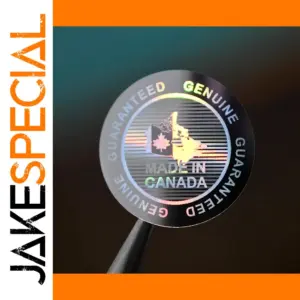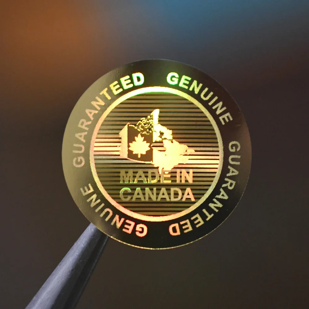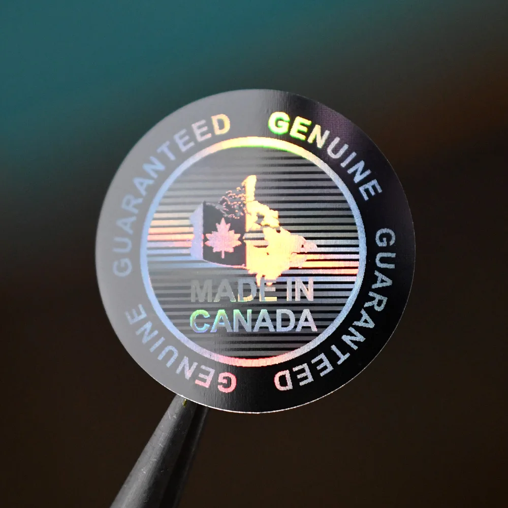Enhance your authenticity assurance with this high-quality holographic security sticker, measuring 20x20mm. Designed with a mesmerizing, iridescent surface, it reflects a spectrum of colors, primarily shimmering silver with rainbow-like hues that shift in the light. The concentric circle design features the phrase “GUARANTEED GENUINE” repeatedly on the outer ring, with color variations from blue to green and pink depending on viewing angles. The inner circle displays a holographic map of Canada, shimmering and changing colors as viewed from different perspectives, embossed for added depth. A metallic pink maple leaf overlays the map, signifying Canadian origin. Centered, the phrase “MADE IN CANADA” is prominently displayed, with “MADE IN” in muted grey and “CANADA” in bright green, emphasizing authenticity. A holographic strip pattern streaks through the background, heightening security and visual appeal, making counterfeit reproduction extremely difficult. The high-gloss finish creates a luxurious feel suitable for various applications ensuring product or document authenticity.