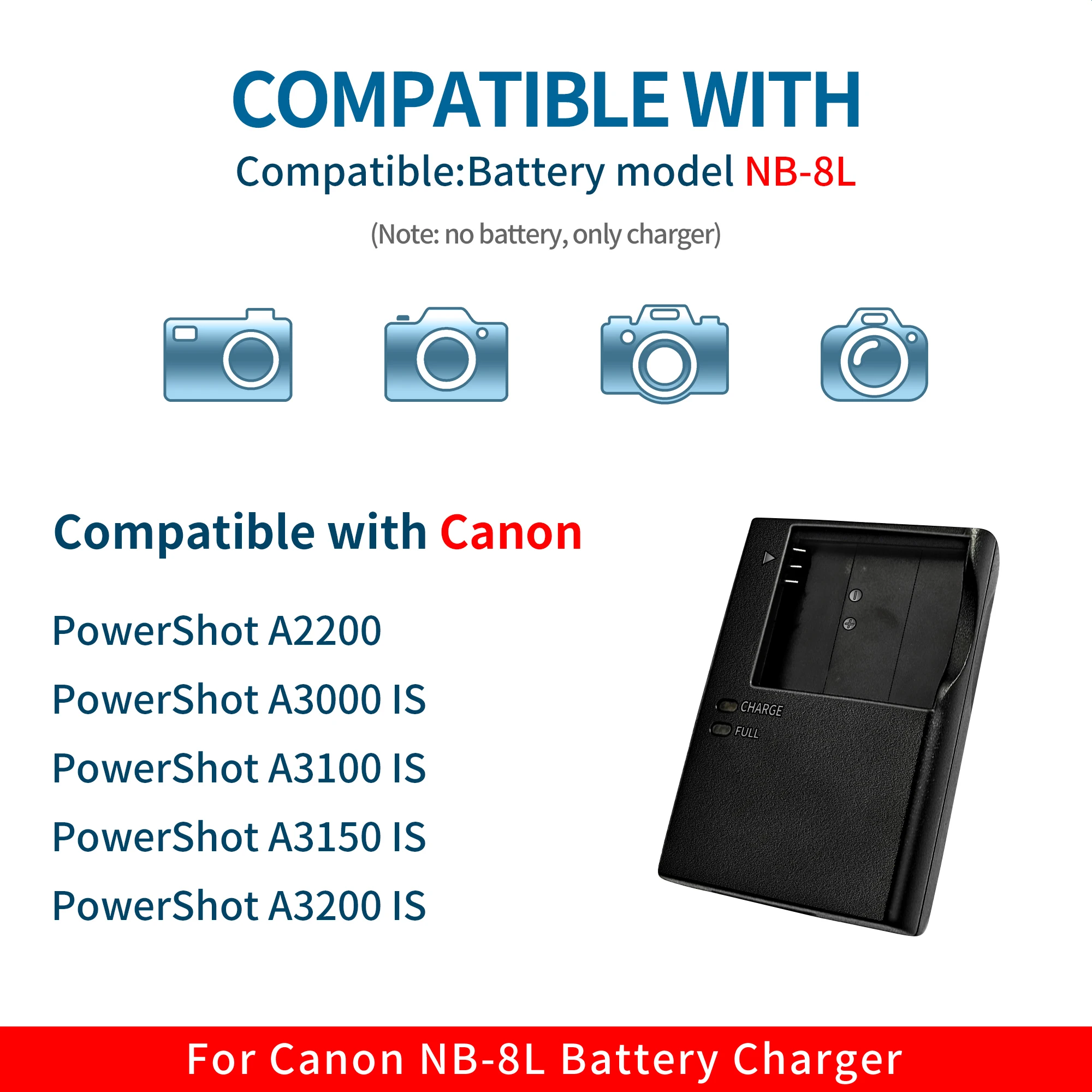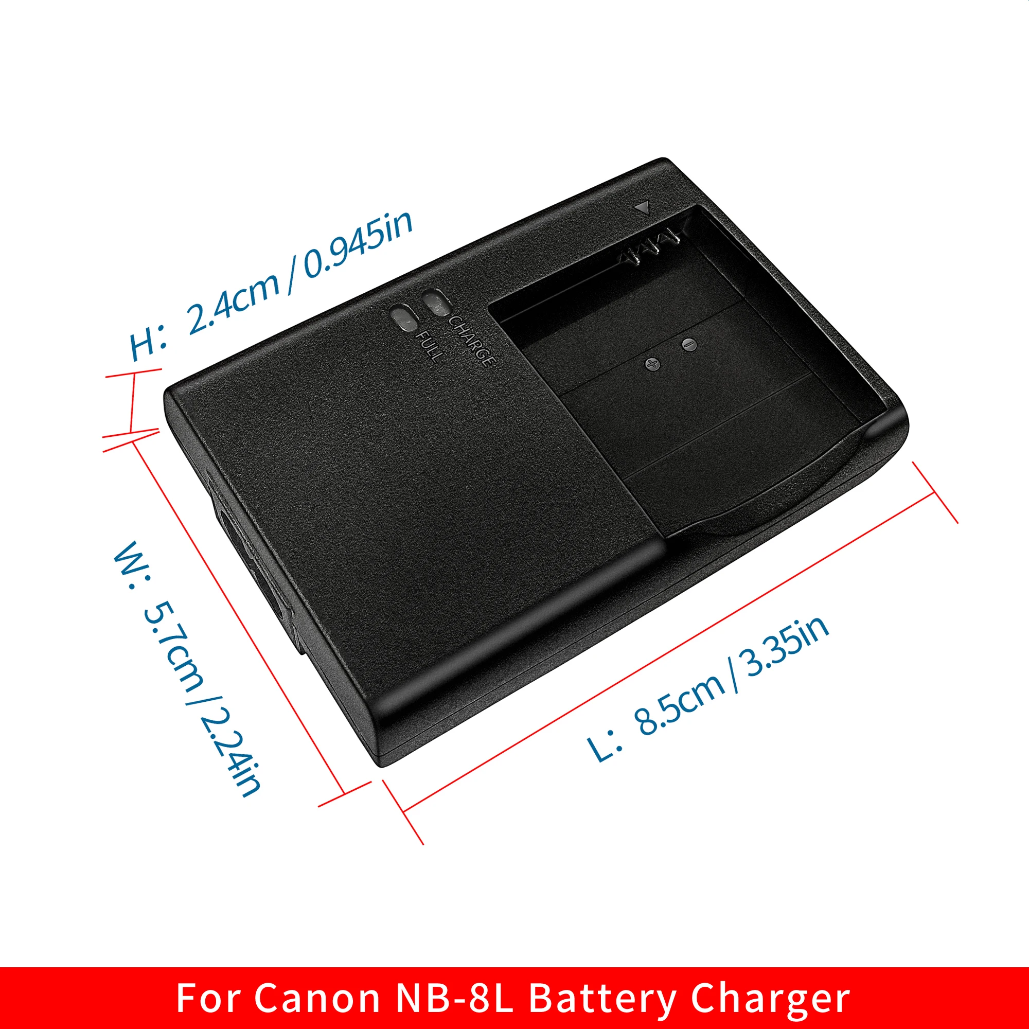 The Canon CB-2LAE NB-8L battery charger is tailored for your Canon camera, providing the reliability you need. With its compact design in sleek matte black, it seamlessly fits into any setup. Intelligent charge technology ensures optimal battery health, while the dual indicator buttons keep you informed of charging status. Perfectly compatible with a range of Canon models, including A3500 and IXUS140, this charger is your essential companion. Experience efficient and fast charging with output of DC 4.2V and 0.65A. Whether traveling or at home, enjoy the convenience and functionality this charger brings to your photography experience.