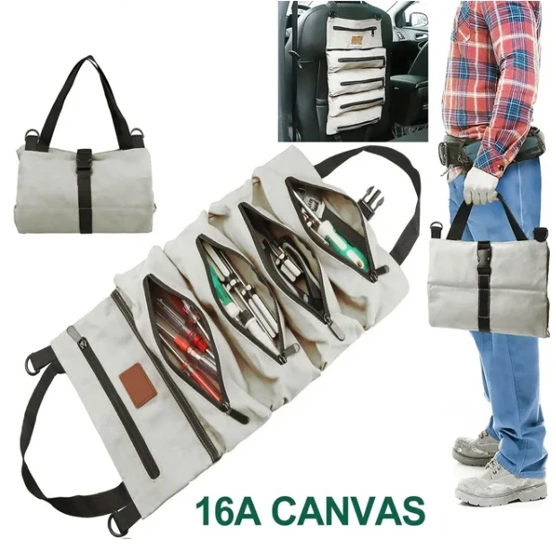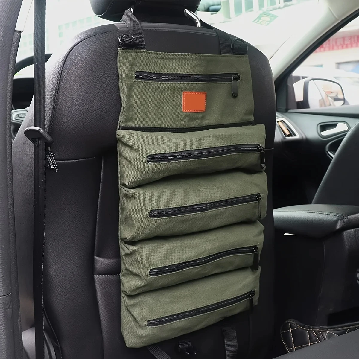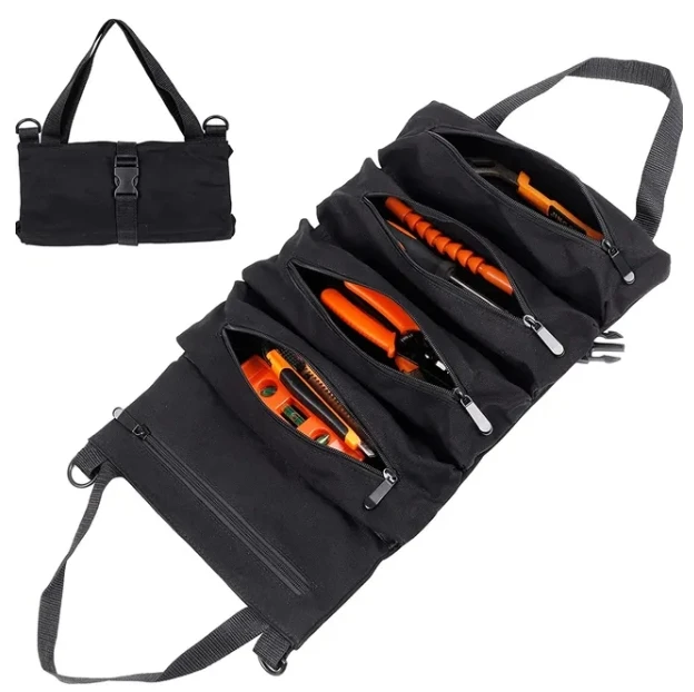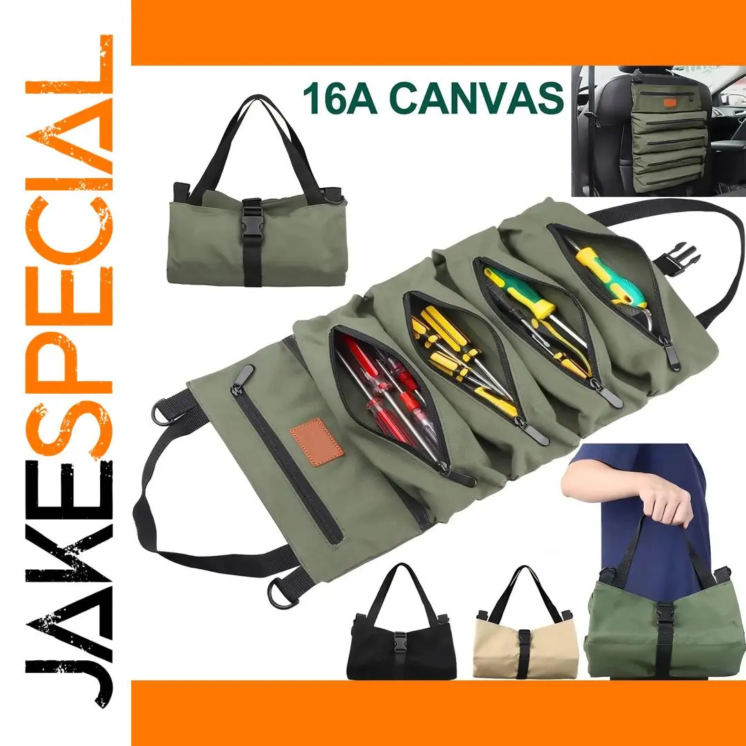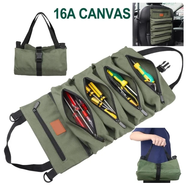 This multi-purpose roll-up tool bag is crafted from durable nylon material and is available in olive green, black, and light khaki. It features multiple zippered compartments, outlined with sturdy black zippers for easy access and organization of tools and small items. A unique rectangular brown leather patch enhances its stylish appearance. Designed for versatility, this bag serves as a wrench roll, canvas tool organizer, and storage case for a car first aid kit, providing practical functionality for diverse storage needs. The bag can be easily rolled up for transport and is equipped with strong black webbing handles secured with a buckle for added support.