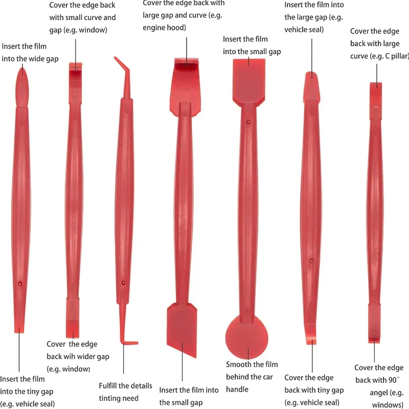 Imagine completing your car wrapping or window tinting project with ease and confidence. This set of seven high-quality plastic tools provides precise control and gentle application to avoid scratches or damage. Crafted from durable, abrasion-resistant polypropylene, these tools are designed to withstand frequent use while maintaining their shape and effectiveness. The sleek, ergonomic shapes, including flat, curved, pointed, and L-shaped forms, enable you to work comfortably in tight spaces and be highly precise. Available in vibrant red or blue, the tools add a touch of color to your workspace and serve as reliable accessories for all vinyl and tinting applications. Whether you’re a professional or an enthusiast, this kit makes your projects seamless and satisfying.