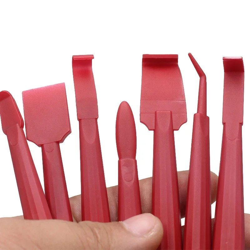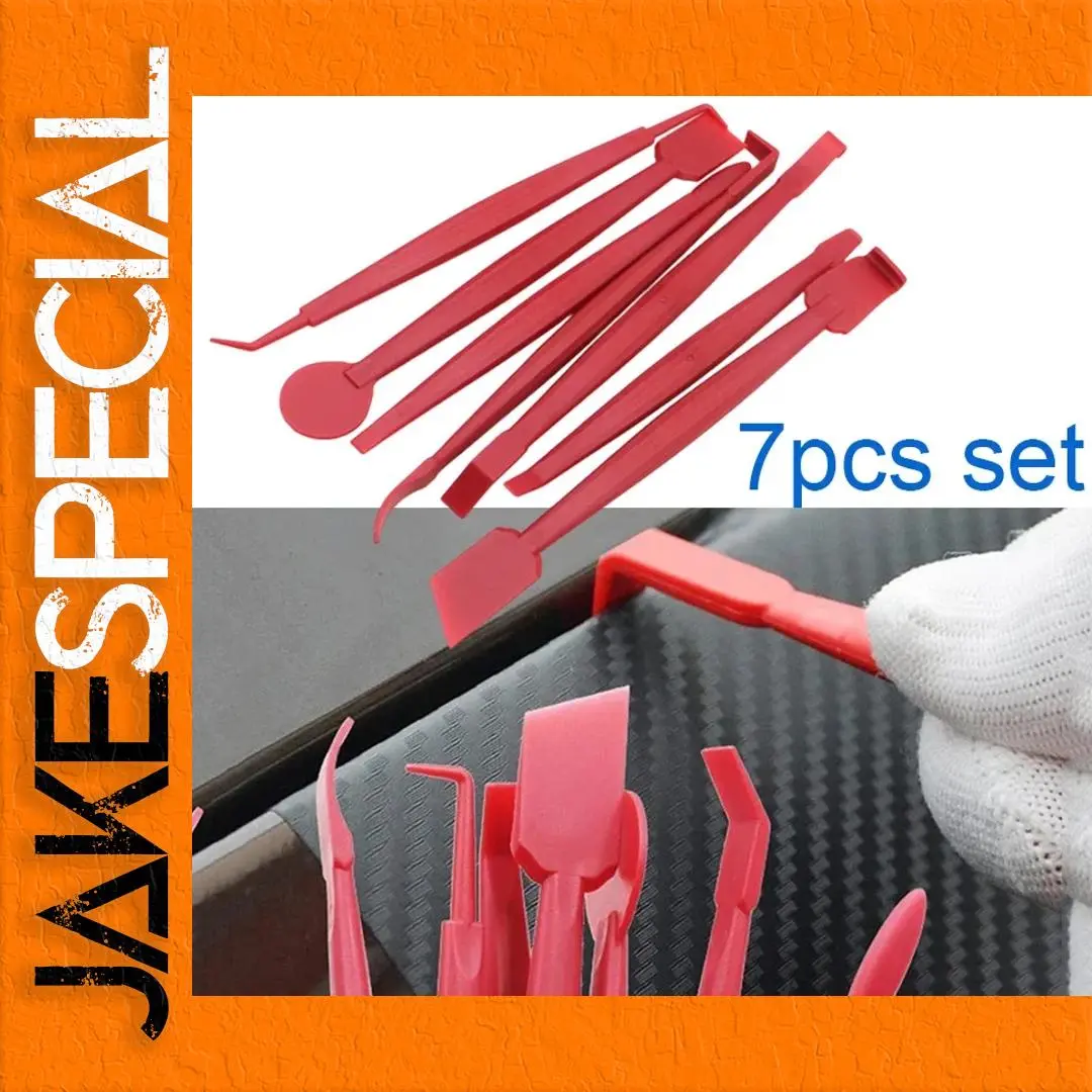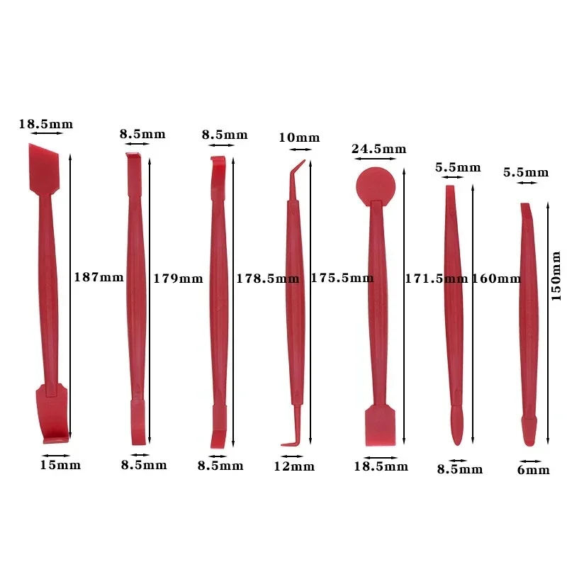 - Technical specifications include: PP material, available in 7-piece sets, color options of red and blue, suitable for vinyl wrap, tinting, and sticker installation tasks.
