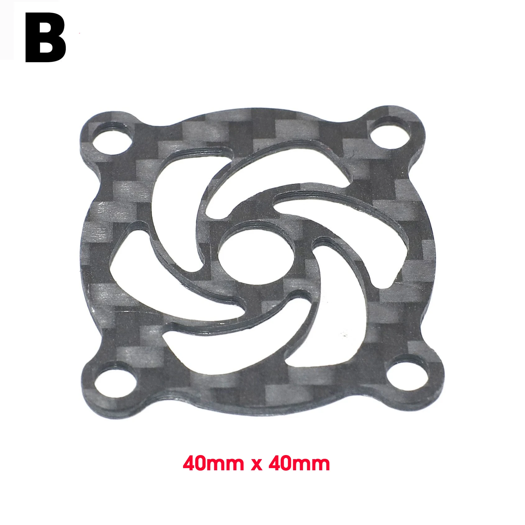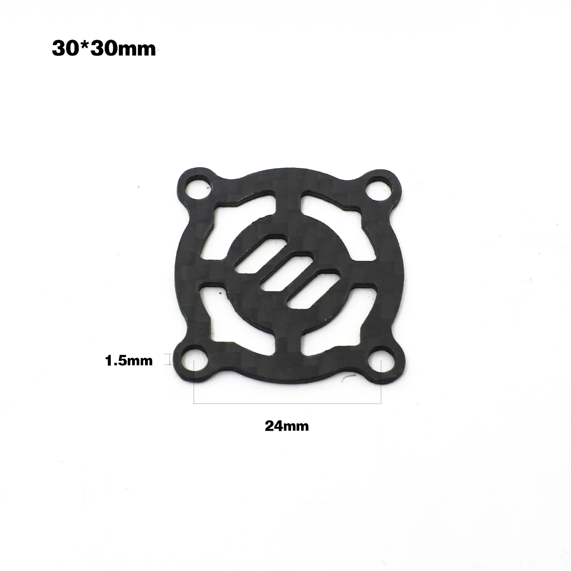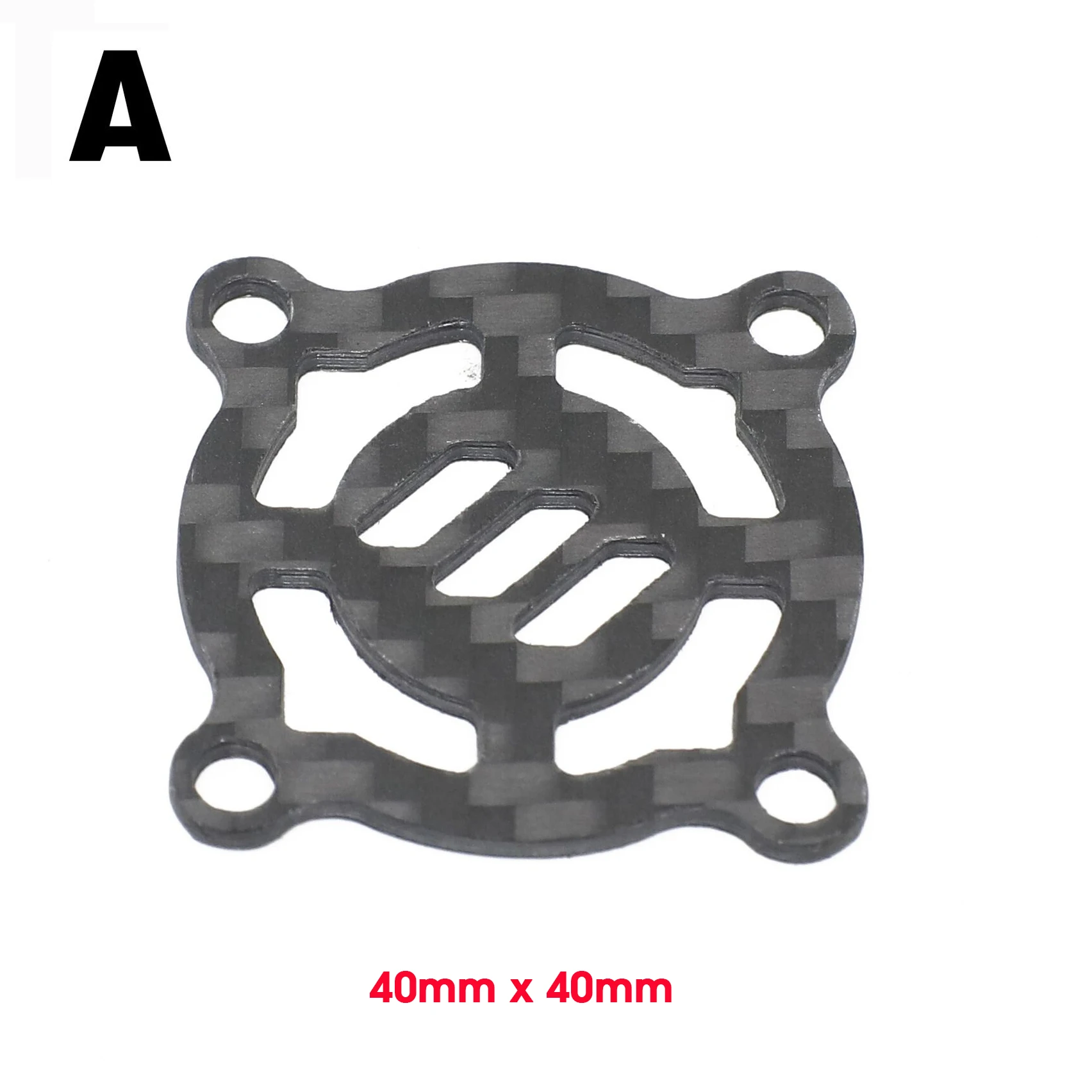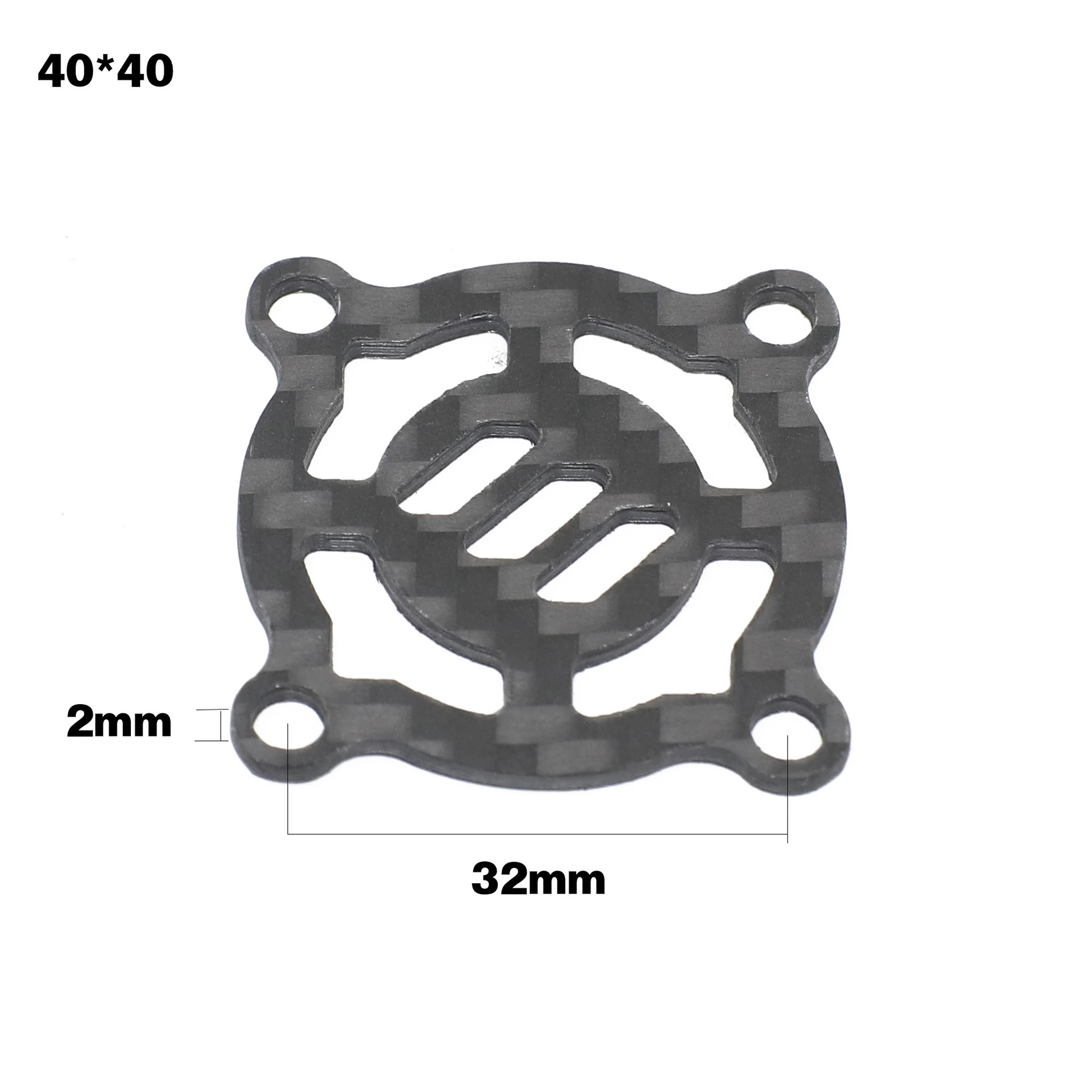 - Technical specs include dimensions (30x30mm or 40x40mm), weight, compatibility with standard RC components, and a model number “Carbon Fiber Cooling Fan Cover.”