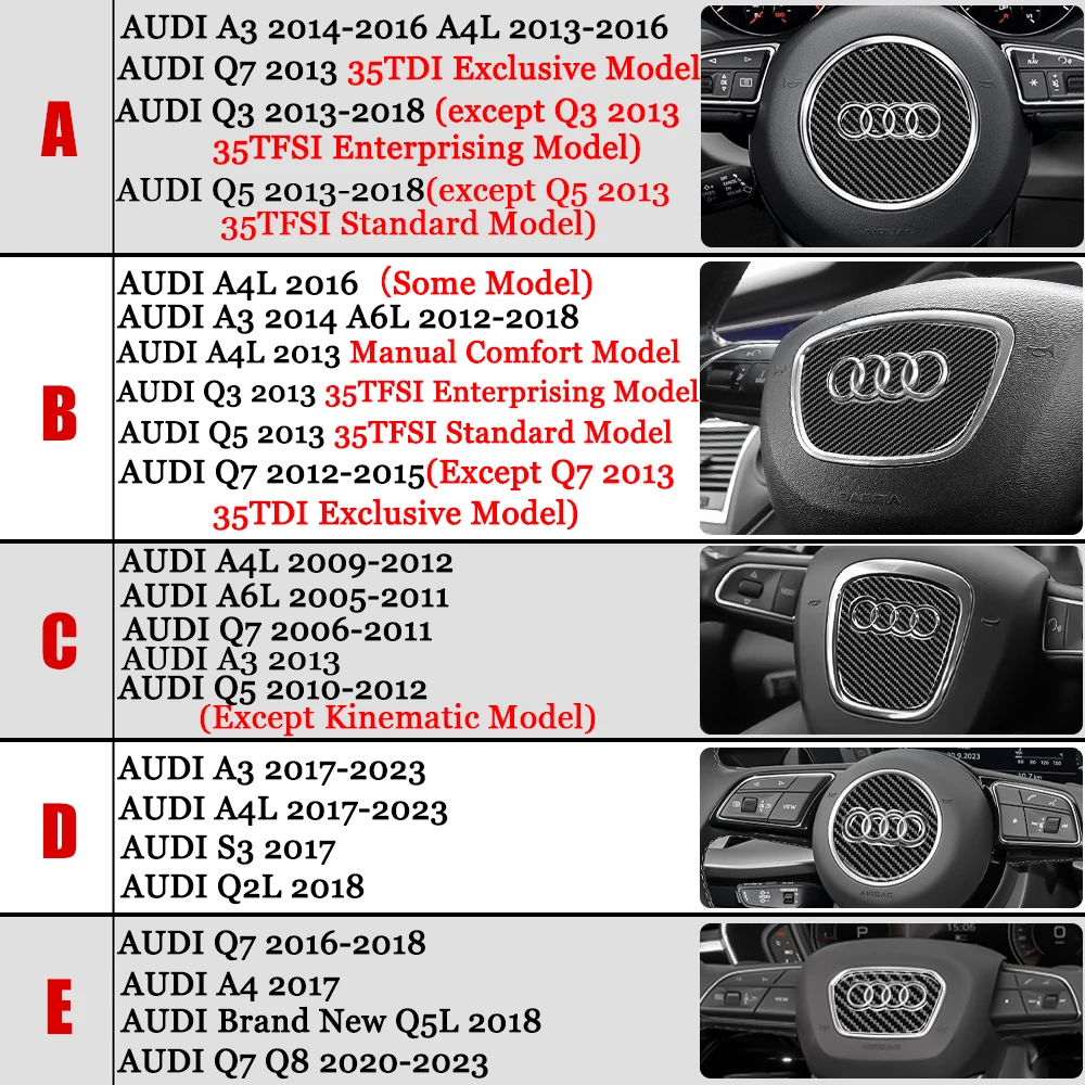 Transform your vehicle’s interior with this high-quality carbon fiber steering wheel decal, compatible with models including A3, A4L, Q2L, Q3, Q5, Q7, Q8, and S3, from 2005 to 2023. Featuring a textured woven pattern that mimics genuine carbon fiber and accented with a shiny metallic silver (chrome-like) outline, it provides a sleek, modern, and sporty aesthetic. Precisely fitting around the steering wheel trim cover, the decal ensures easy application and secure adhesion. Available in five colors—A, B, C, D, and E—it resists fading and wear, offering a durable, eco-friendly upgrade that instantly elevates your vehicle’s style.