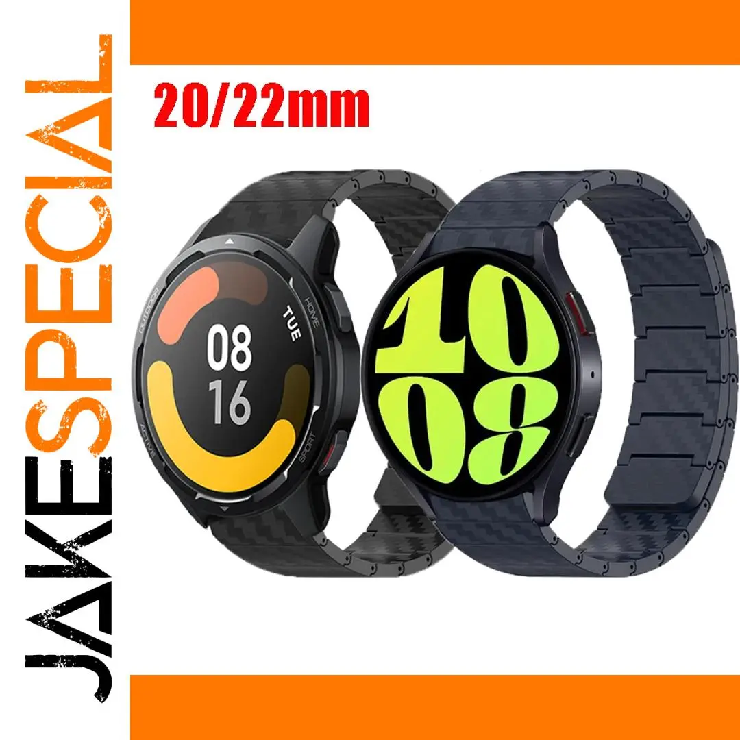 - Technical specifications include: 20mm and 22mm strap widths, segmented acrylic construction with carbon fiber texturing, fit for smartwatches with standard or larger lug sizes, and adjustable length to ensure comfortable wear.