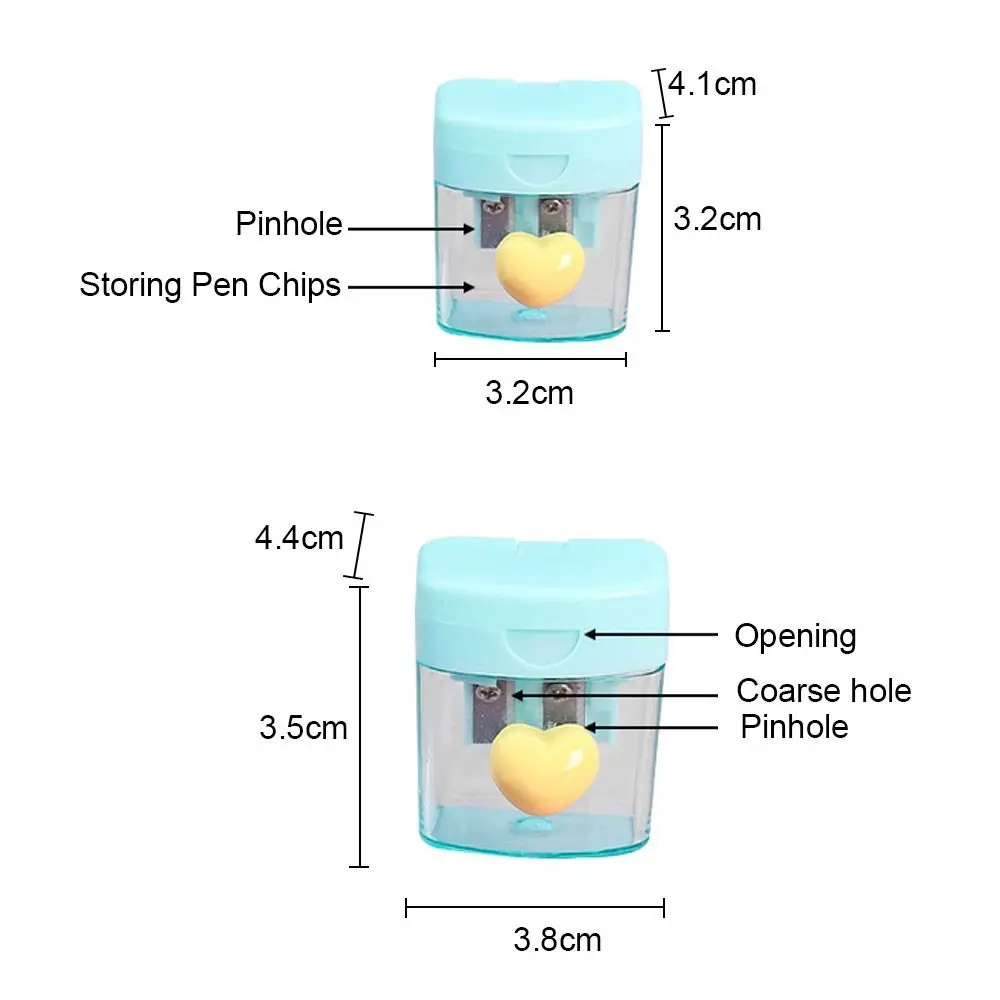 Elevate your stationery collection with our vibrant Cartoon Pencil Sharpener, designed to add a playful touch to your desk. Available in both single hole (3.2 x 3.2 x 4.1 cm) and double hole (3.8 x 3.5 x 4.4 cm) options, these sharpeners come in an array of eye-catching colors, including green, pink, blue, and purple. Each sharpener features a transparent body, allowing you to witness the sharpening process while its alloy steel spiral blade ensures smooth and efficient pencil sharpening. Lightweight yet durable, it’s perfect for students and office use alike, accommodating various pencil types for all your creative needs.