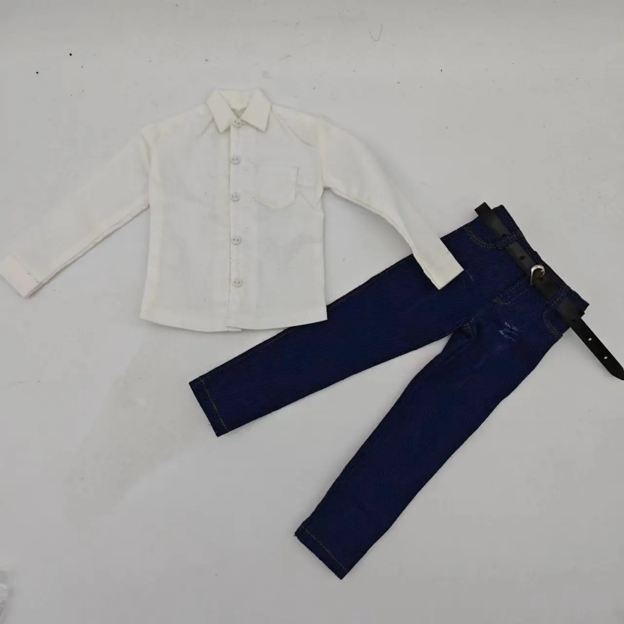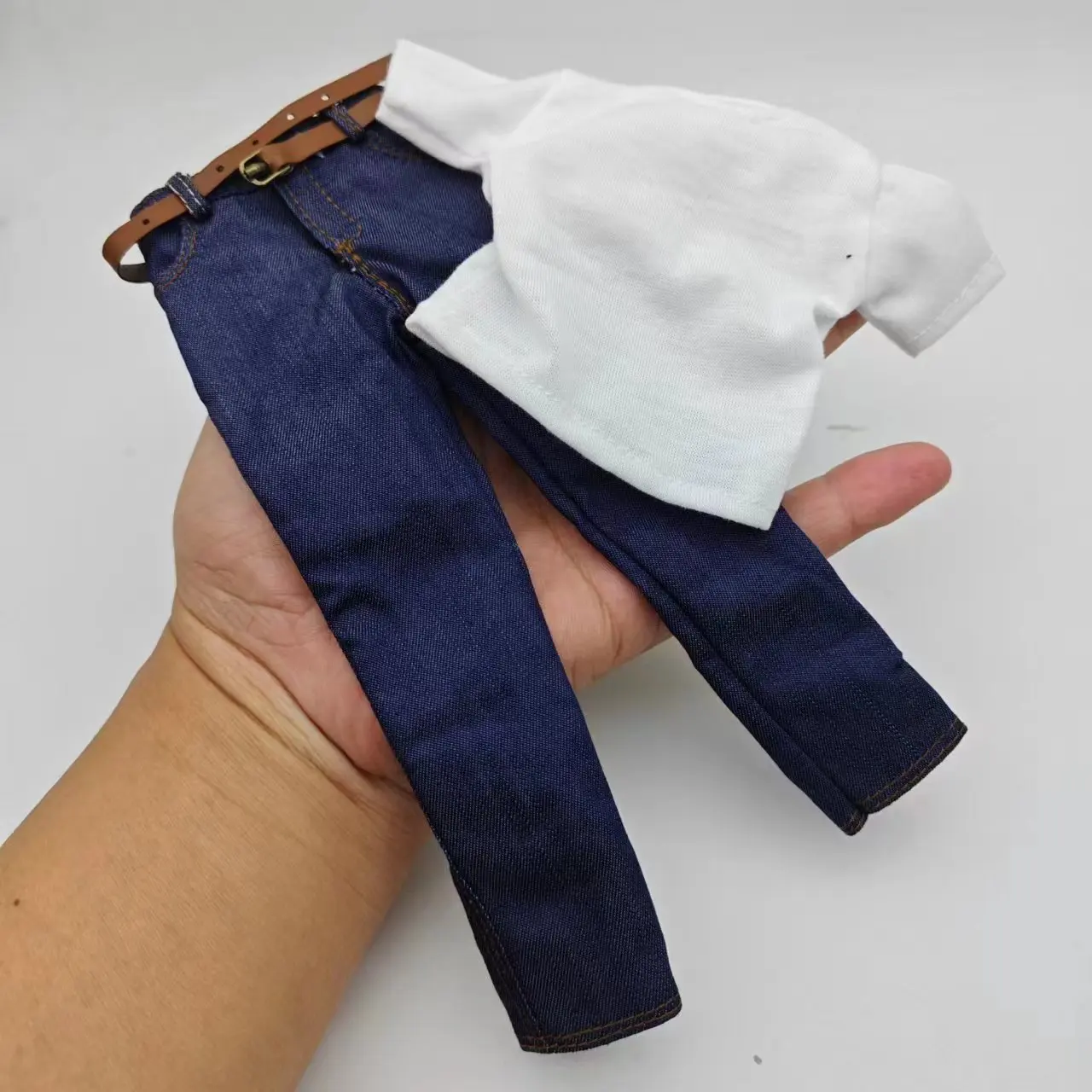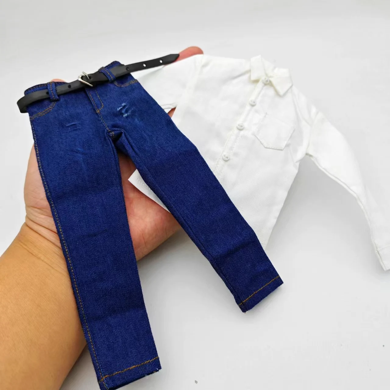Imagine your 12-inch action figure wearing this realistic casual clothing set, bringing your collection to life with authentic style. Crafted with attention to detail, the white T-shirt features a soft, cotton-like fabric texture, fitting perfectly to the figure’s proportions with short sleeves and a classic crew neckline. Paired with the deep blue jeans, detailed yellow-orange stitching adds contrast along the seams, pockets, and waistband, highlighting the garment’s realism. The included brown belt with a tiny, gold-colored buckle completes the look, giving your figure a polished, everyday appearance. Made from high-quality flannel material, these clothes are designed to enhance the visual appeal of your display or diorama. Elevate your collection with this versatile, meticulously crafted outfit suitable for various scene setups.
