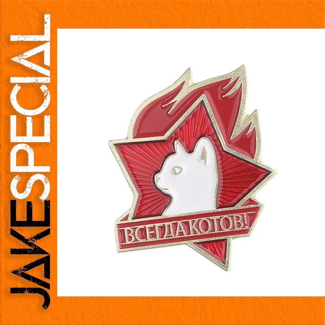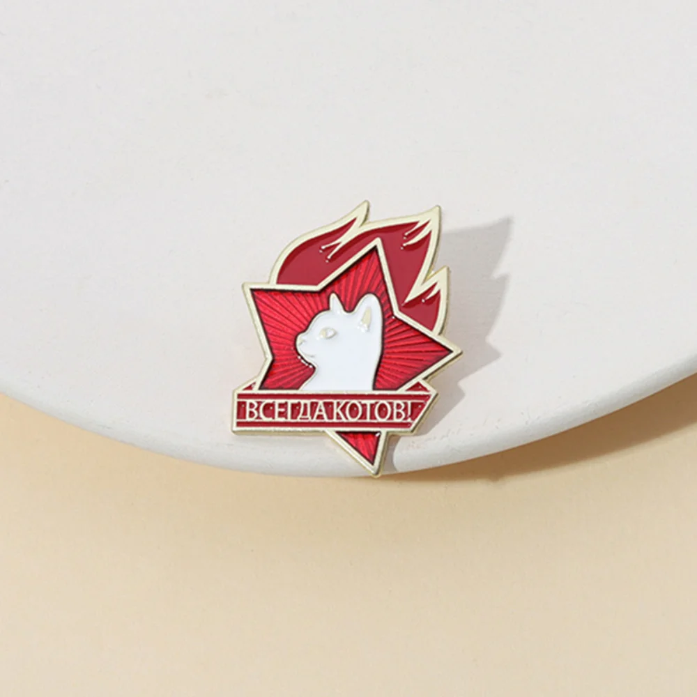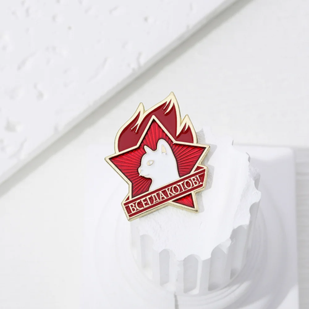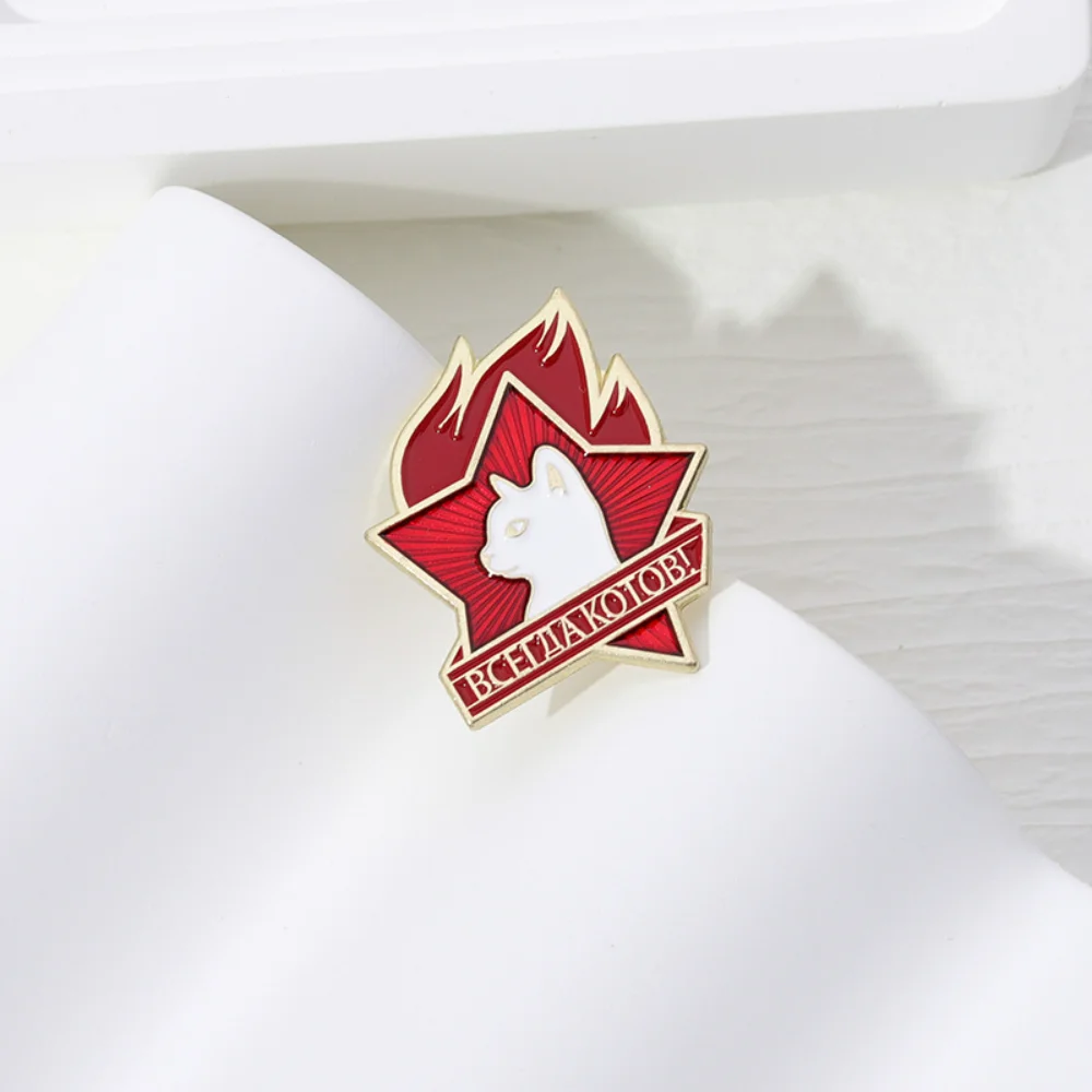 Add a whimsical touch to your outfit with this custom enamel pin designed as a playful cat star brooch. Featuring a bold red background, this vibrant accessory showcases a star shape surrounded by stylized flame-like motifs. At its heart lies a white silhouette of a cat's profile, elegantly crafted with simple lines, embodying a trendy style. The metallic gold outline enhances its sophistication, making it an eye-catching addition to jackets, backpacks, and hats. Measuring approximately 2.5 cm in height and 3 cm in width, its durable alloy metal construction ensures it remains lightweight for easy wear.