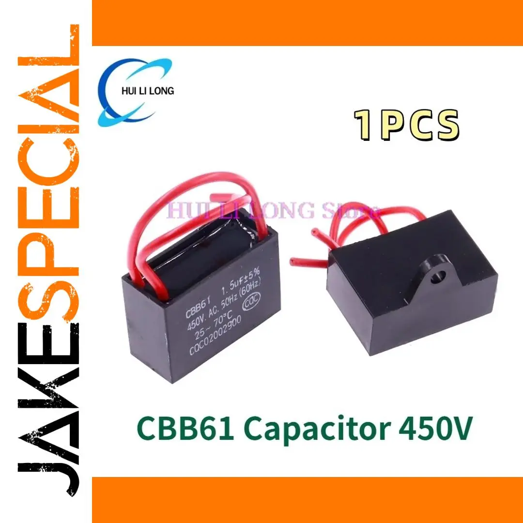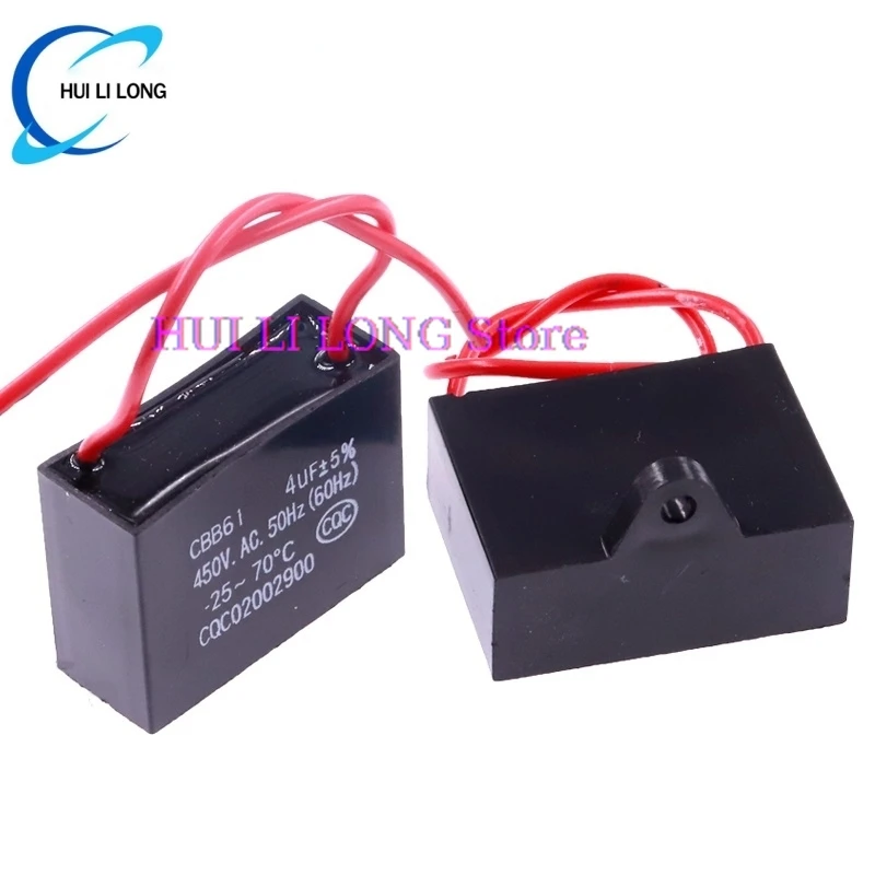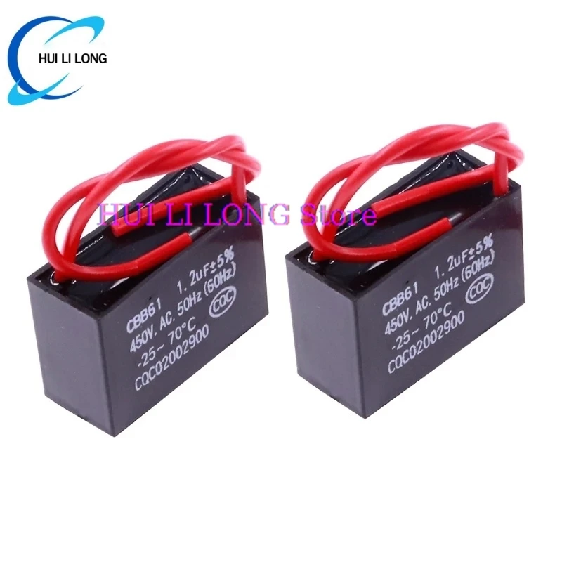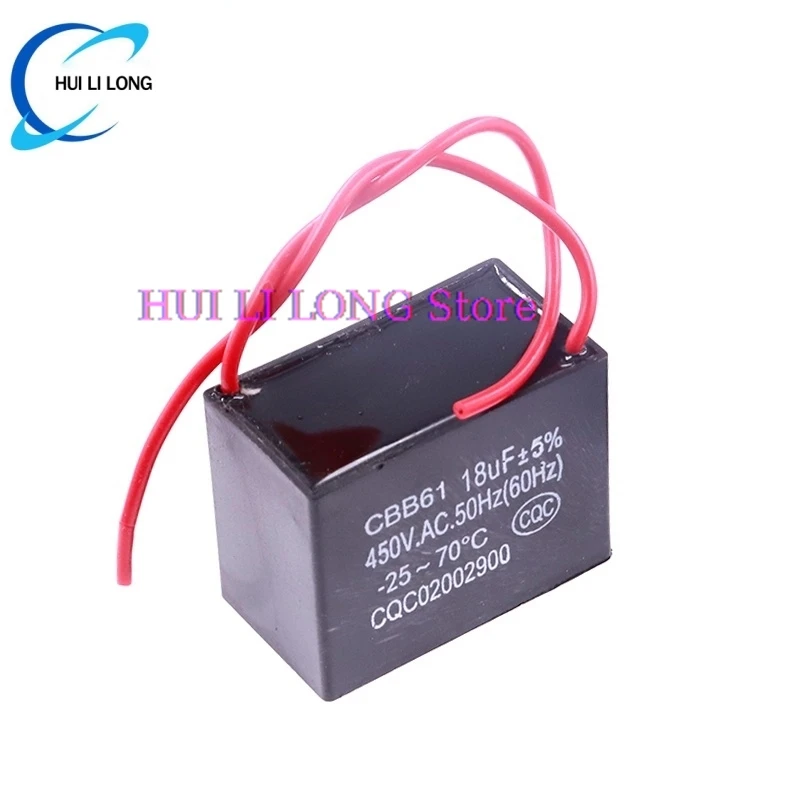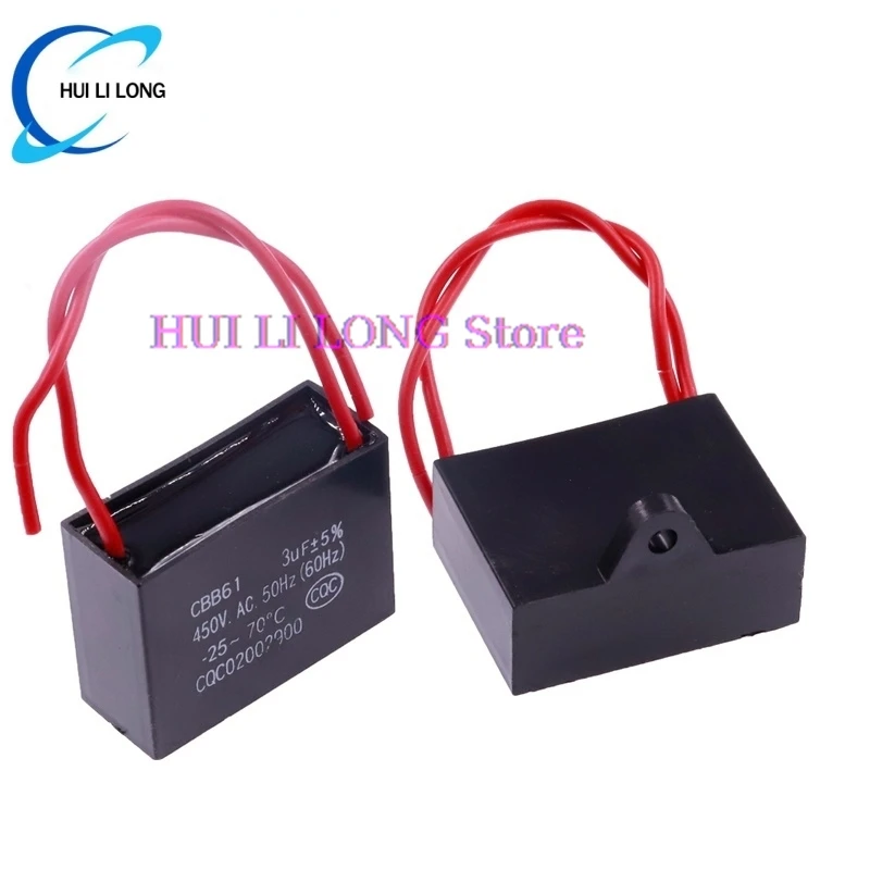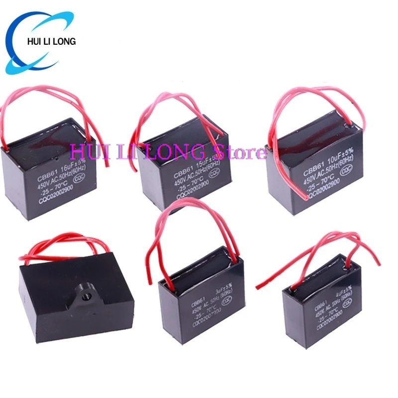 This sleek, black CBB61 fan capacitor rated at 450VAC features a durable fixed structure with through-hole packaging, polypropylene film dielectric, and an allowable tolerance of ±5%. Designed for single-phase AC motors operating at 50/60Hz, it offers capacitance options including 1UF, 1.2UF, 1.5UF, 2UF, 2.5UF, 3UF, 4UF, 5UF, 6UF, and 10UF. With high stability, long life, and self-healing capabilities, it is ideal for use in fans, ceiling fans, range hoods, and blowers. Operating efficiently within a temperature range of -45℃ to 85℃, this capacitor guarantees reliable performance in demanding electrical applications.