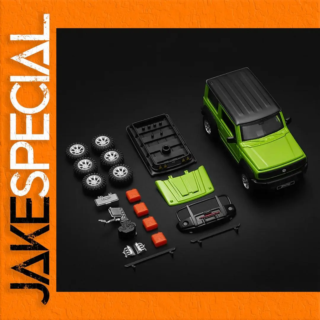 Introducing the CCA 1:32 Suzuki Jimny Assembly Version diecast model, a captivating representation of the classic off-road vehicle. This detailed alloy model, measuring 1:32 scale, features a vibrant green body with a contrasting black roof, clear windows revealing a realistic interior, and six chrome-rimmed tires mounted on a robust dark plastic chassis. The assembly set includes a matching green hood, various black components for a thorough build, and accessories like red fuel packs. With no electrical components required, this DIY model offers an engaging experience for collectors and enthusiasts alike, inviting creativity and precision in assembly.