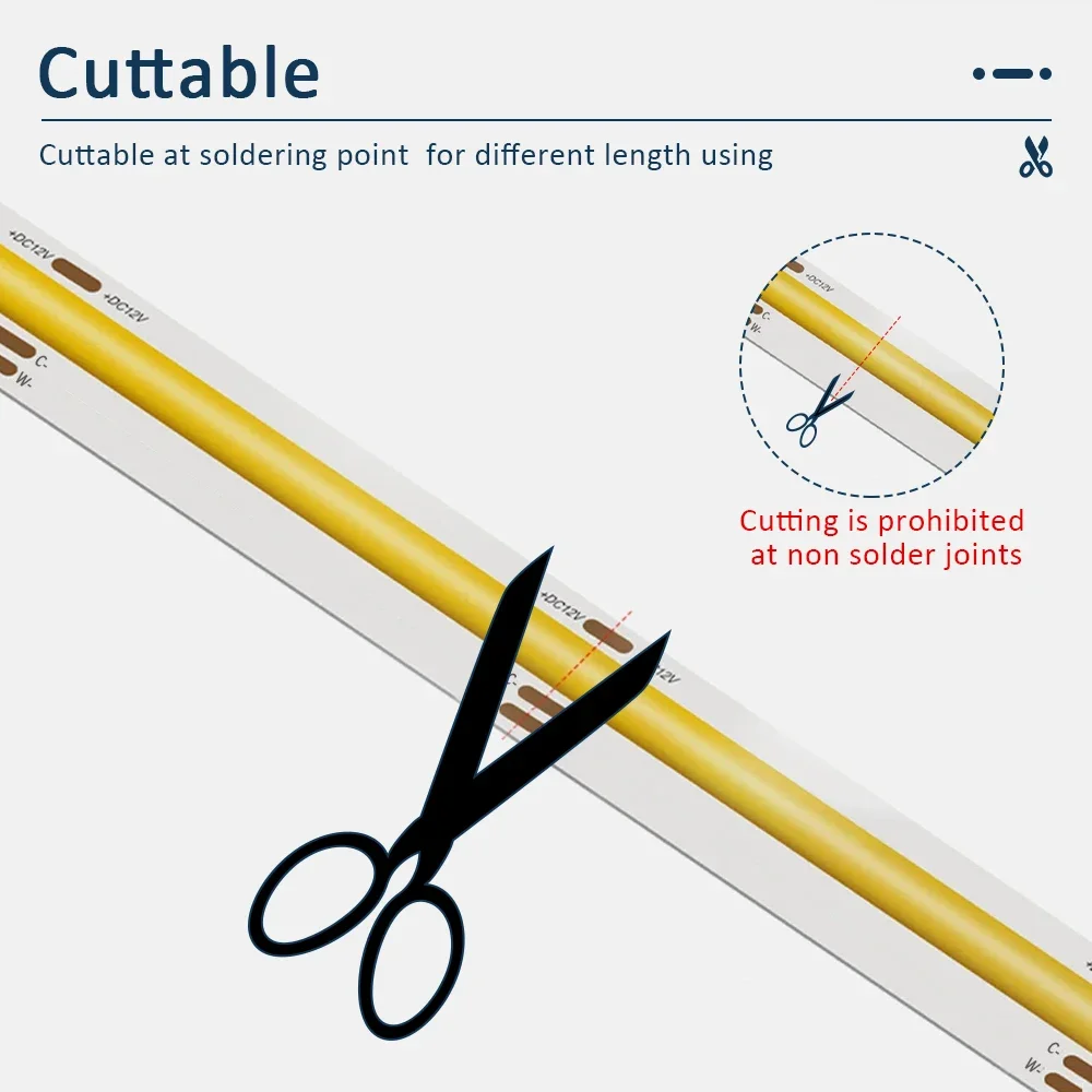 Imagine transforming your space with this sleek, flexible LED strip light that effortlessly adapts to your mood and style. Designed with high-density COB LEDs, it provides bright, even illumination without dark spots. Its soft, 10mm wide circuit board ensures flexibility to fit any surface or shape, making installation a breeze. You can easily cut the strip at marked points to customize the length to suit your needs. With adjustable color temperature from 2700K warm white to 6500K cool white, and dimmable brightness, you control the perfect lighting atmosphere. Whether for residential, commercial, or decorative applications, this durable, long-lasting light strip combines high performance with easy usability, elevating any indoor environment with quality illumination.