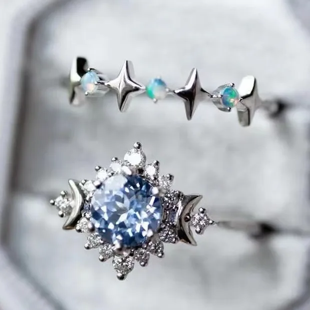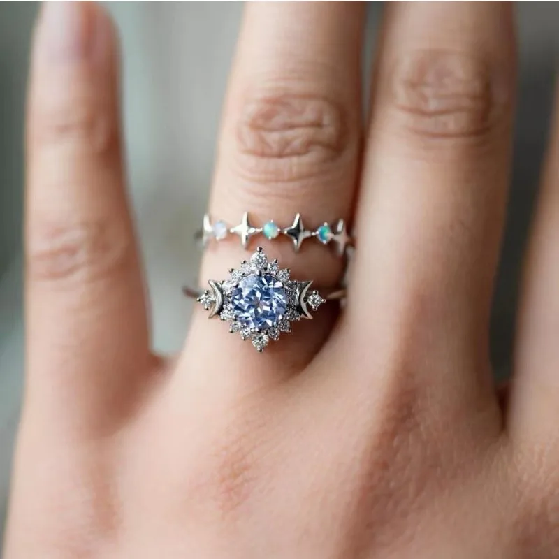 Imagine yourself wearing this enchanting ring at your next special event or daily outing, catching everyone's eye with its sparkling blue stones and trendy celestial motifs. Its versatile design allows you to express your unique sense of style effortlessly, making it an excellent addition to your jewelry collection or a thoughtful gift for someone special. Crafted for comfort and fashion, this ring is made to become a favorite accessory. Whether celebrating love, friendship, or simply your personal style, this piece will surely enhance your look and boost your confidence every time you wear it.