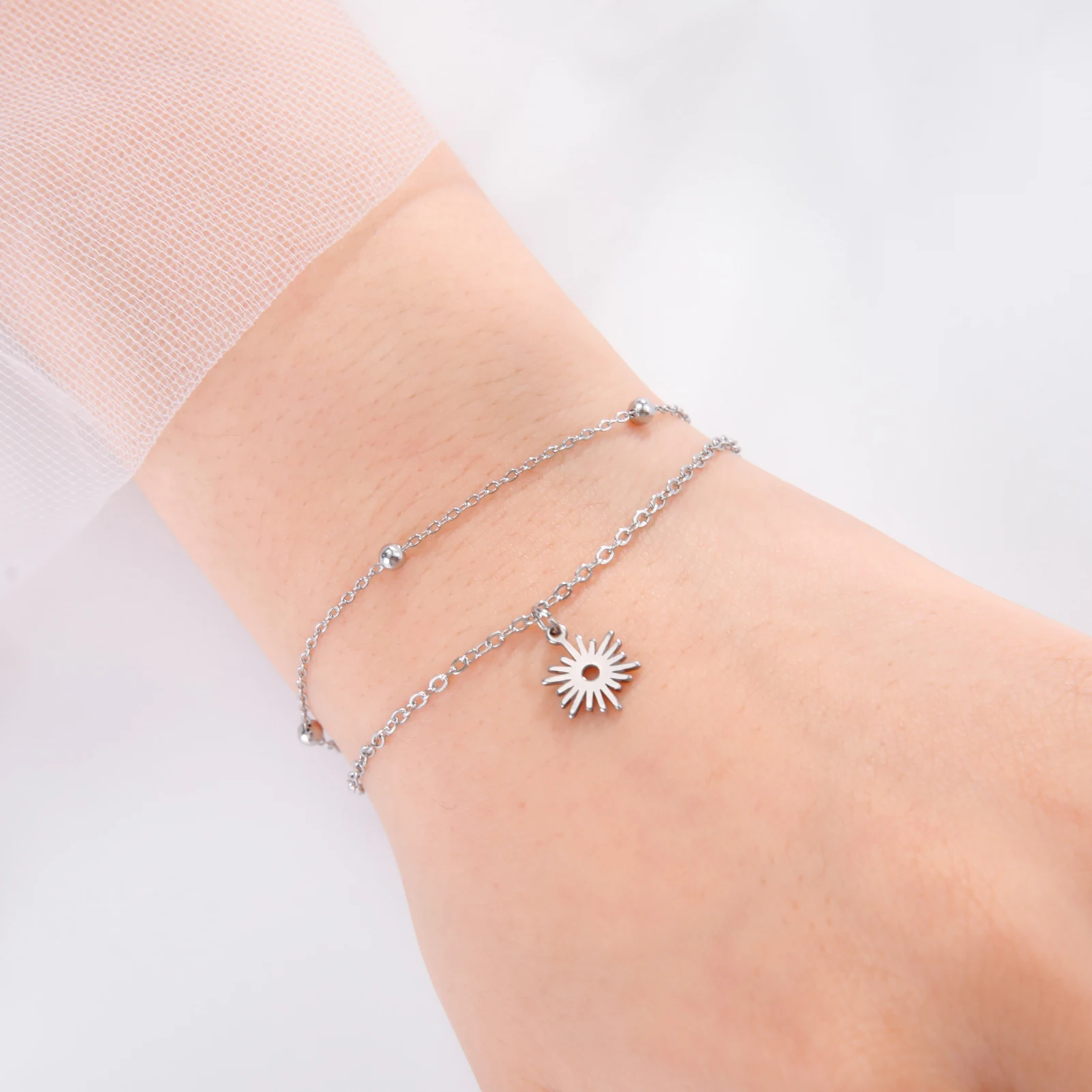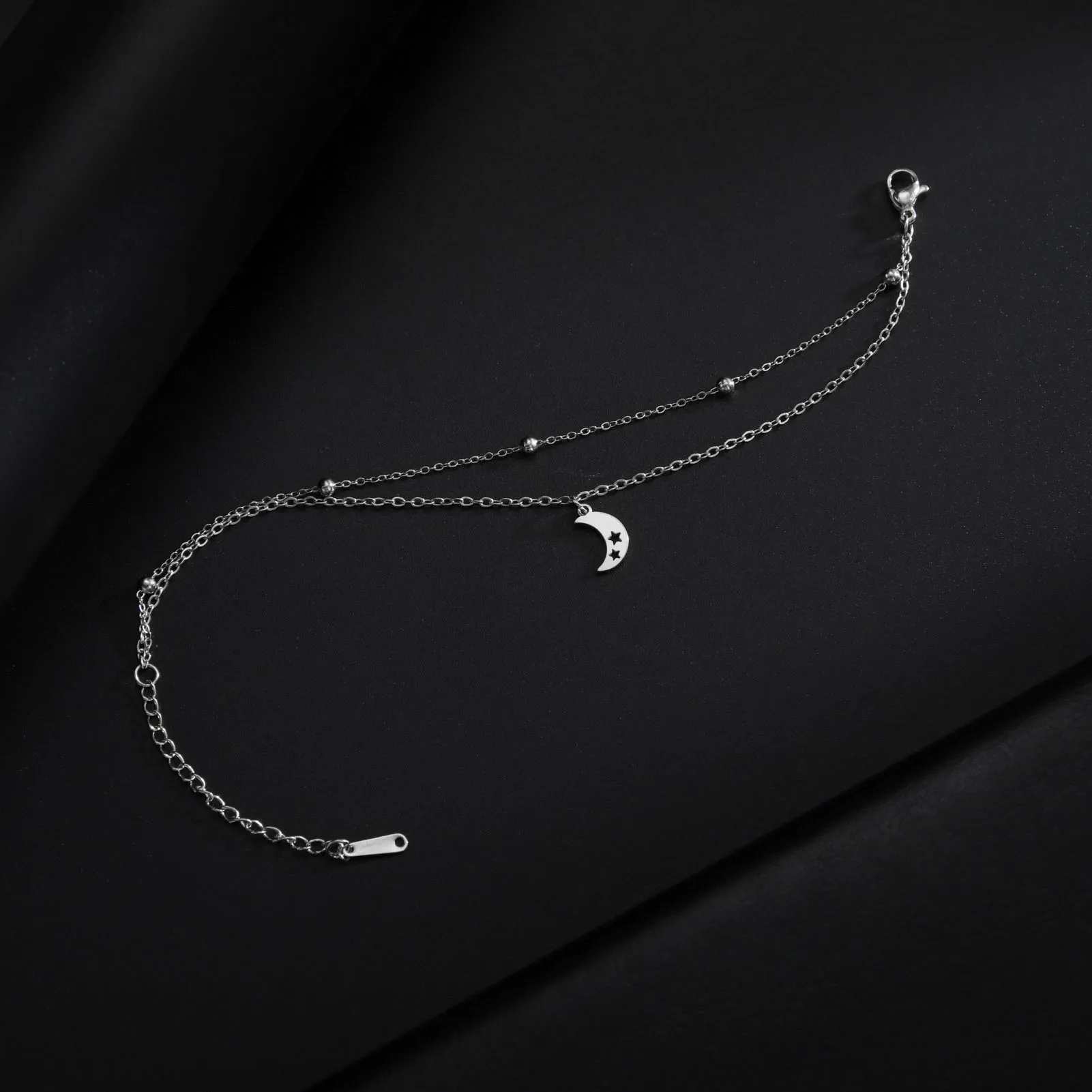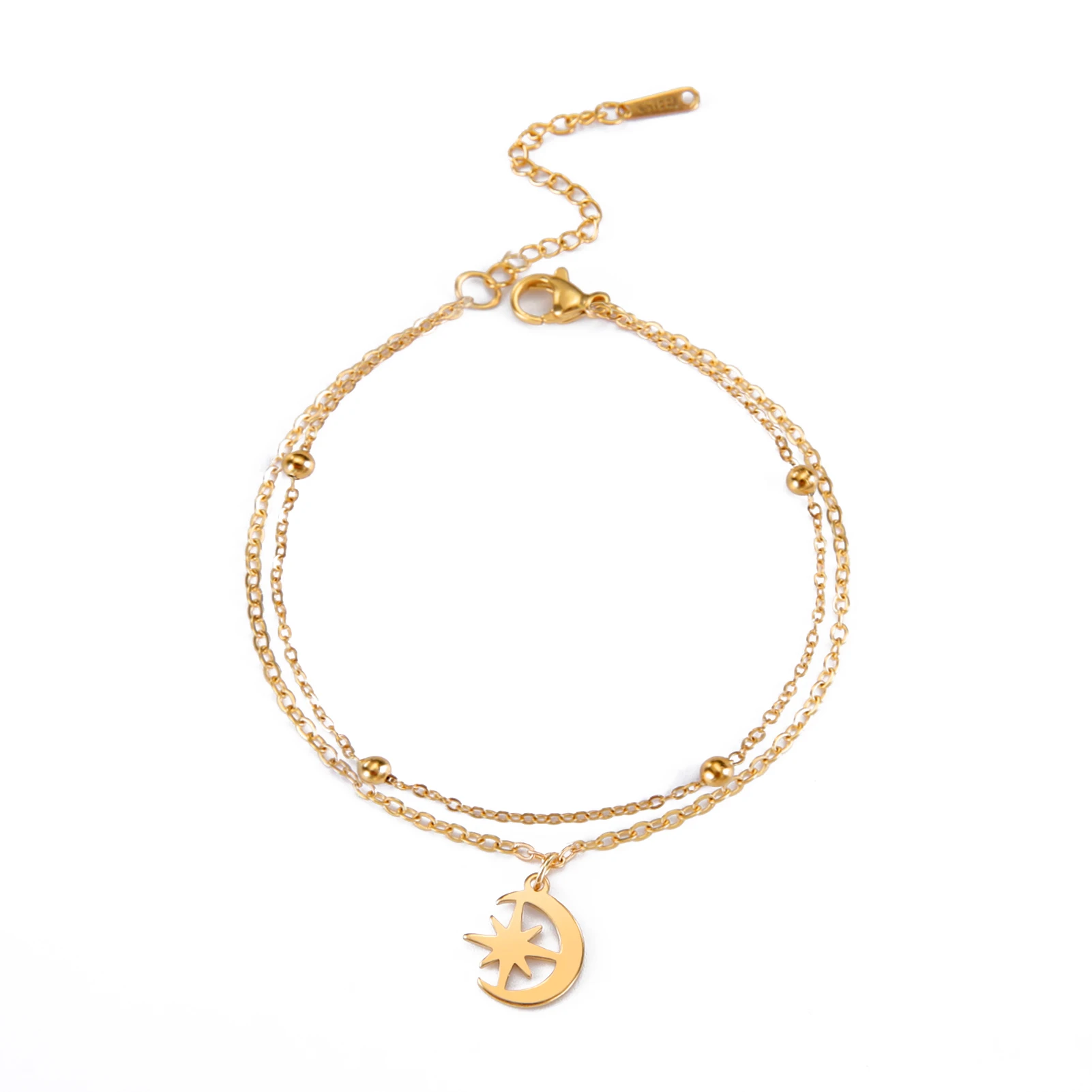 Enhance your style with this elegant double-layer stainless steel bracelet featuring charming moon, star, and sun charms available in steel and gold plating. Adjustable from 17 to 22 cm with secure lobster clasp closures, it offers a delicate, lightweight design resistant to rust, corrosion, fading, and deformation. Perfect for daily wear or special occasions like anniversaries, engagements, parties, or birthdays, this versatile accessory is suitable for women and girls seeking a trendy yet timeless piece that complements any outfit and occasion.