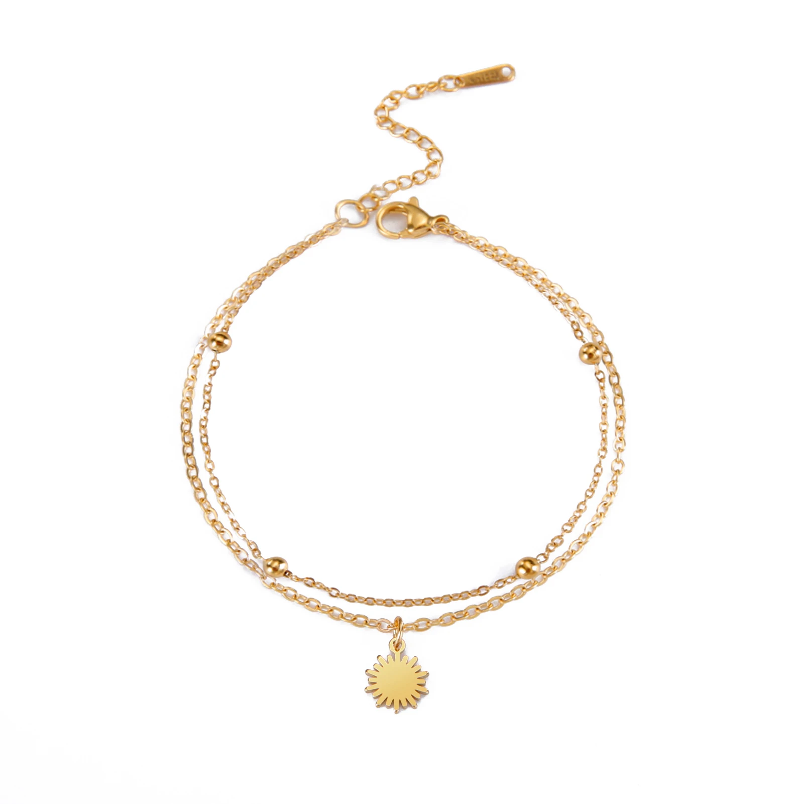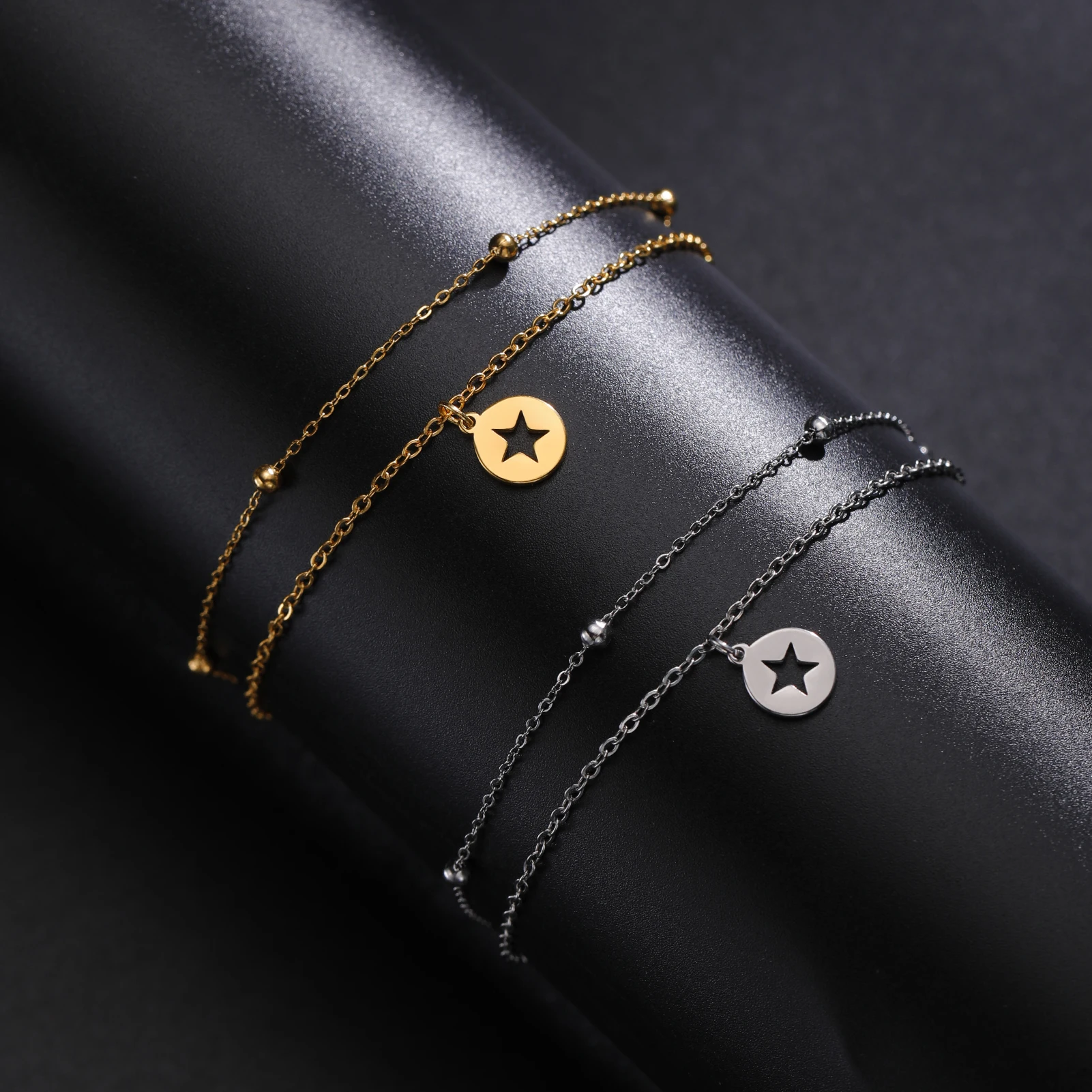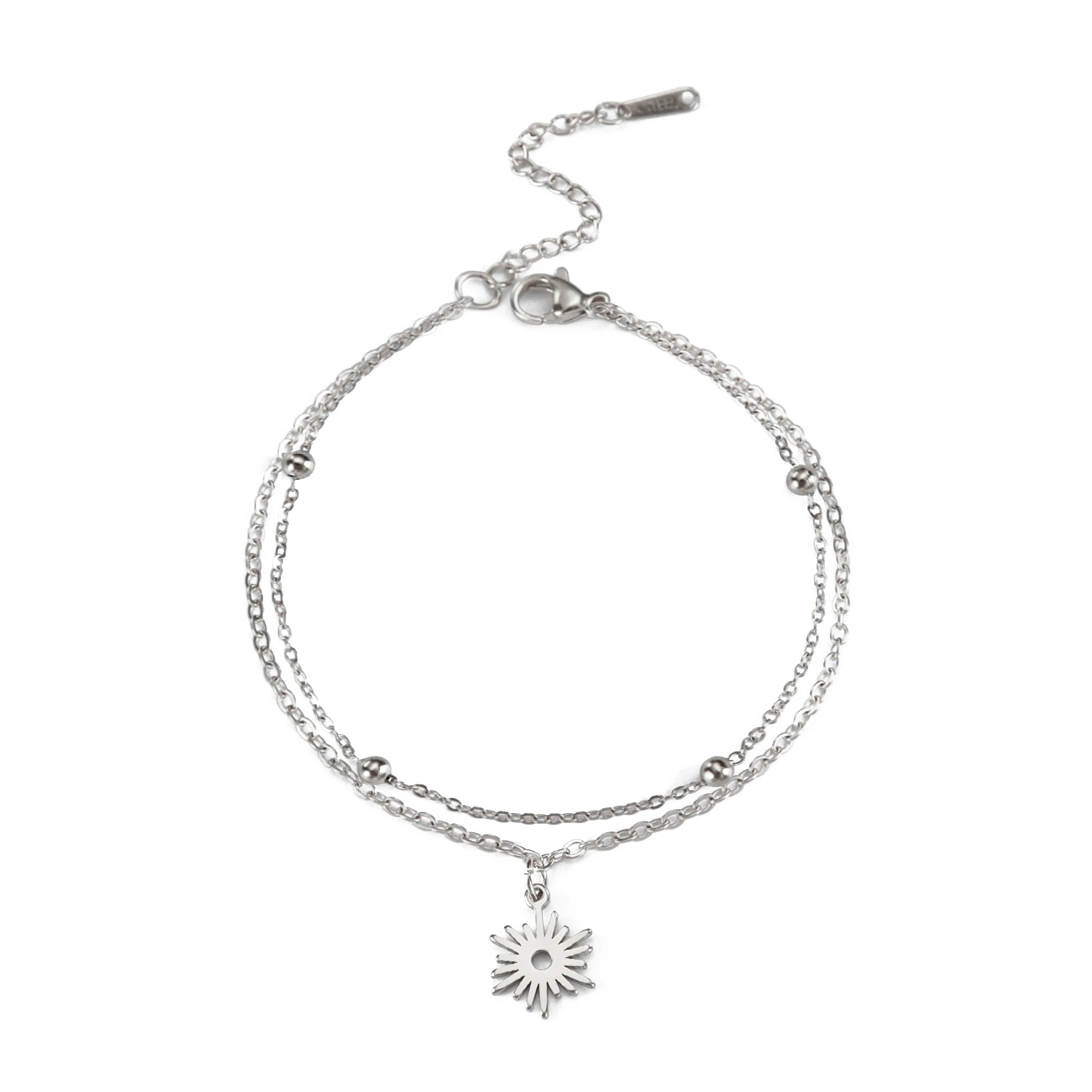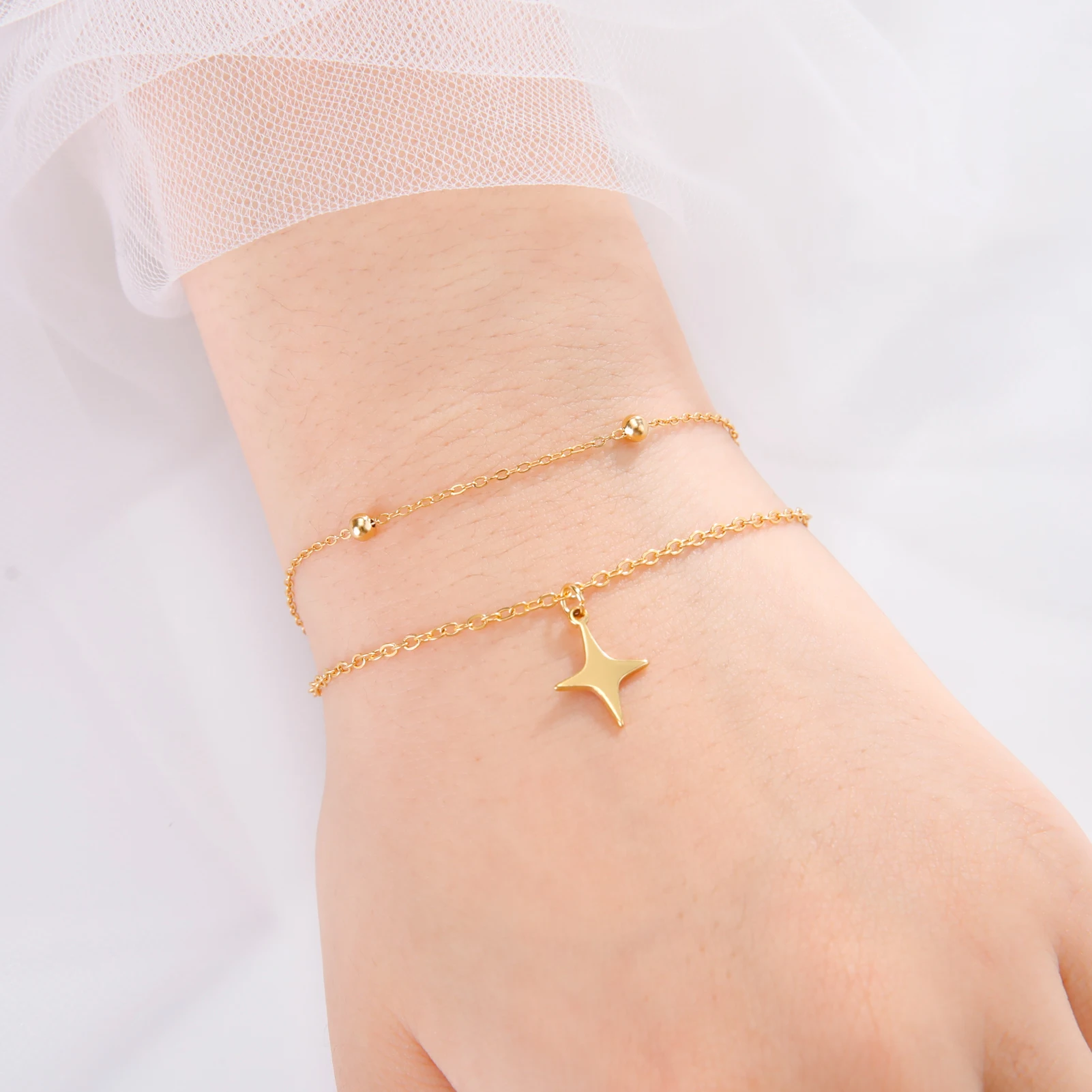 Enhance your style with this elegant double-layer stainless steel bracelet featuring charming moon, star, and sun charms available in steel and gold plating. Adjustable from 17 to 22 cm with secure lobster clasp closures, it offers a delicate, lightweight design resistant to rust, corrosion, fading, and deformation. Perfect for daily wear or special occasions like anniversaries, engagements, parties, or birthdays, this versatile accessory is suitable for women and girls seeking a trendy yet timeless piece that complements any outfit and occasion.