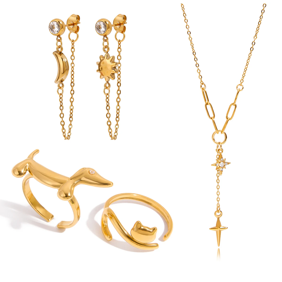 Imagine elevating your style with this eye-catching celestial jewelry set, crafted from durable stainless steel with a radiant gold-colored finish. The bold necklace features chunky rectangular chain links and charming star charms—one shiny with a gemstone center and a larger, elongated star—adding a modern touch. The elegant drop earrings showcase celestial motifs, with a crescent moon and radiating sun dangling from delicate chains, accented with subtle gemstones for a hint of sparkle. Complementing these are playful rings, with one designed as a cartoonish dog with a gemstone eye, and a sleek cat with a coiled tail, blending whimsy and elegance effortlessly. Wear this set for any occasion and let your unique style shine confidently. This celestial collection seamlessly combines fun motifs with luxurious shine, perfect for expressing your personality.