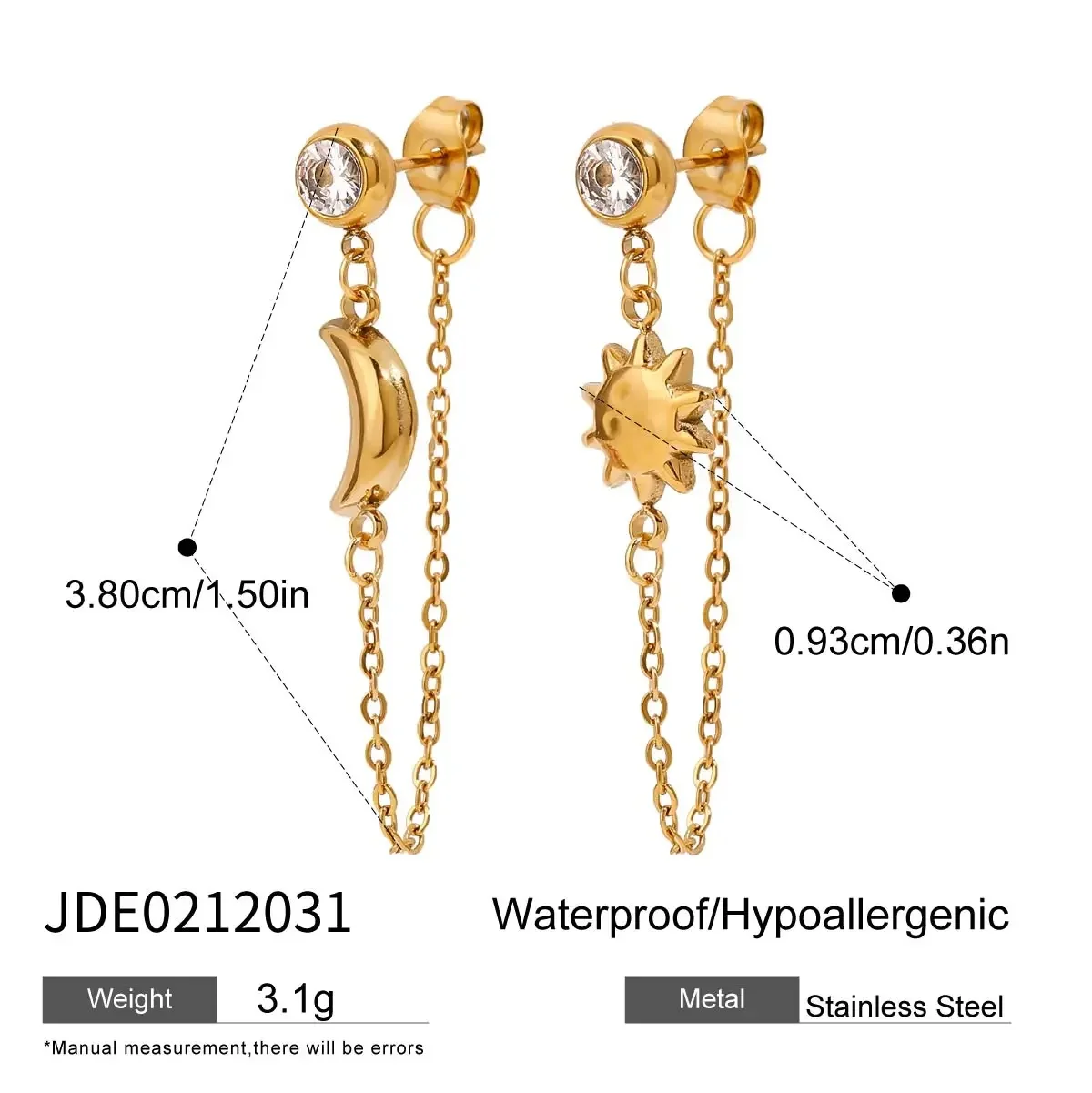 - Drop earrings incorporate celestial symbols—a crescent moon and a radiating sun—hanging from dainty chains, decorated with subtle gemstones to add delicate sparkle and mystical appeal.