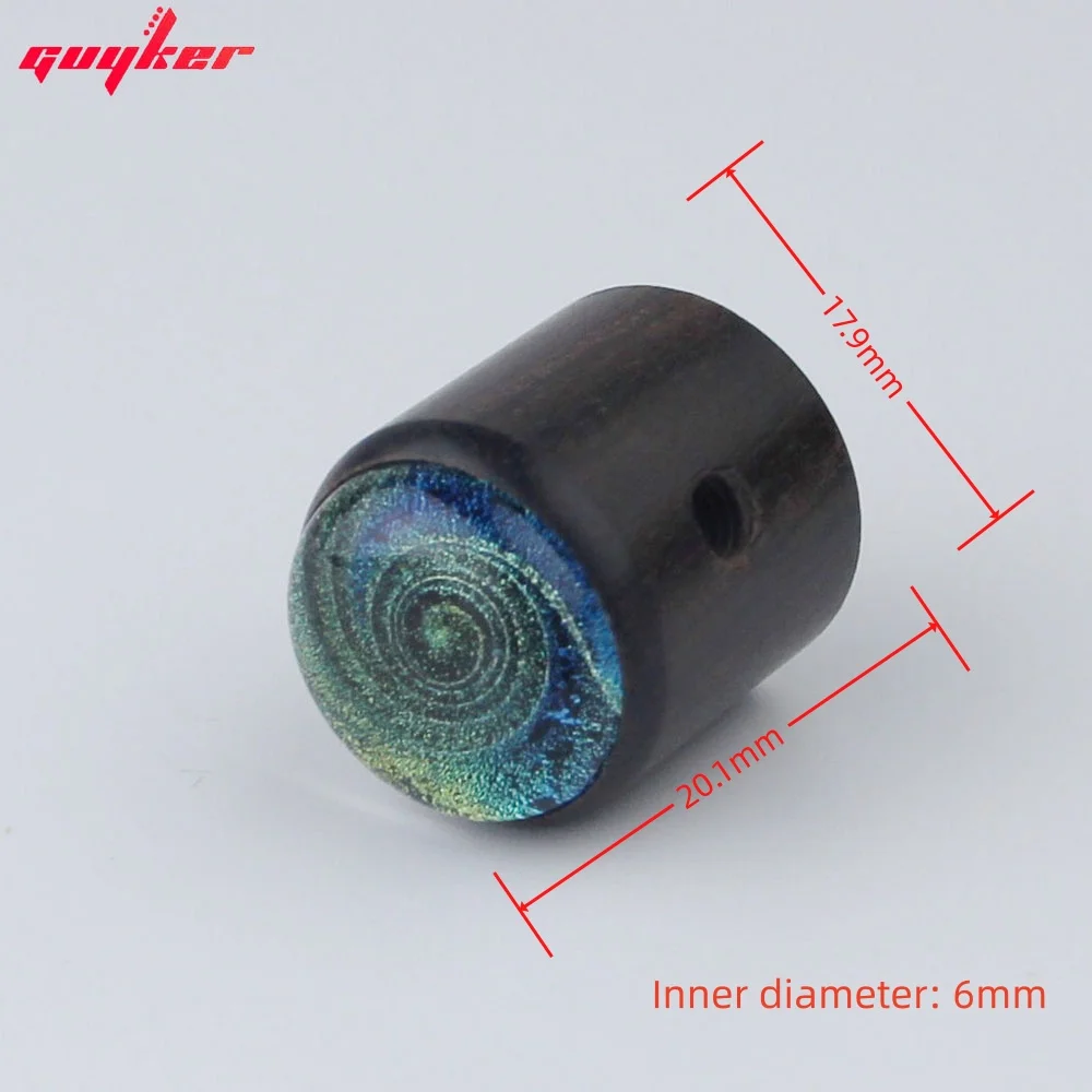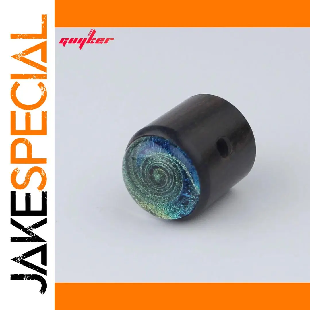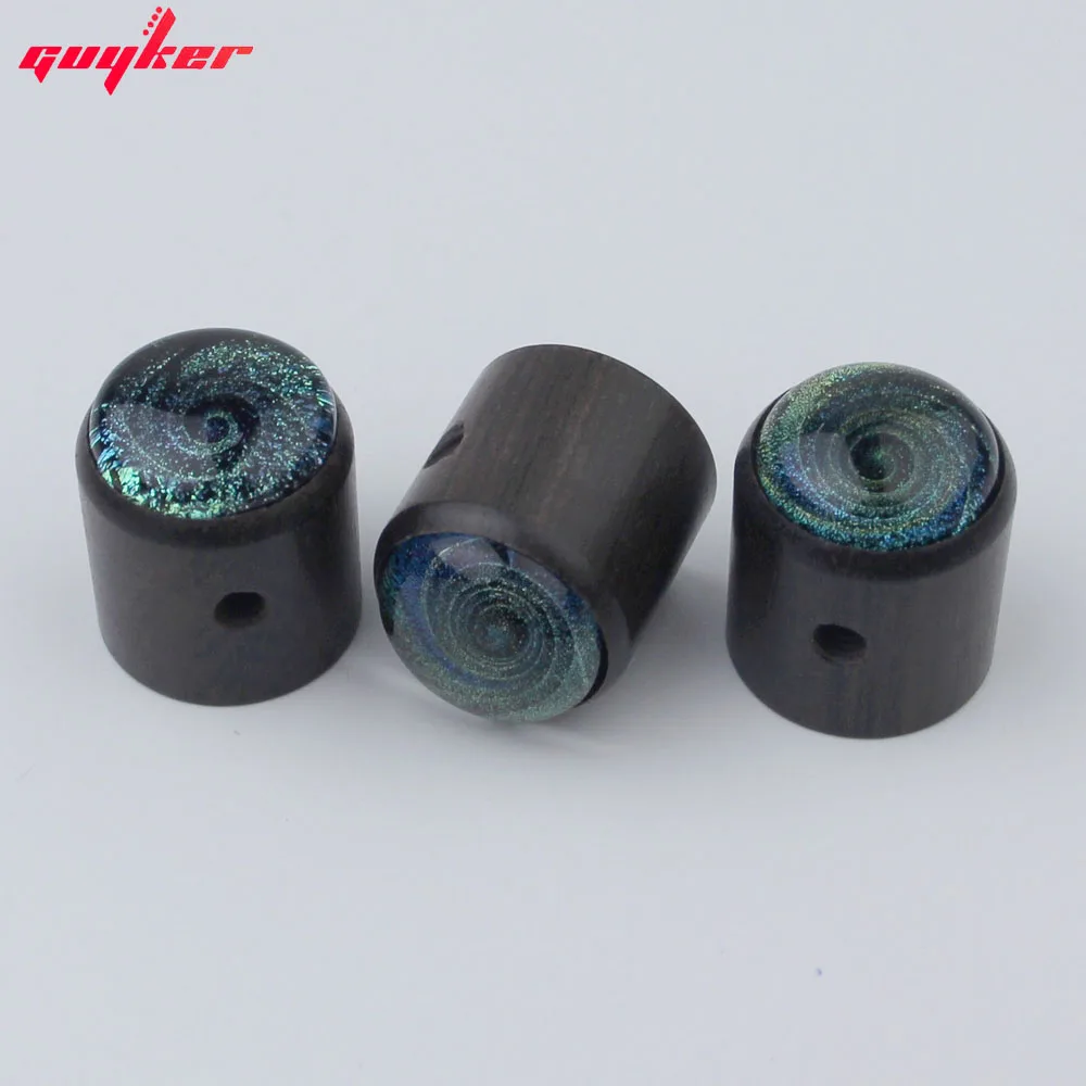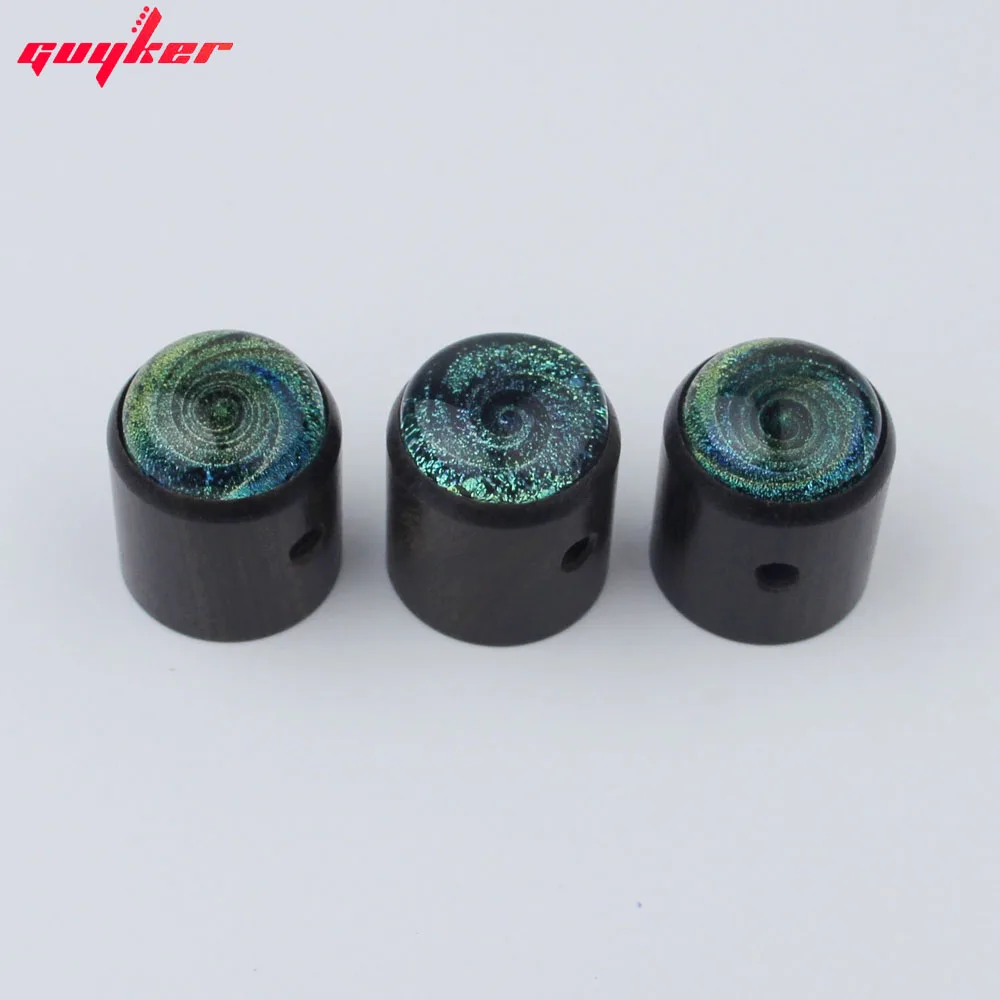 Enhance your guitar or bass with this stylish wooden potentiometer knob featuring a captivating starry sky design. Made from polished black wood, it showcases a swirling galaxy pattern in shades of blue and green with iridescent glitter, creating a shimmering cosmic effect. Designed with a 6mm inner diameter, this knob combines natural elegance with celestial charm, adding a unique visual touch to your instrument. Available in packs of 1, 2, or 3 pieces, it securely fits standard electronic controls with a discreet set screw hole for easy installation. Perfect for musicians seeking both functional performance and aesthetic appeal.