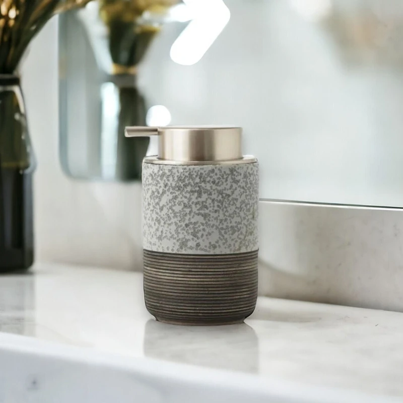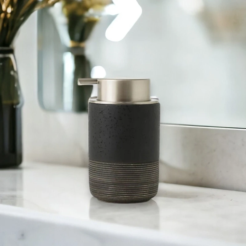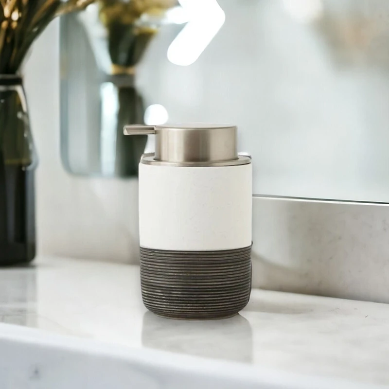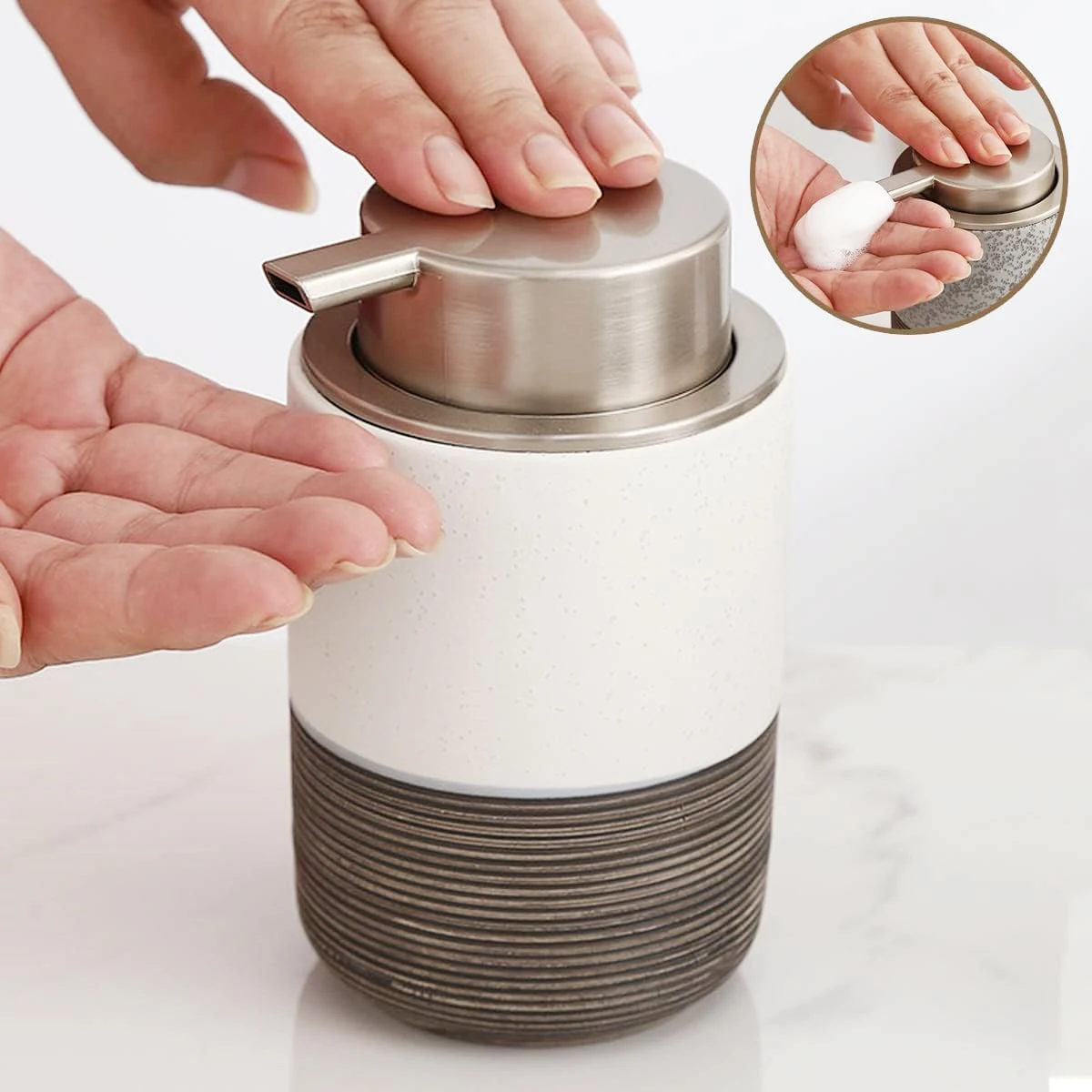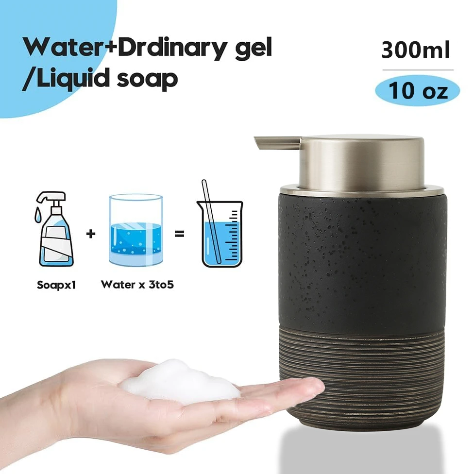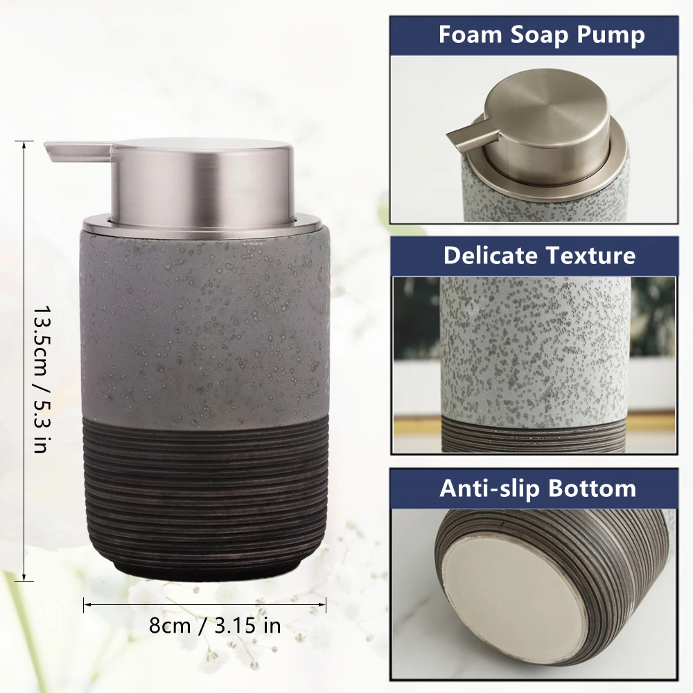 Enjoy a sleek, modern touch to your bathroom or kitchen with this ceramic foaming hand soap dispenser. Designed to blend minimalism with functionality, it features a smooth ceramic body available in elegant black, white, or gray to match any decor. The dispenser’s refined cylindrical shape, combined with textured or speckled finishes, enhances its aesthetic appeal. The brushed stainless steel foam pump ensures effortless soap dispensing while resisting corrosion and rust. With a generous 300ml capacity, it’s perfect for liquid soap, lotion, and many other fluids. Refillable, eco-friendly, and recyclable, this dispenser combines style, practicality, and sustainability. Upgrade your space with a product that reflects your good taste and organizational sense.