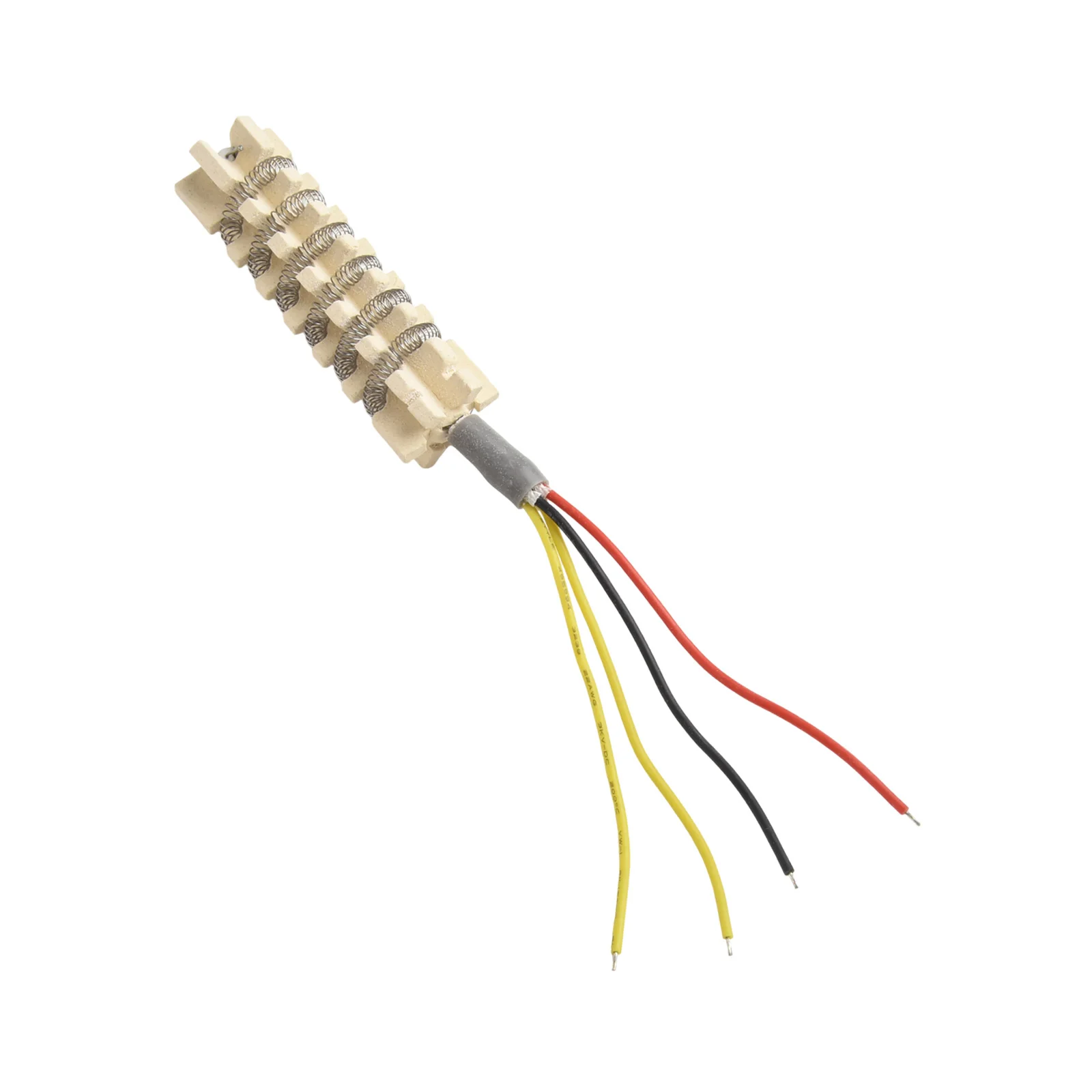 Imagine enhancing your electronic repair setup with this high-quality ceramic heating core, designed for detailed rework and soldering tasks. Its sleek, cylindrical white ceramic body features a smooth matte finish that exudes durability and precise craftsmanship. The small, evenly spaced metal coiled wires along the length of the ceramic provide efficient heat distribution while adding an intricate, professional aesthetic. Four insulated wires emerge from one end in vibrant black, red, and yellow colors, offering easy identification and connection flexibility. Whether you're adjusting temperature settings or working on delicate components, this heating element offers reliability and high performance. It seamlessly integrates with a range of jumper models, promising an efficient, durable solution for your electronic repairs.