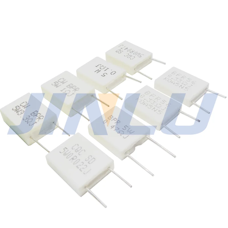 Experience reliable performance with this set of five non-inductive ceramic cement resistors, ideal for various electronic projects. Designed with durable ceramic technology, these resistors feature a sleek, rectangular white ceramic body with a smooth matte finish that exudes simplicity and durability. Their precise etched or printed resistance markings add technical charm, while extending from each end are thin, straight metallic leads that ensure secure through-hole mounting for dependable circuit connections. The resistors' minimalist design emphasizes functionality and clarity, making them a trusted choice for engineers and hobbyists alike. With resistance values spanning from 0.01Ω to 100Ω and a rated power of 5W, this set is perfect for high-precision, high-power applications demanding consistency and longevity.