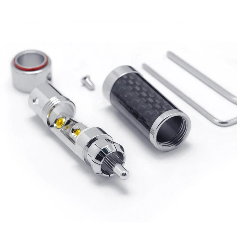 Imagine upgrading your audio setup with the this CF-102(R) Carbon Fiber RCA plugs, designed to deliver superior sound quality and reliable connections. Crafted from high-grade stainless steel with a sleek carbon fiber finish, these connectors combine durability with a modern aesthetic. The shiny metallic bands and precise engineering highlight the premium craftsmanship, ensuring optimal electromagnetic damping and vibration absorption thanks to Teflon insulation and non-magnetic rhodium-plated α-OCC conductors. Perfect for audiophiles and enthusiasts, these connectors enhance signal clarity while maintaining a stylish, high-tech look. Whether you’re assembling a new system or upgrading existing cables, this pair guarantees a premium performance and sleek appearance that complements any high-end audio equipment.