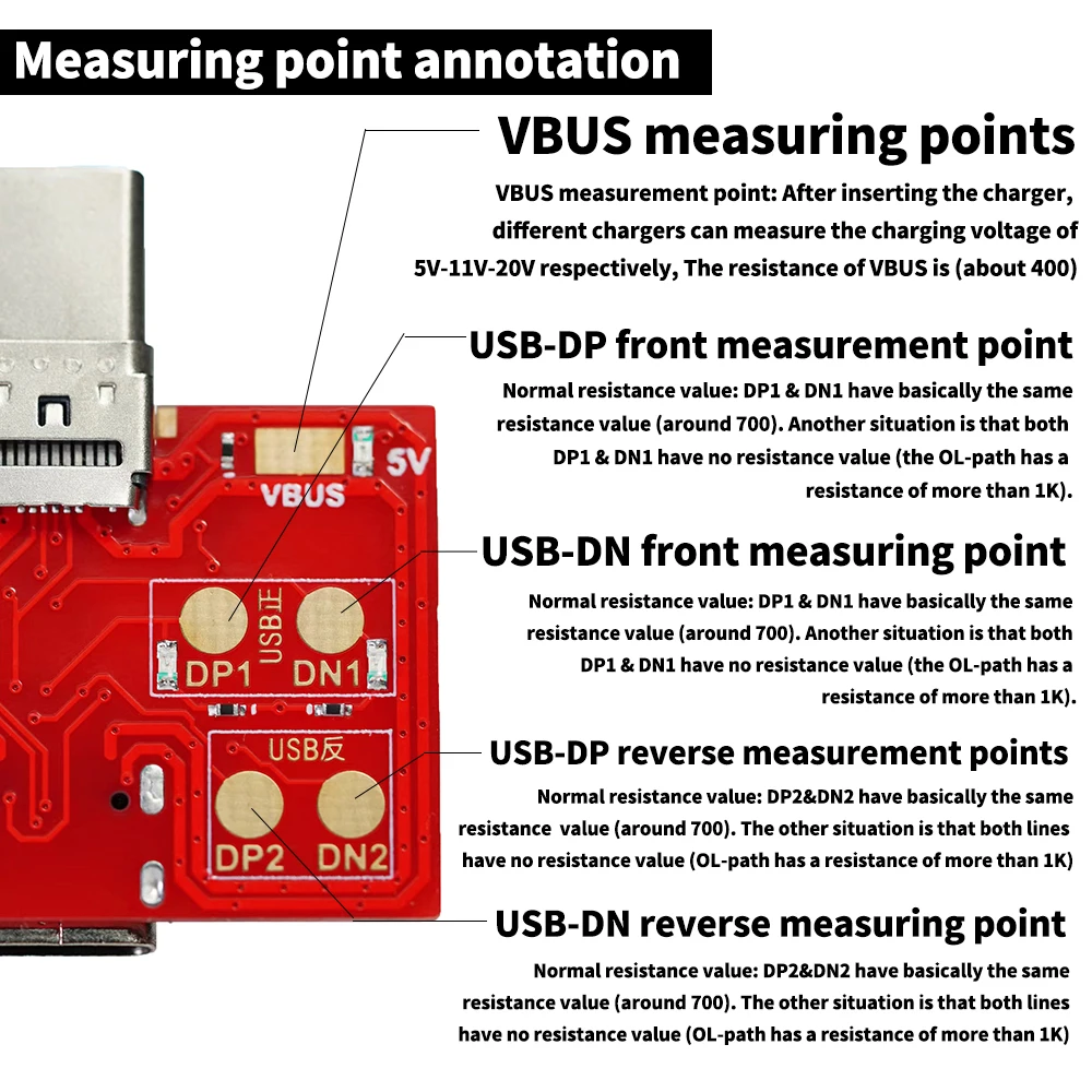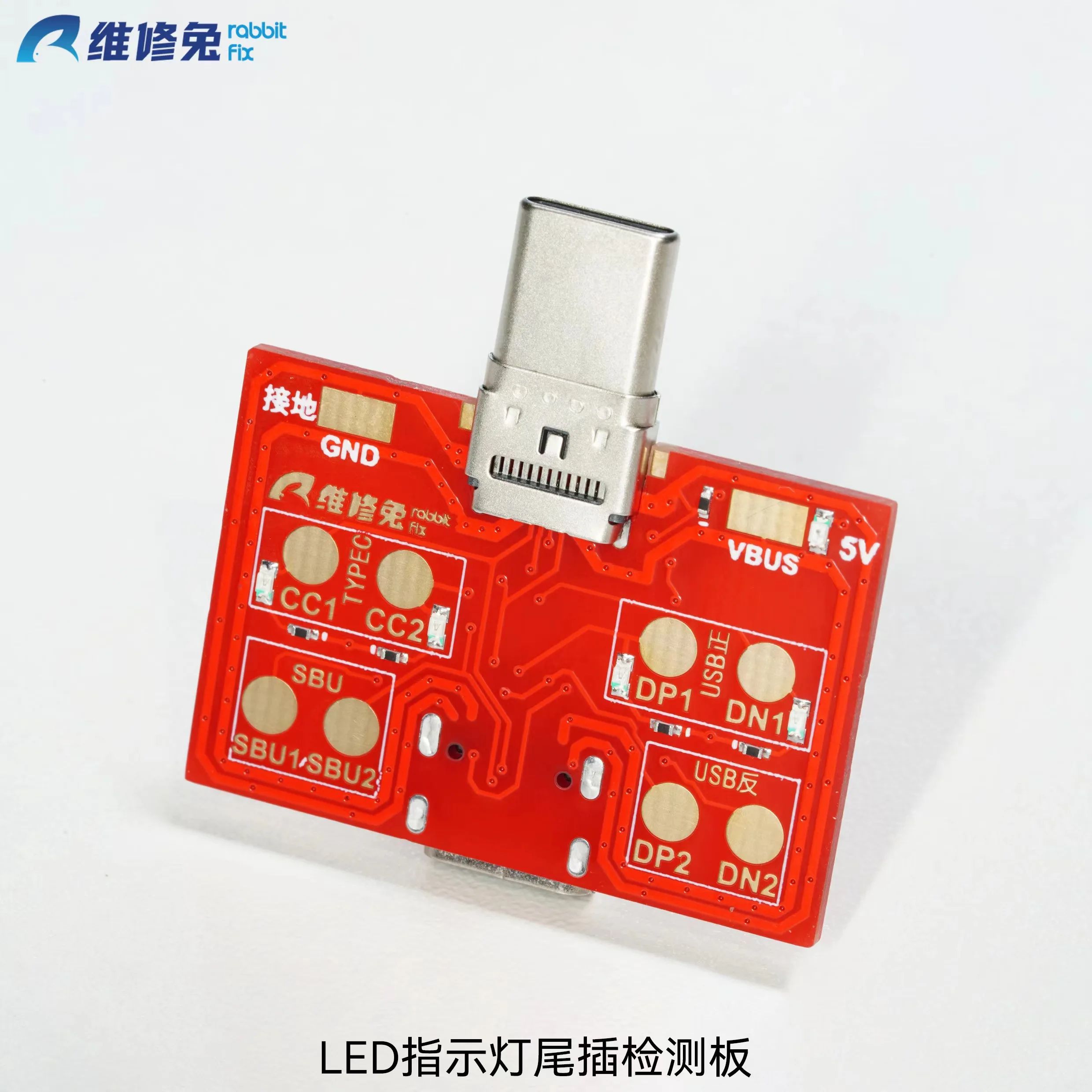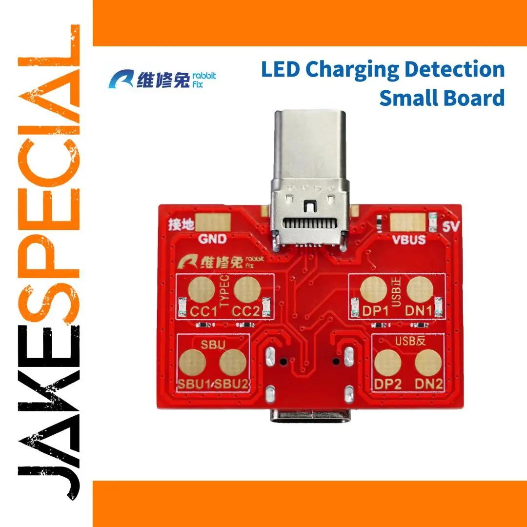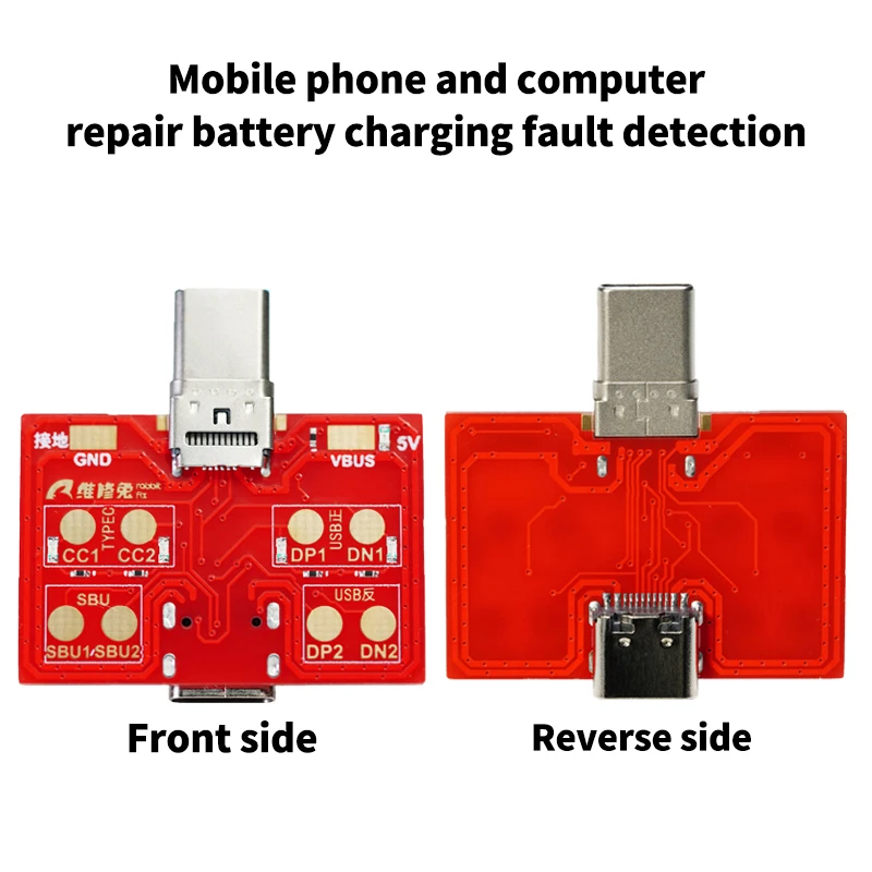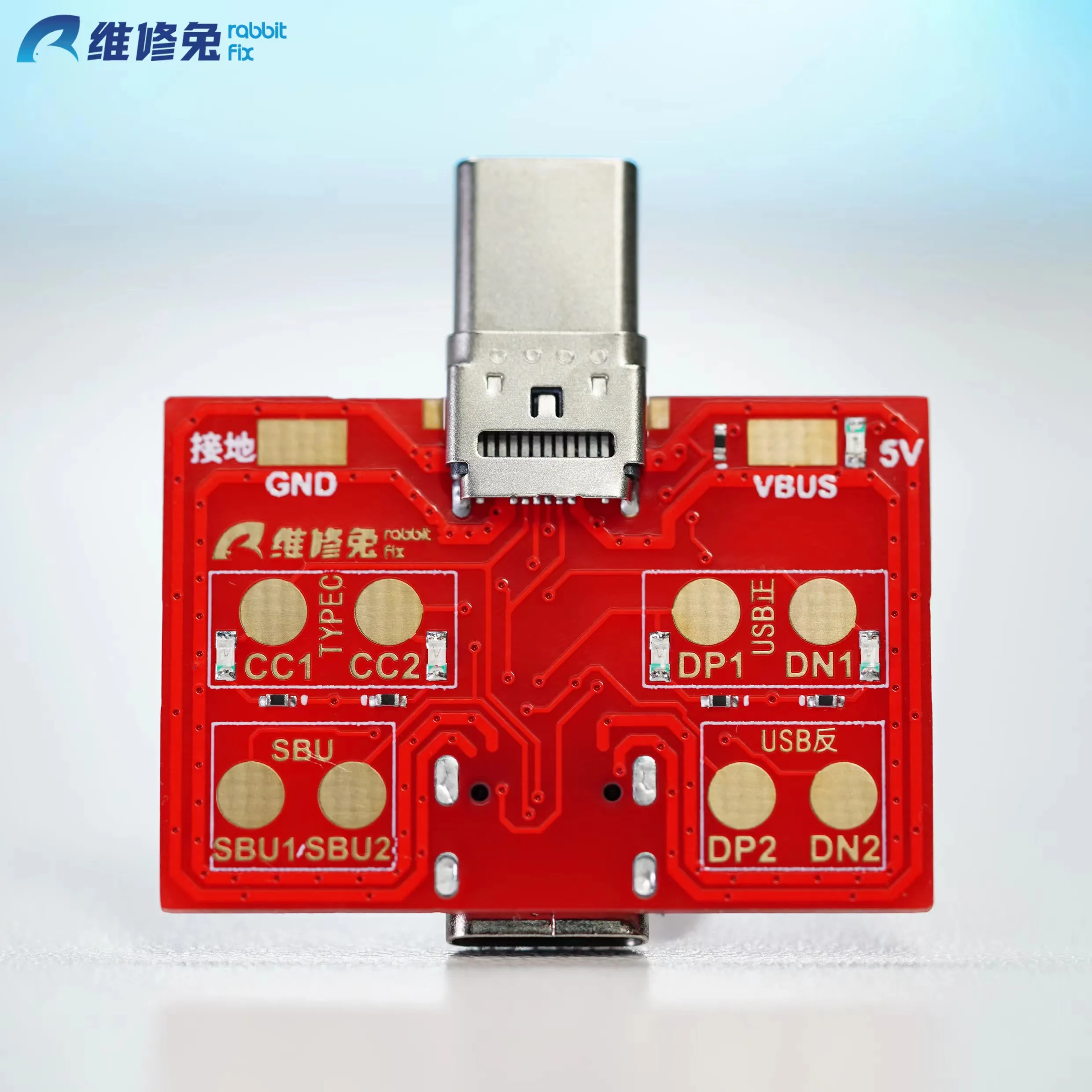 The Rabbit Fix Charging Detection Board is a compact, LED-based testing tool designed for mobile phone repair, enabling precise battery charging fault detection. Featuring measurement points for GND, VBUS, CC1, CC2, DP1, DN1, SBU1, SBU2, and reverse polarity points DP2 and DN2, this sleek red testing board is ideal for troubleshooting charging issues with compatible devices. Its minimalist yet functional design includes gold-colored contact pads and clear white silkscreen markings for easy identification and connection. Compatible with various smartphone models, this high-quality testing tool helps technicians quickly diagnose and resolve charging faults, ensuring reliable device operation.