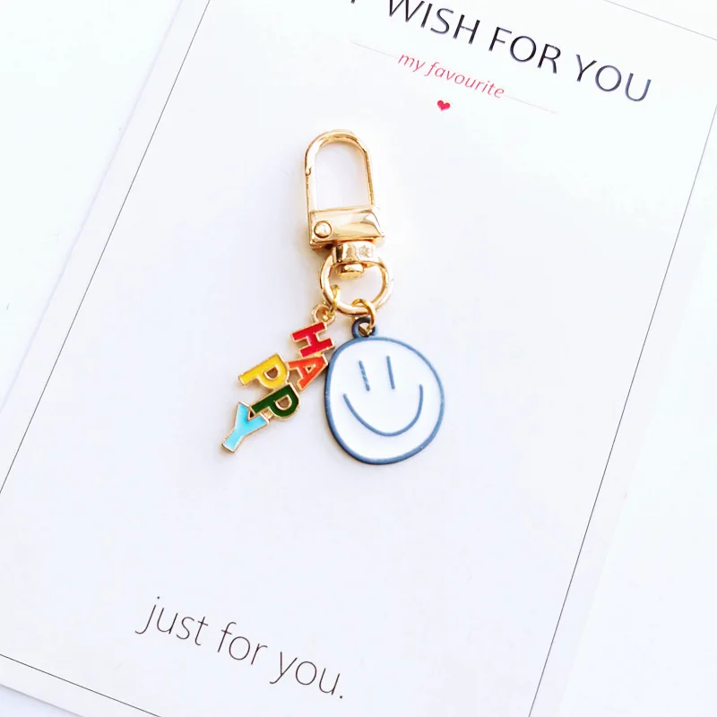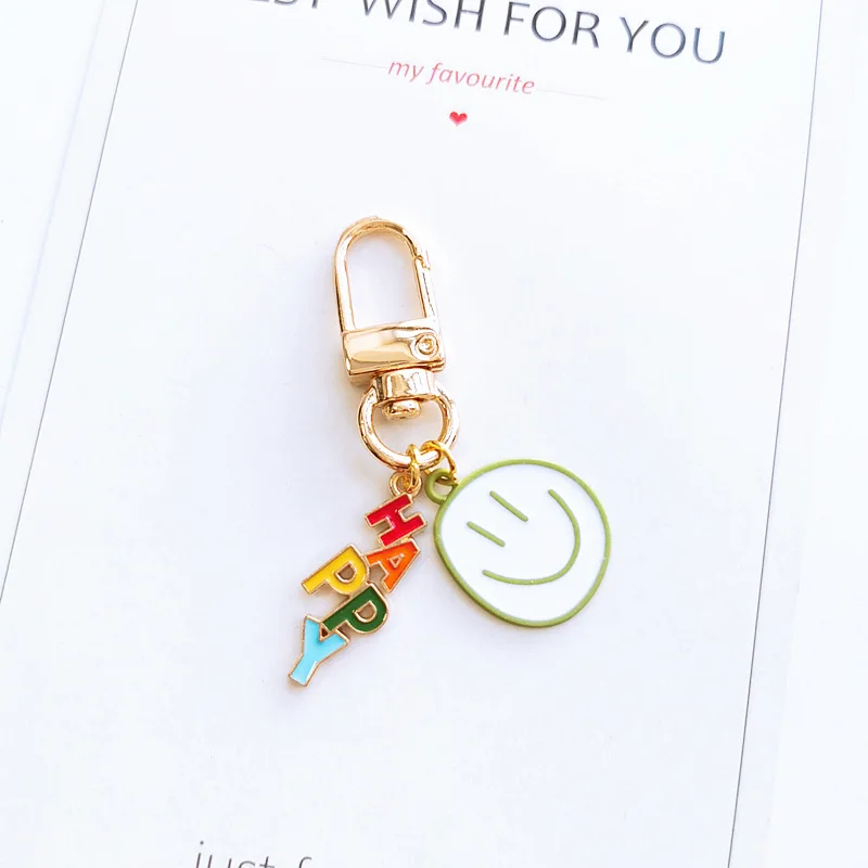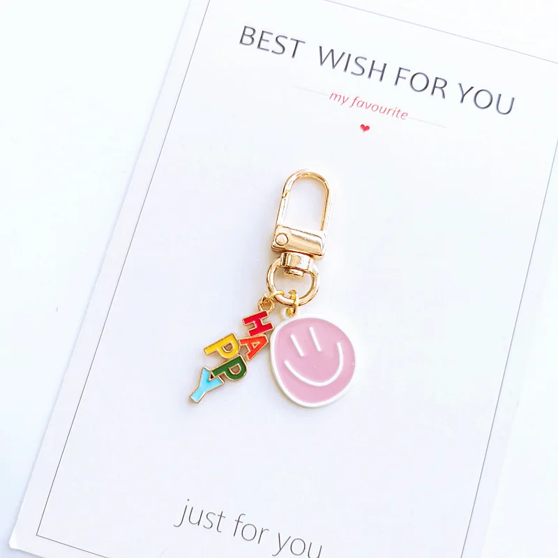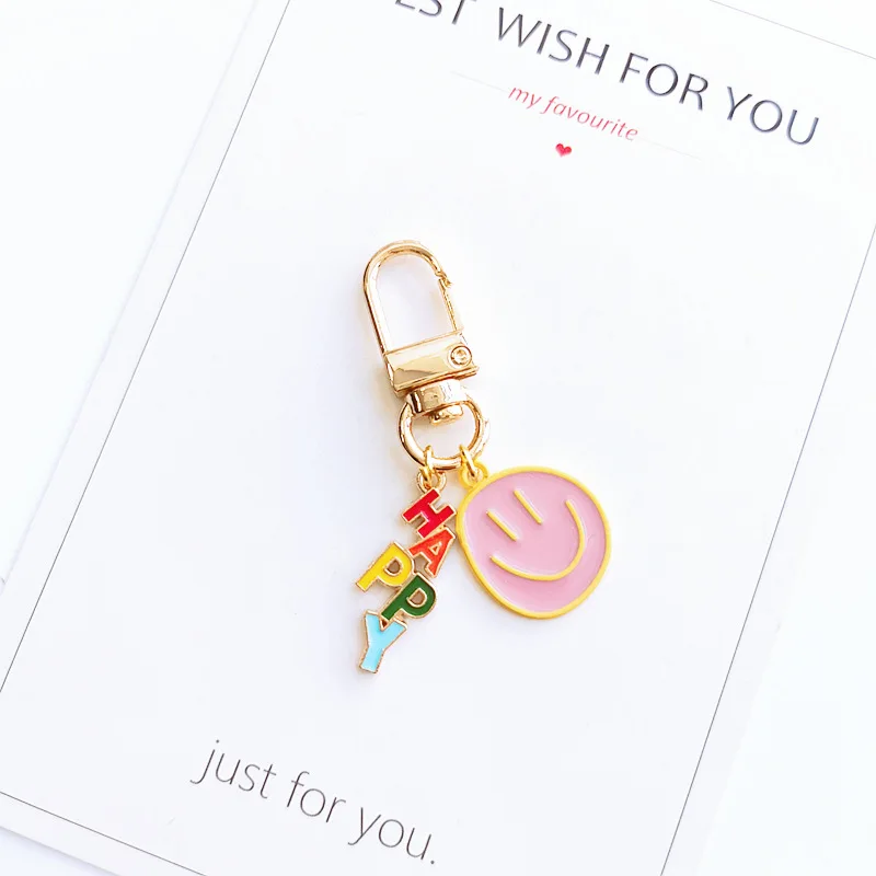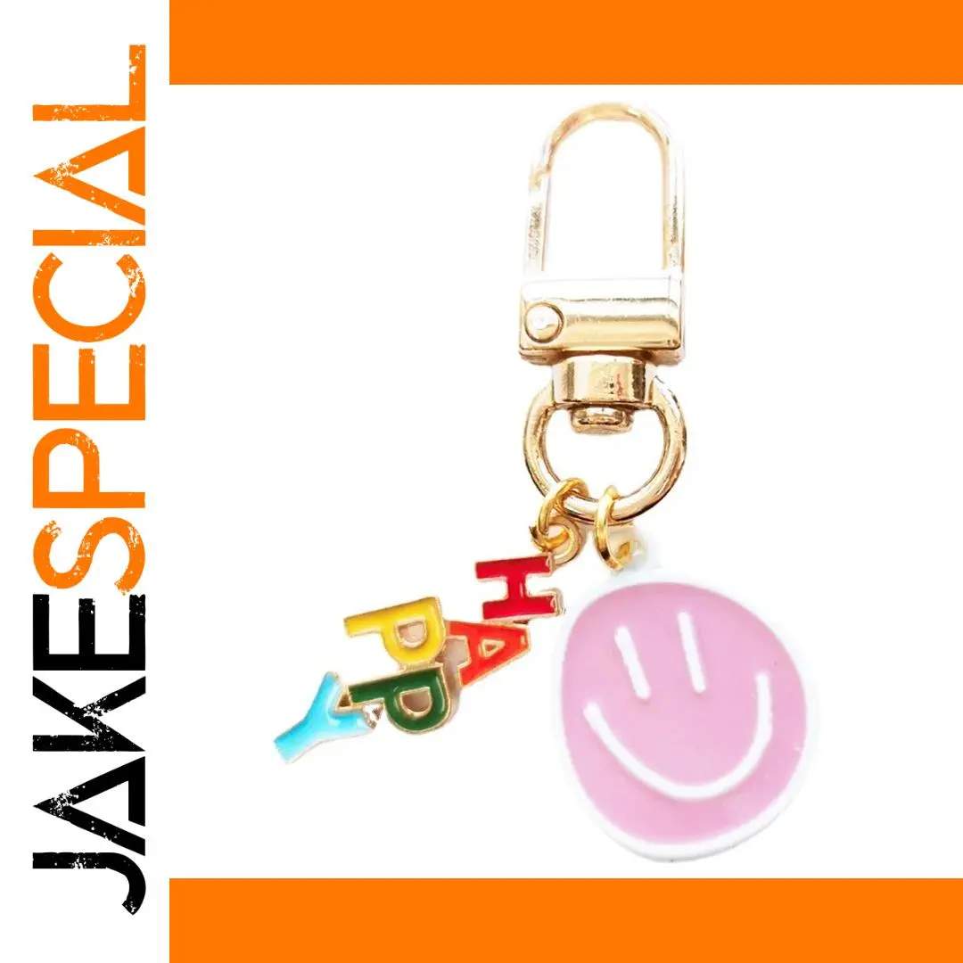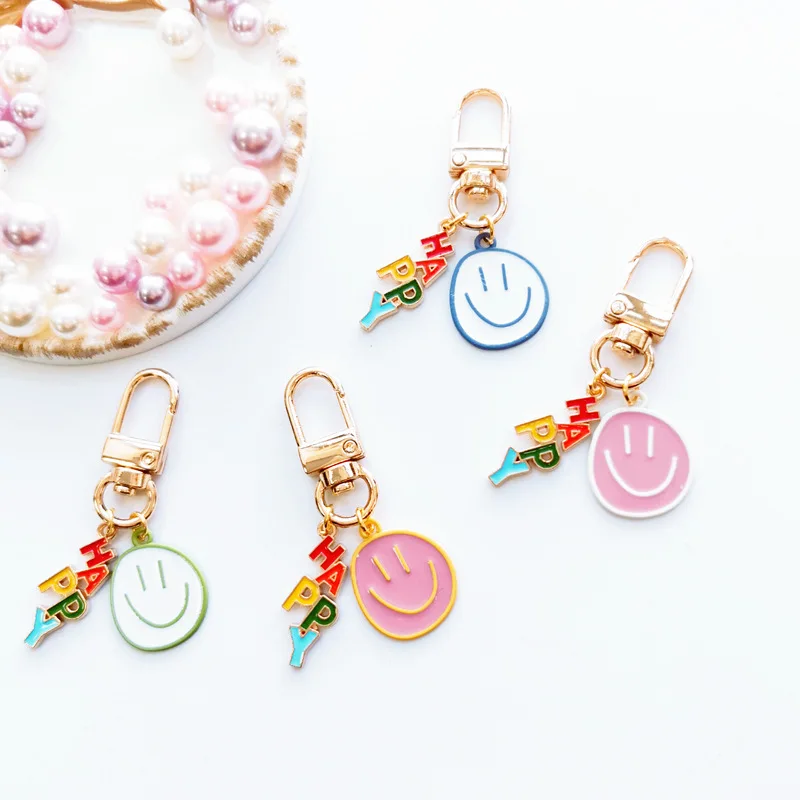 Enhance your accessories with this charming unisex keychain featuring an irregular round smiley face design crafted from zinc alloy with a gold-colored finish. Measuring approximately [dimensions], it showcases a playful, cute, and romantic style, ideal for decorating bags, AirPods cases, cars, phones, or jewelry. The keychain uses a sturdy combination buckle for easy attachment and is available in four vibrant color options: pink white, pink yellow, green white, and blue white. Its cheerful design, simple white facial features, and lively colors are perfect for expressing your joyful personality and adding a fun touch to everyday items.