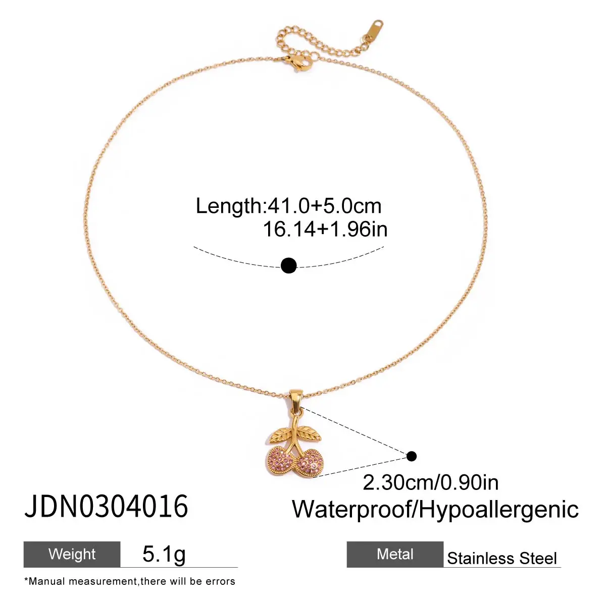 Imagine yourself wearing this charming cherry-shaped pendant necklace, adding a playful yet elegant touch to any outfit. The delicate gold-toned stainless steel chain features a refined oval-link design that seamlessly combines durability with style, making it perfect for daily wear or special occasions. The pendant itself measures approximately 2.3 centimeters and is meticulously crafted to resemble a pair of cherries. Adorned with tiny, sparkling pink zirconia stones, it offers a vibrant splash of color and shimmering brilliance. The finely detailed slender stems and small leaves, with subtle veining, enhance the whimsical, feminine appeal. Crafted from waterproof stainless steel, this necklace guarantees lasting beauty and resilience against moisture, making it a versatile accessory you can rely on for years to come. Its blend of classic elegance and modern playfulness makes it a must-have for your jewelry collection.