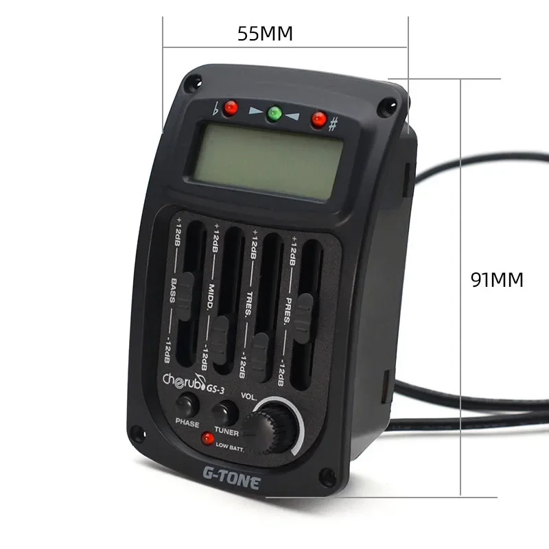 Experience professional-quality sound with this Cherub GS-3 acoustic guitar preamp. Featuring a sleek black finish and compact design, it seamlessly combines modern aesthetics with functionality. The 4-band equalizer (bass, mid, treble, presence) allows you to craft your perfect tone, whether you're performing live or practicing. The built-in LCD tuner ensures accurate tuning, saving you time and hassle. Easy to operate, it includes a volume control, phase switch, and robust piezo pickup interface. Weighing only 150 grams and constructed from lightweight plastic, this preamp offers portability without sacrificing performance. It’s a reliable, versatile addition to any acoustic guitar setup, helping you achieve studio-quality sound on the go.