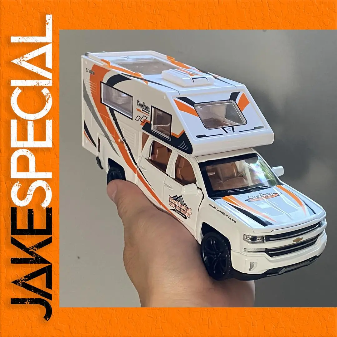 Immerse yourself in the craftsmanship of this stunning 1/32 scale Chevrolet Blazer Chalet RV model. Crafted from high-quality metal, it boasts a sleek white body enhanced by bold orange and black decals that give it a vibrant, sporty appeal. Horizontal stripe decals along the side panels add authenticity and dynamic visual interest. The front grille mimics chrome, complemented by clear plastic headlights that add realism. The transparent, lightly tinted windows reveal a warm brown interior, inviting you to imagine the adventure inside. The rooftop camper is meticulously designed with molded windows, vents, outdoor accessories, and detailed features, emphasizing outdoor exploration. With functional sound and lighting features powered by batteries, this model offers interactive fun for collectors who value detail, quality, and an authentic outdoor vibe.