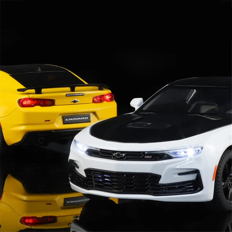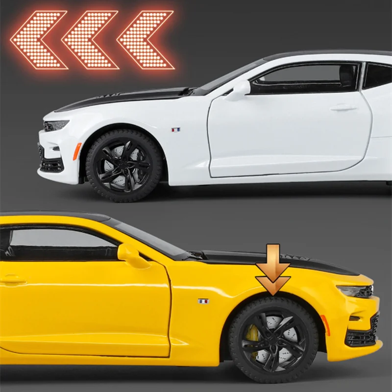 Experience the thrill of the Chevrolet Camaro SS 1LE with this detailed 1:24 scale diecast model, crafted from alloy and plastic in vibrant yellow or white. Featuring a sleek aerodynamic design with smooth curves, sharp lines, and a performance-inspired aesthetic, this collectible replica includes realistic details such as a centered grille badge, slim headlights, sculpted door panels, five-spoke black wheels with textured tires, and a subtle rear spoiler. Equipped with simulation sound and light systems, it offers an interactive display for collectors and enthusiasts aged 14 and up. Perfect for showcasing your passion for sports cars and adding a dynamic touch to your collection.