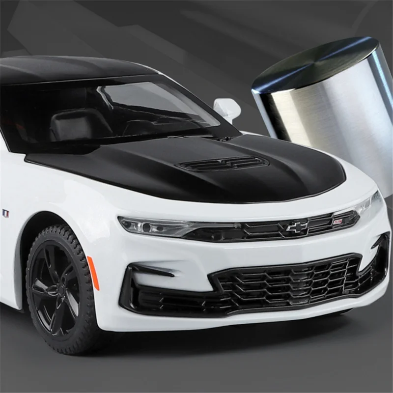 Immerse yourself in the thrill of high-performance design with this detailed 1:24 scale diecast alloy and plastic model of the Chevrolet Camaro SS 1LE. Perfect for display or play, this model captures the modern, sporty stance and aggressive aesthetic of the real vehicle, featuring a sleek white body accented by a contrasting black hood, roof, and rear spoiler. The subtle hood vent, sharp contour lines, and aerodynamic details showcase meticulous craftsmanship. Enhanced with sound and light functions, it brings your collection to life and makes an eye-catching centerpiece. Suitable for enthusiasts aged 14 and older, this model offers a blend of realism and fun, elevating your automotive collection with its high-quality finish and precise detailing.