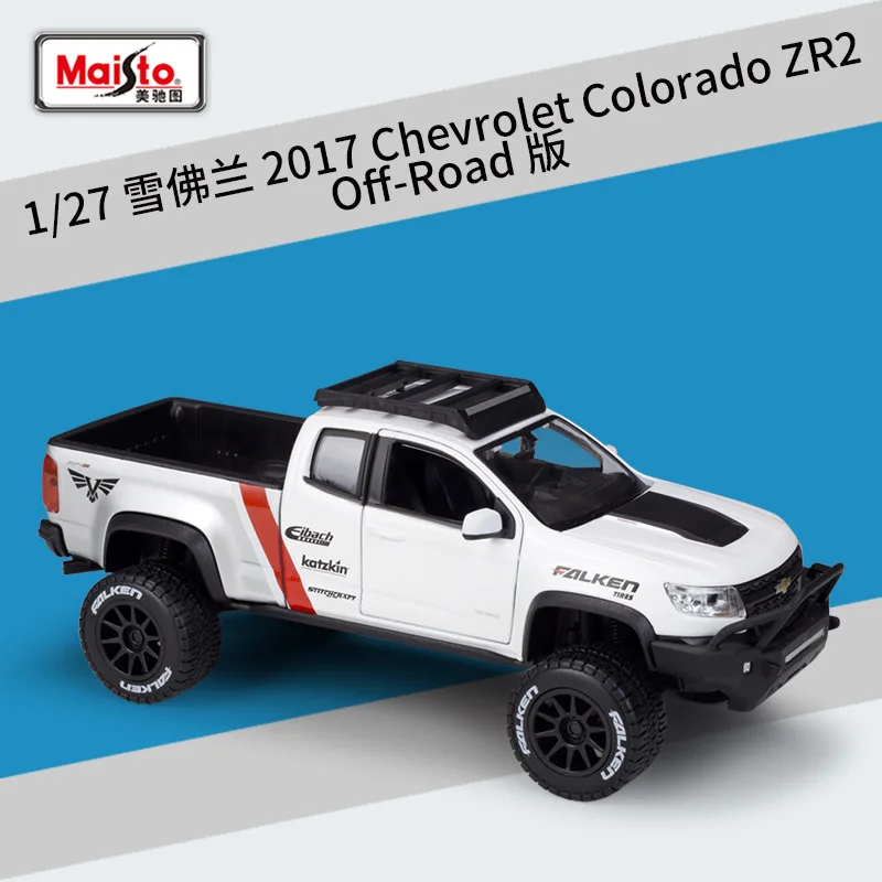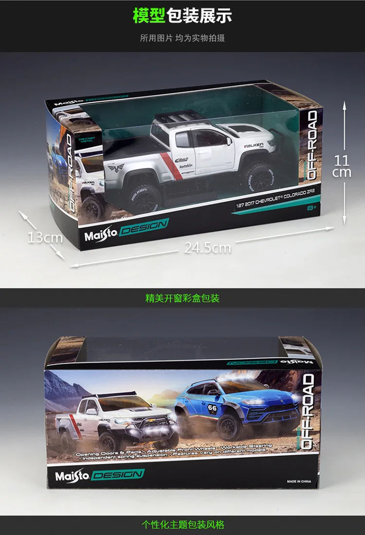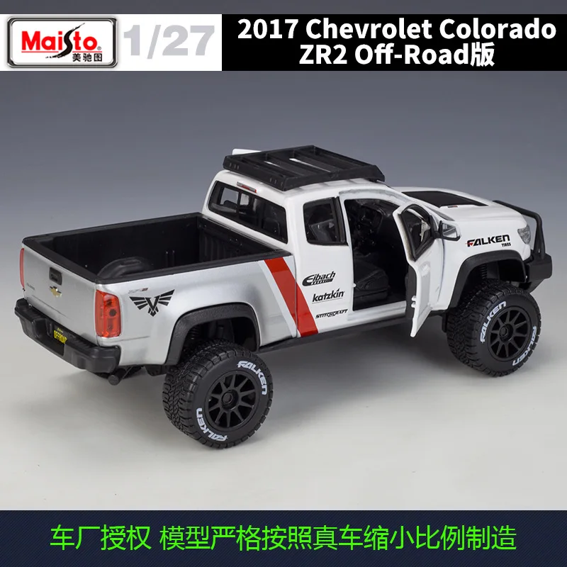 This detailed die-cast metal model captures the rugged essence of the Chevrolet Colorado ZR2 pickup truck at a 1:27 scale, measuring approximately 21.2cm in length, 9.3cm in width, and 8.2cm in height. Crafted with a combination of metal and plastic parts, it features functional doors that open and four-wheel free rotation for realistic movement. The design showcases bold black accents on the hood, grille, bumpers, and roof rack, with dynamic red and black graphics, including “FALKEN,” “Eibach,” and “Katzkin” decals. Perfect for adult collectors, this non-electric, battery-free model is compliant with safety standards and makes an impressive addition to any off-road vehicle collection.