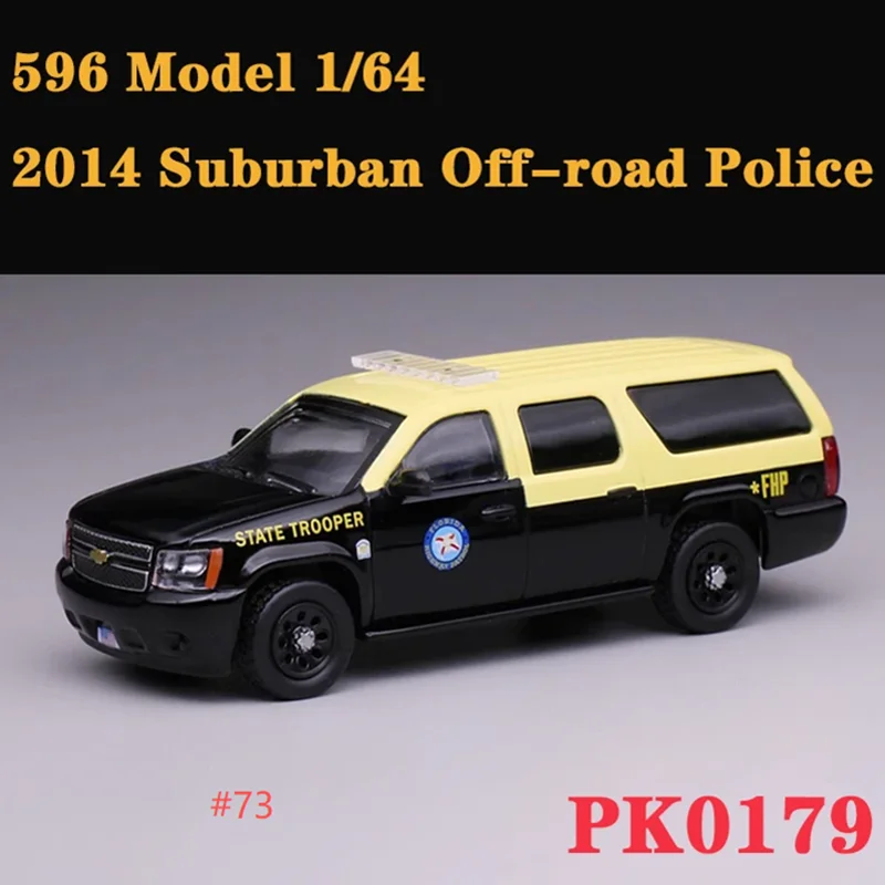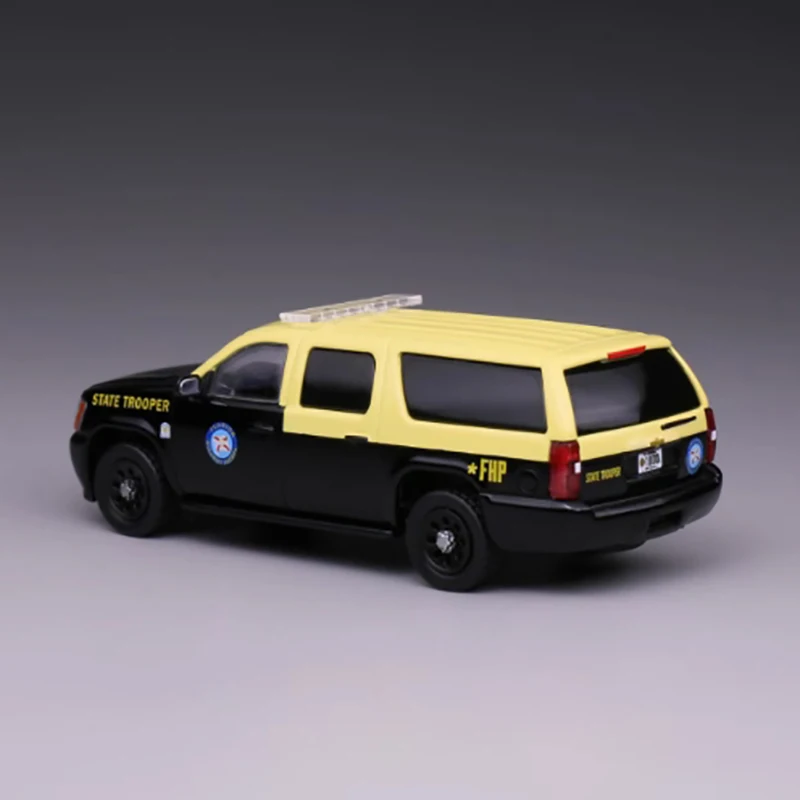 This 1:64 scale diecast metal model features a highly detailed Chevrolet Suburban and Tahoe, showcasing a striking two-tone black and yellow color scheme. With realistic window frames, tinted glass, intricate front grille, and meticulously crafted decals including blue, white, and yellow markings, this collectible captures the commanding presence of an official emergency vehicle. The sturdy black wheels with textured tires, subtle body lines, side mirrors, door handles, and a white roof light bar add to its authenticity. Made from non-toxic metal without chemicals, this highly detailed replica is perfect for adult collectors seeking a realistic and impressive display piece.