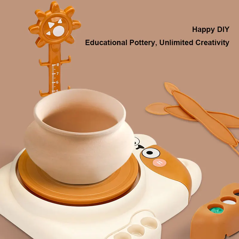 Imagine yourself gifting or purchasing this delightful children's pottery machine set, perfect for fostering imagination and artistic skills in young creators. Crafted from durable ABS material, this set features a charming beige pottery wheel with a smooth, round spinning surface. Its playful white base is decorated with a whimsical cartoon face, expressive eyes, and a cute nose, inviting children into a fun and friendly crafting environment. The set includes two pieces of light brown pottery clay and vibrant paints, inspiring endless projects like Halloween jars, holiday ornaments, and Thanksgiving vases. Bright accents such as an orange gear-shaped measurement ruler add cheerful detail to the overall lively design. Your child will love turning their ideas into reality, making each session both educational and entertaining.