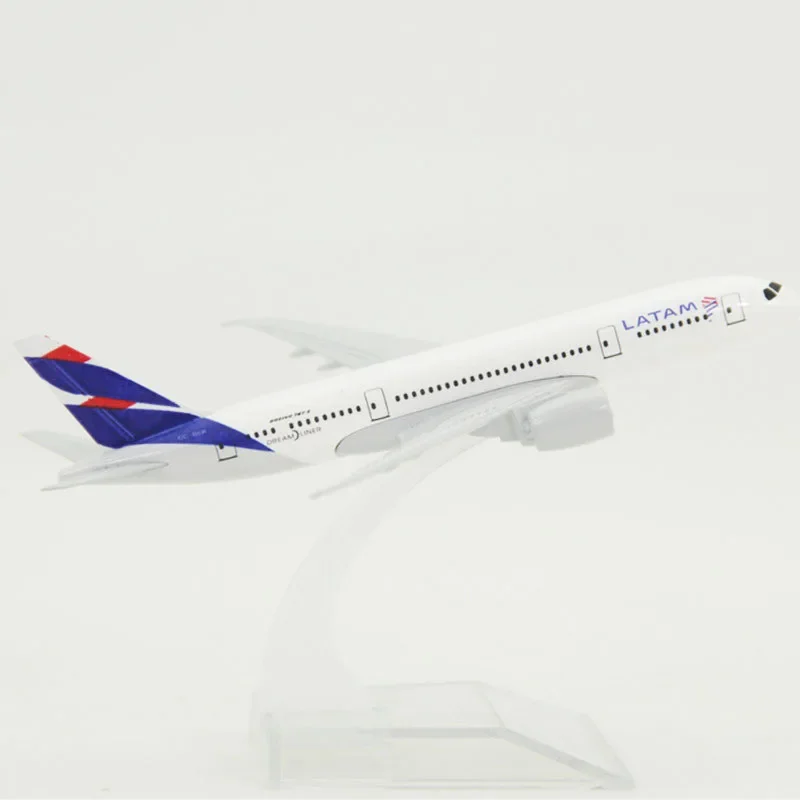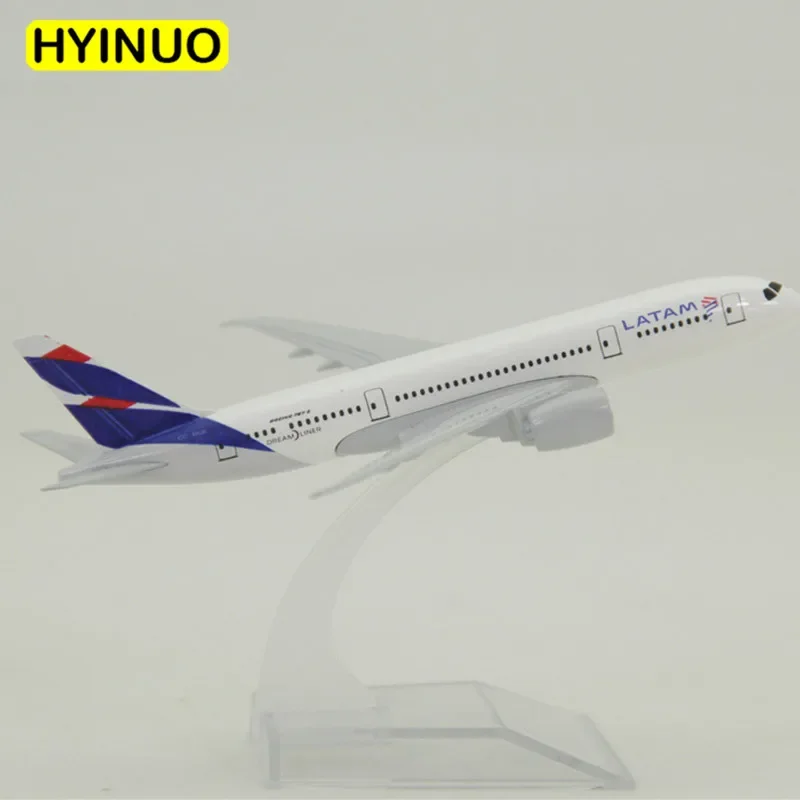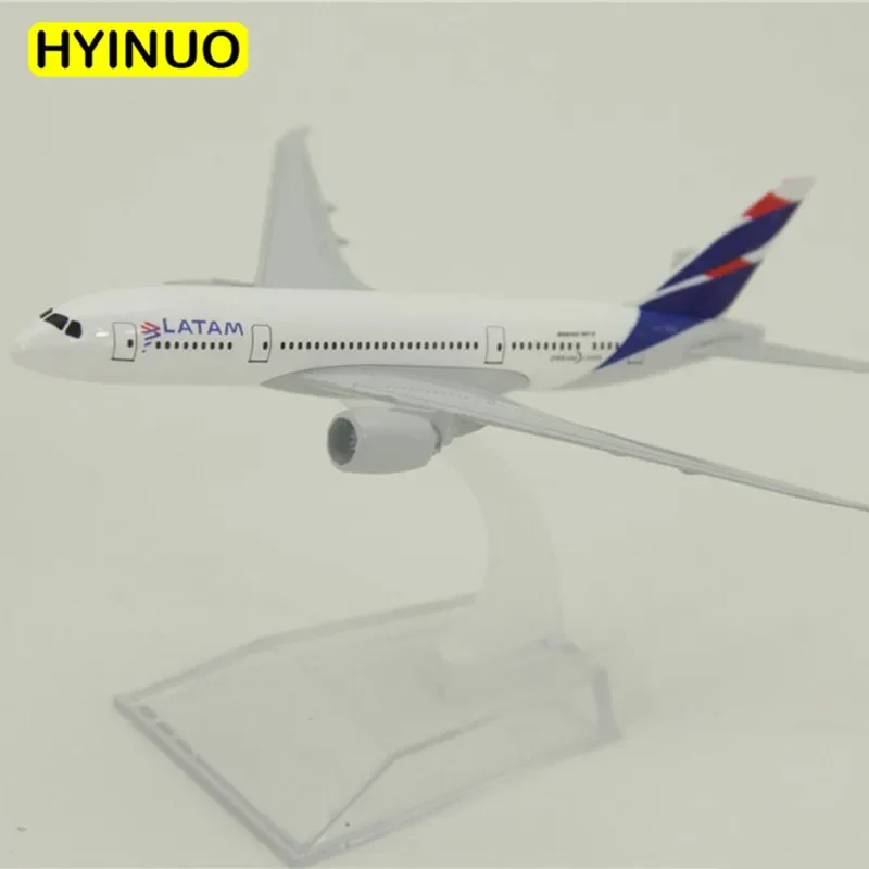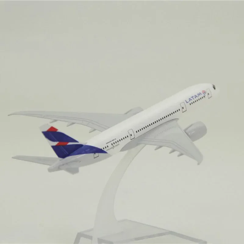 This 1:400 scale diecast model of a Boeing 787 aircraft measures approximately 14.8 cm in length and features a Chile LATAM Airlines livery. Crafted from metal alloy with a sleek, metallic finish, it includes a resin plastic base for display, showcasing realistic windows, doors, and smooth, aerodynamic wings with matching winglets. The model highlights the distinctive dark blue tail fin with red and purple accents, capturing the modern, polished look of the original aircraft. Designed as a collectible display piece, it is non-electric, free from batteries and chemicals, and suitable for collectors aged 14 and above.